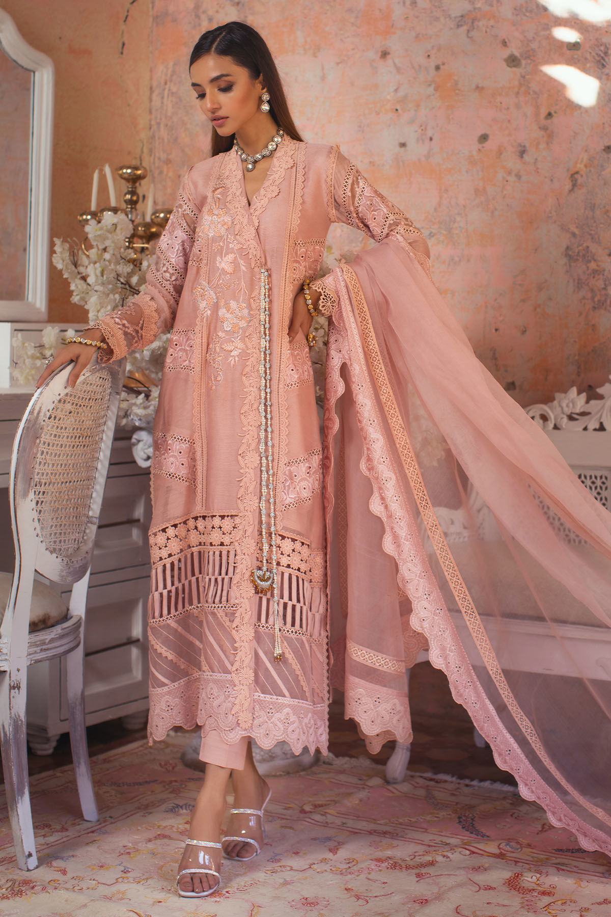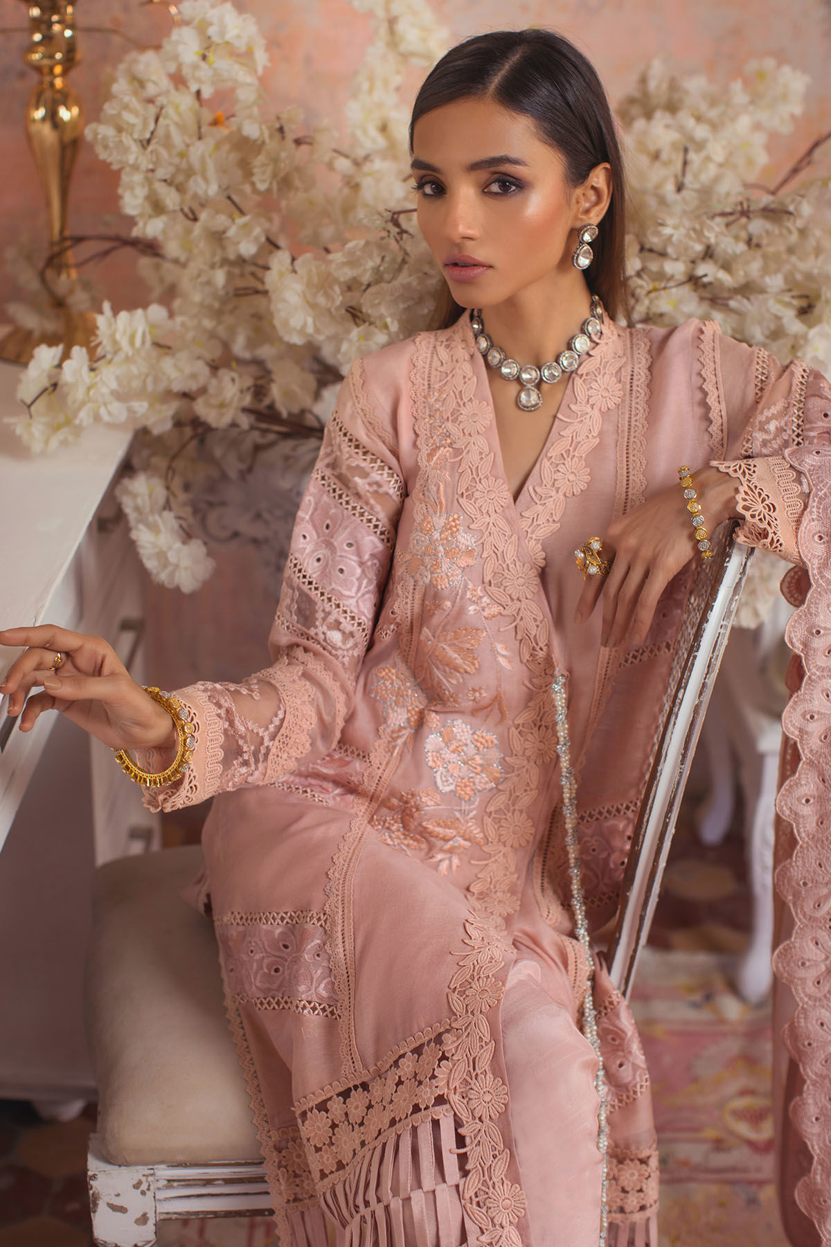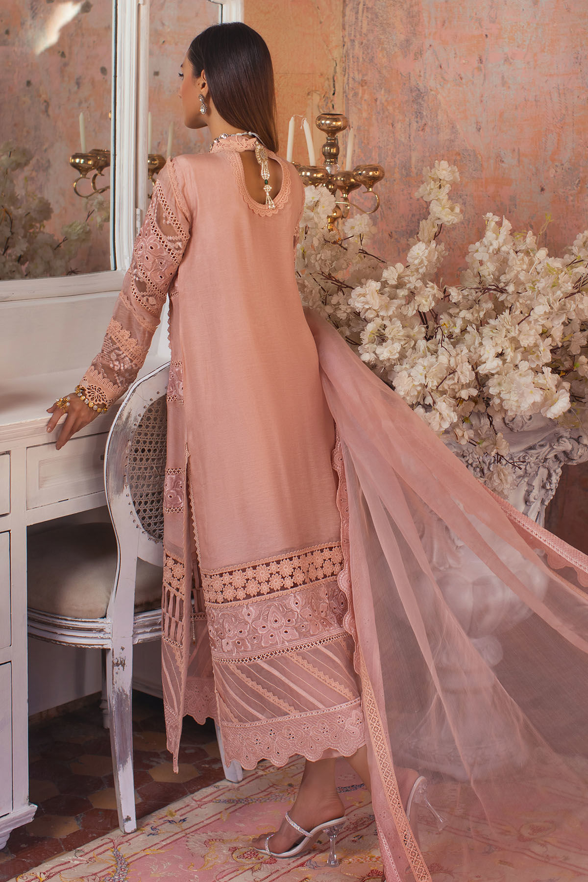 Long silhouette angharka in pure silk net featuring an array of details on pretty blush canvas, the angharka is adorned with silk thread embroidered details which are further enhanced with crochet laces, fabric manipulation and schiffli borders, the centre front is adorned with handcrafted tassels. The keyhole on centre back is adorned with dangling handmade tassel. The outfit can be paired with pure organza dupatta featuring schiffli and lace borders and straight raw silk pants for the perfect look.