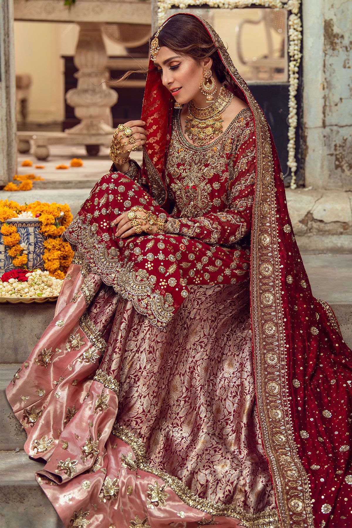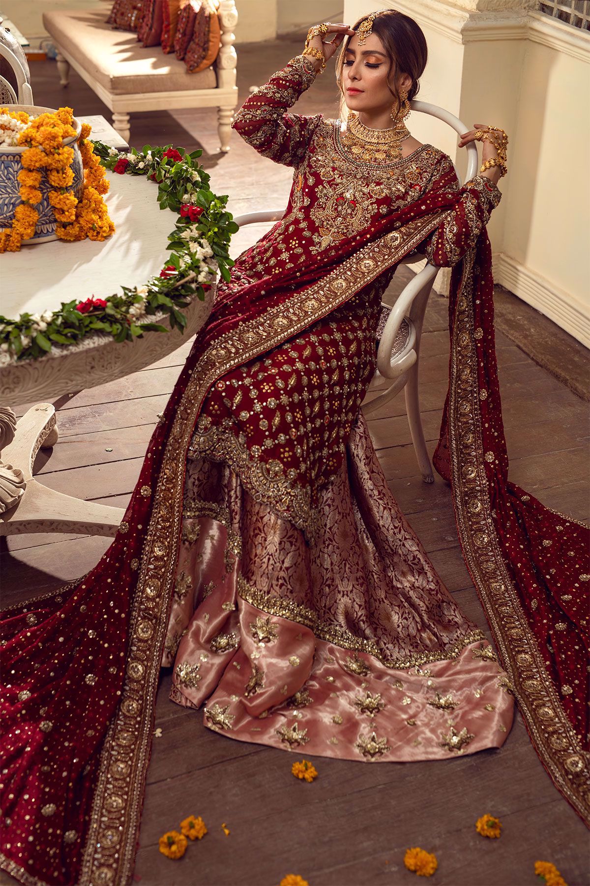 In an elegant ode to old school craft, pure silk net shirt in deep maroon with antique dabka details further adorned with kaamdani and silk thread knots. The shirt is layered over a stunning farshi gharara of damask and shimmering Lamé which is enhanced with intricate hand embroidered motifs. The shirt is paired with a long dupatta featuring heavily handcrafted borders with kaamdani and sequins details