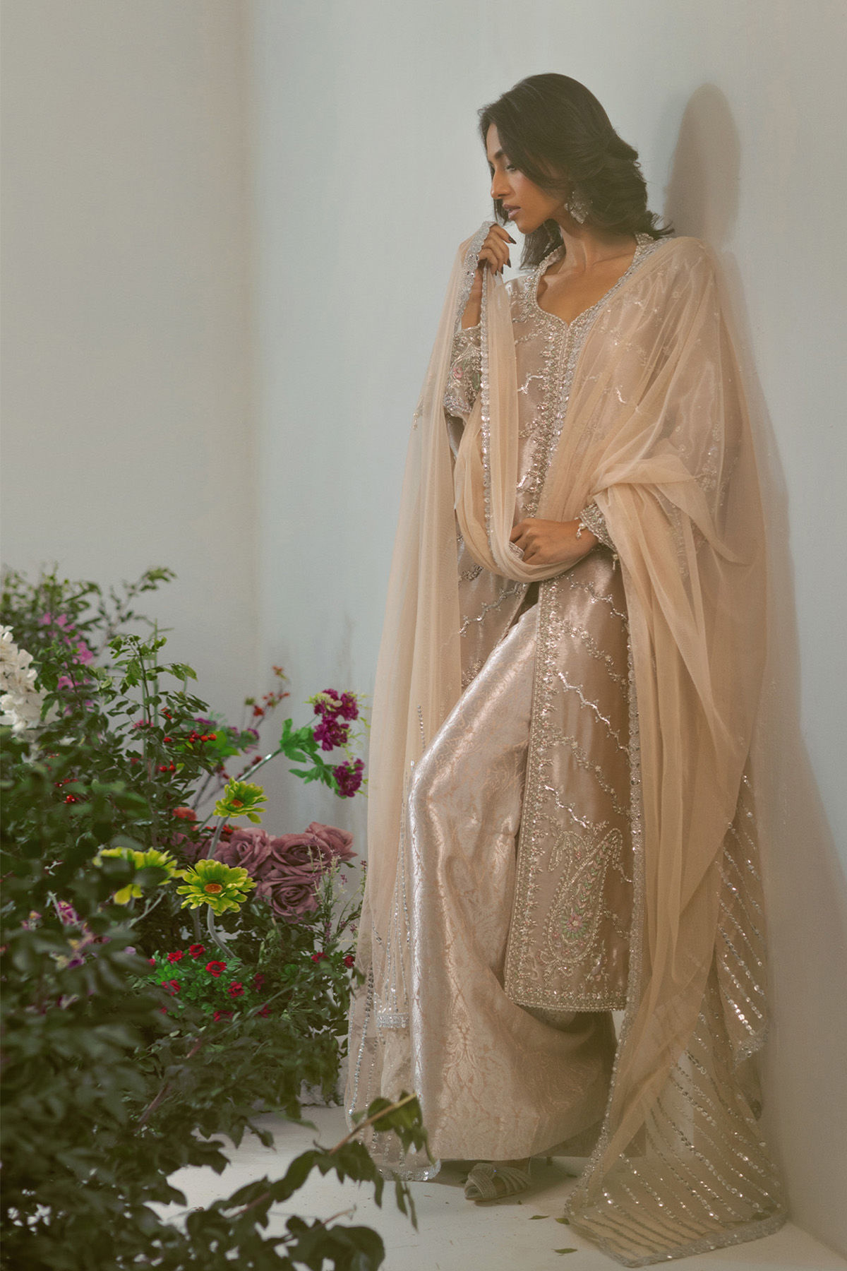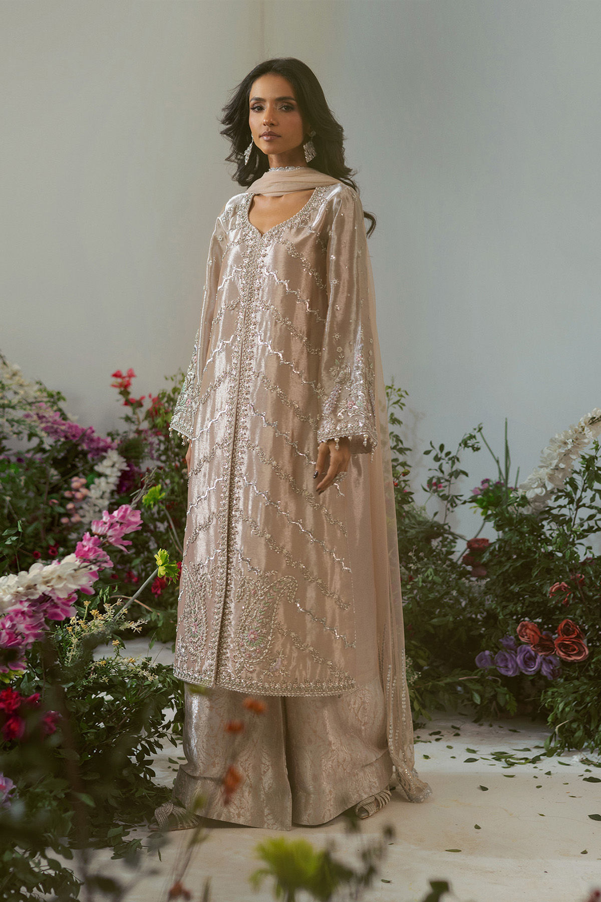 A beautiful front open jacket in a soft salmon rose color shines on a delicate lamé canvas, adorned with intricate silver zardozi details. The center front is decorated with elegant paisley motifs, highlighted with subtle resham accents. Paired with flowing damask pants and a net dupatta, each pallu shimmering with sparkling sequin details.