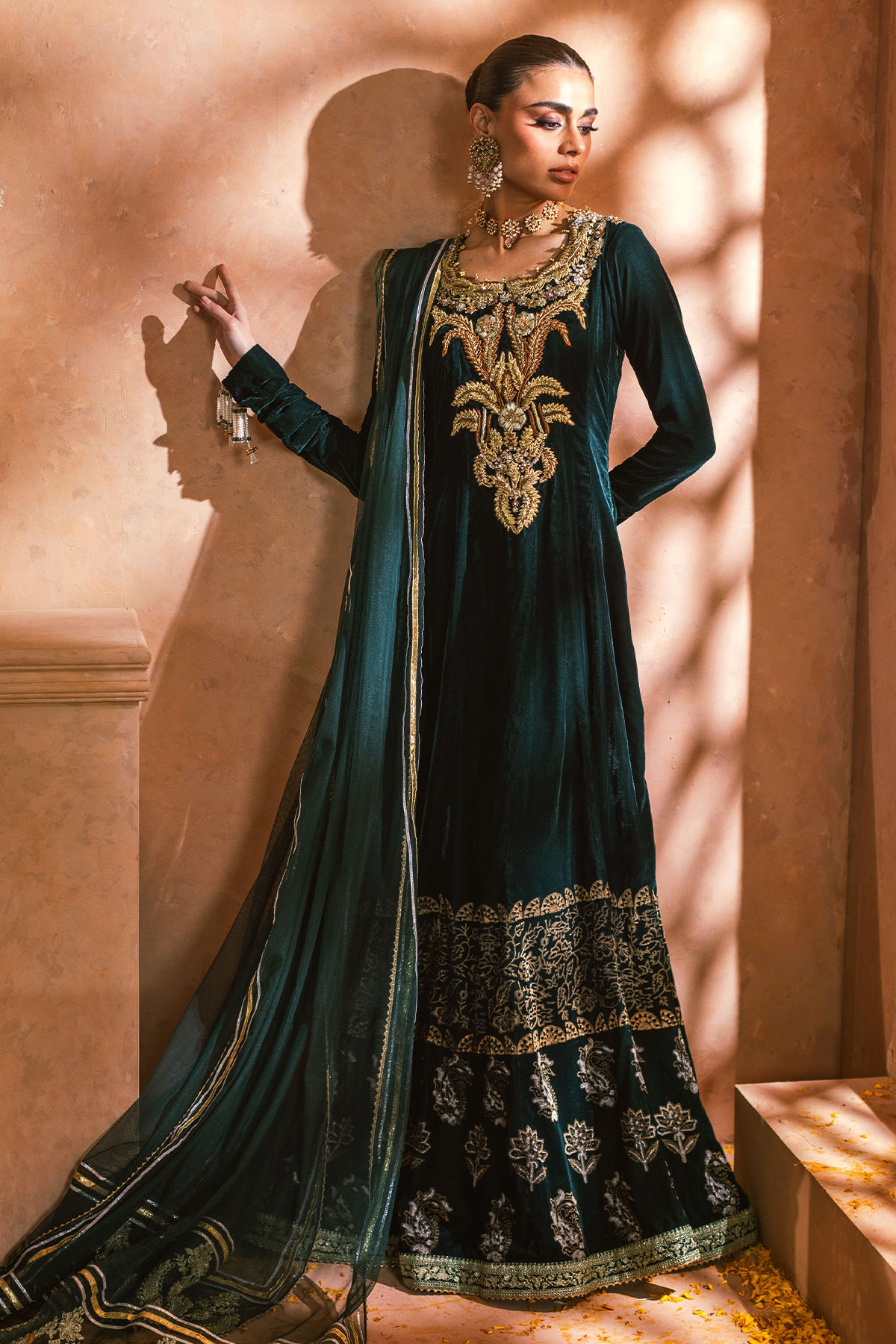 A floor-length kalidar in a deep emerald hue, crafted from luxurious velvet fabric, adorned with intricate antique and gold handcrafted zardozi embellishments. The hemline is accentuated with exquisite hand block printed details and a zari embroidered border. The gathered sleeves are elegantly enhanced with handcrafted tassels. This kalidar is accompanied by matching straight pants and a net dupatta, which features delicate gota accents and gold embroidered zari motifs on each pallu.