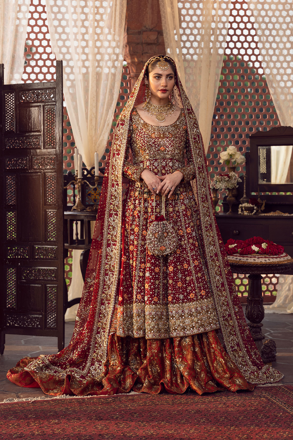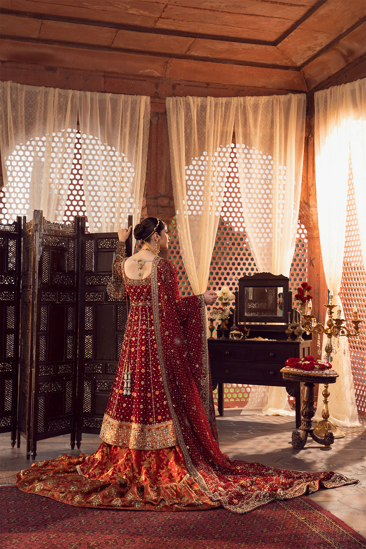 Gorgeous kalidar in deep crimson on silk net featuring dainty zardozi details enhanced with silk thread rosettes in peach shade. The kalidar is paired with farshi lehnga featuring zardozi embroidered details on hem. The kalidar is paired with net dupatta featuring heavy zardozi borders, zardozi jaal on pallu and sequins spray.