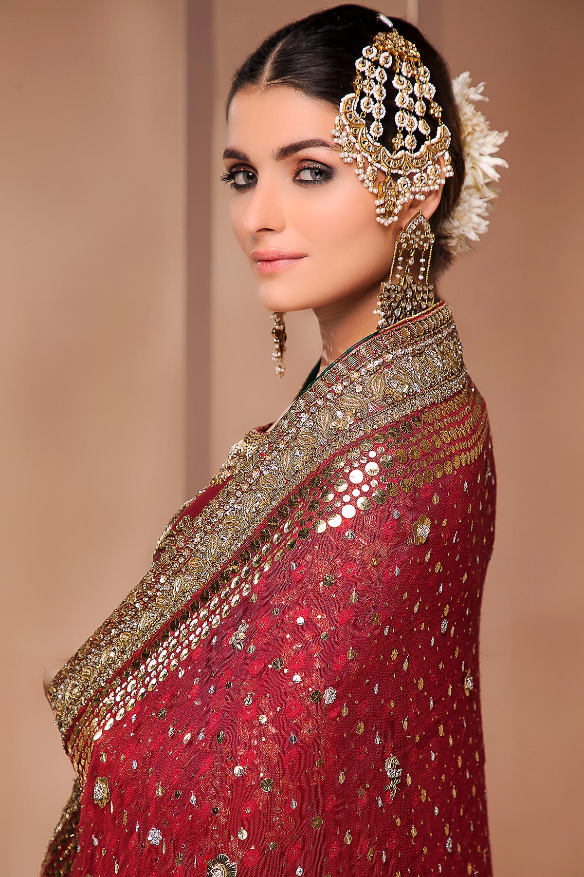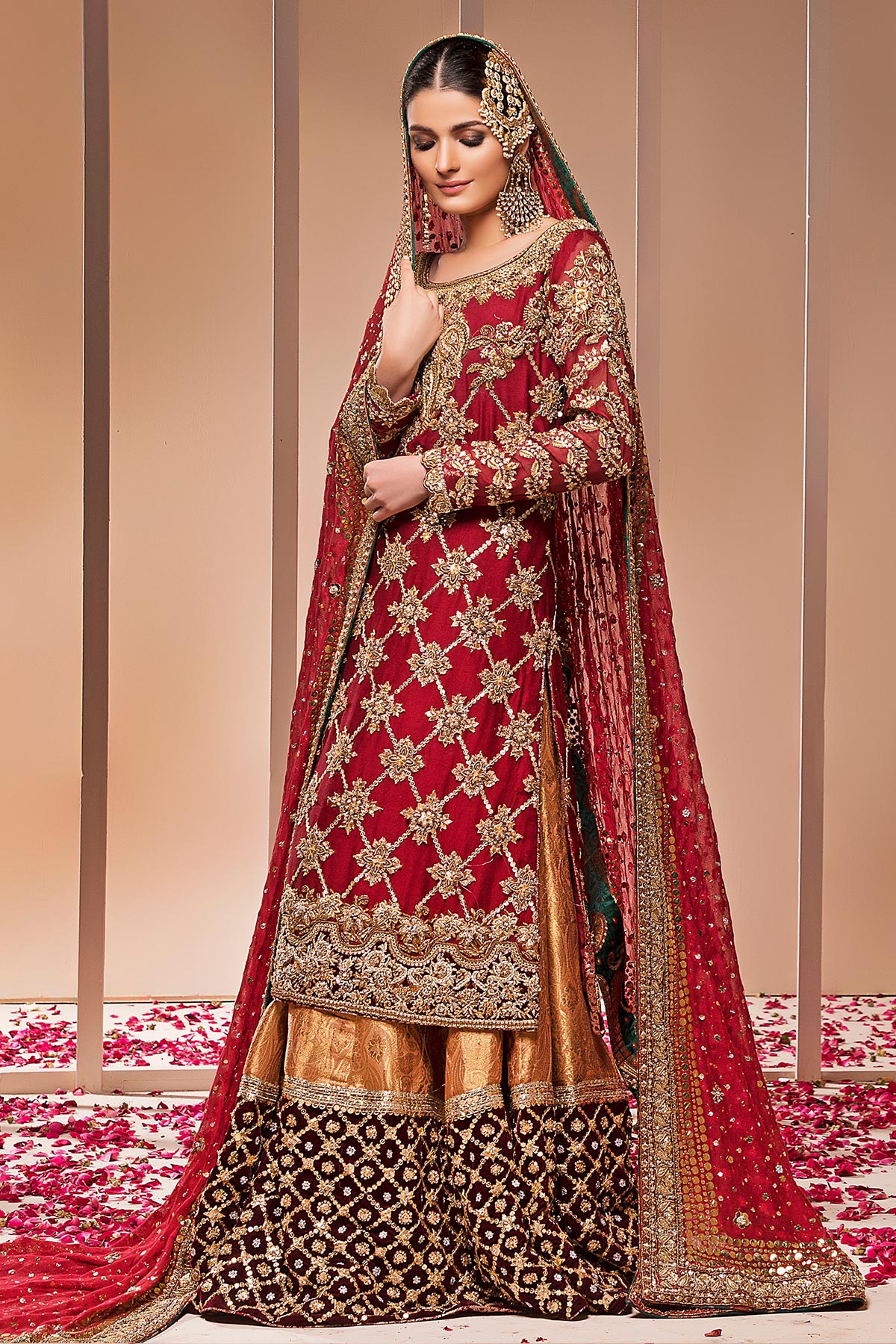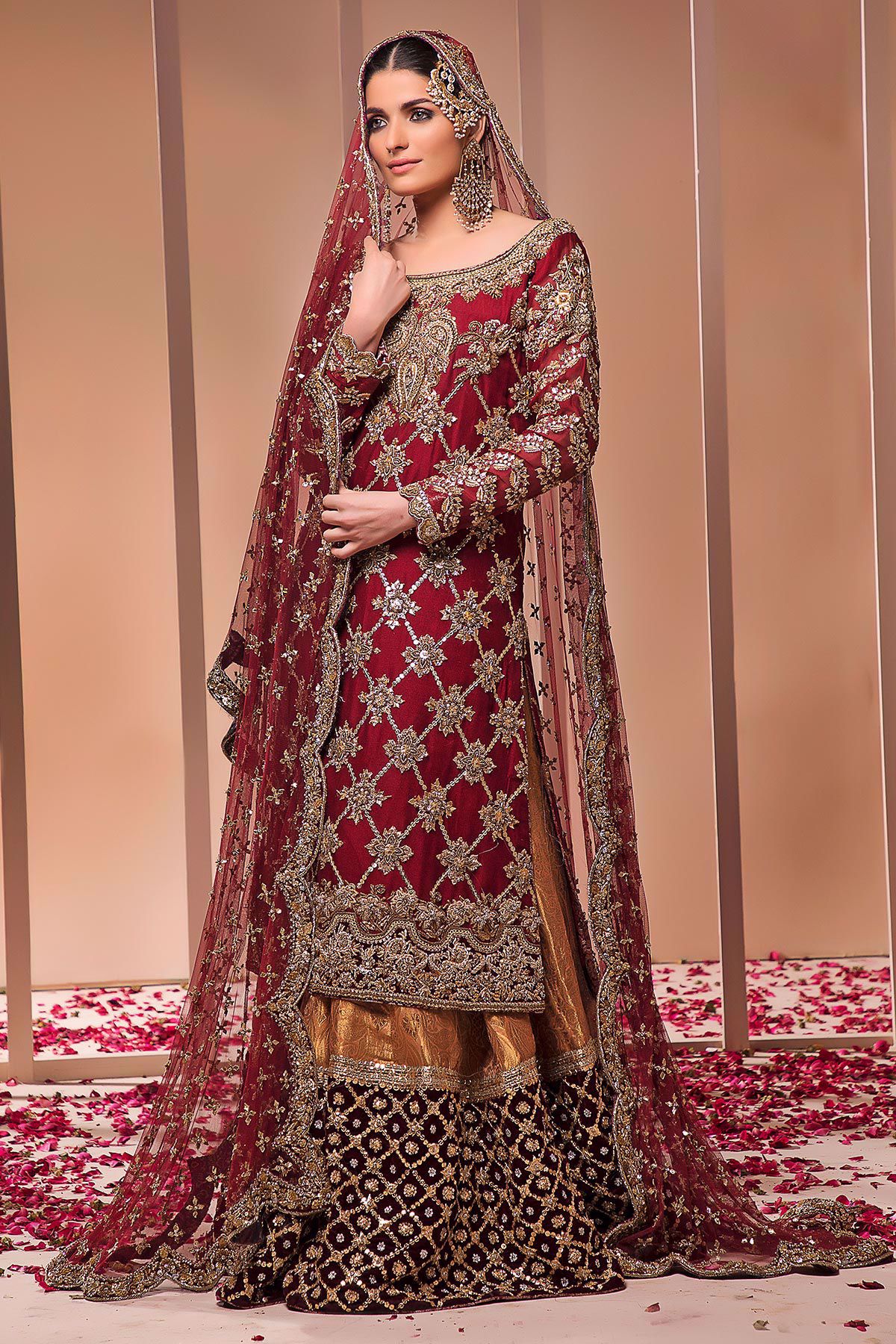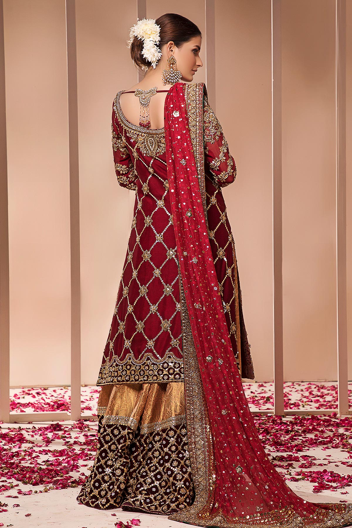 Red A-line shirt with antique gold and copper embroidery is paired with deep maroon raw silk dhaka pajama incorporated with velvet which is enhanced with gota embroidery. The dull gold net dupatta with velvet scallops along with antique zardozi embroidery further enhances this stunning ensemble.
