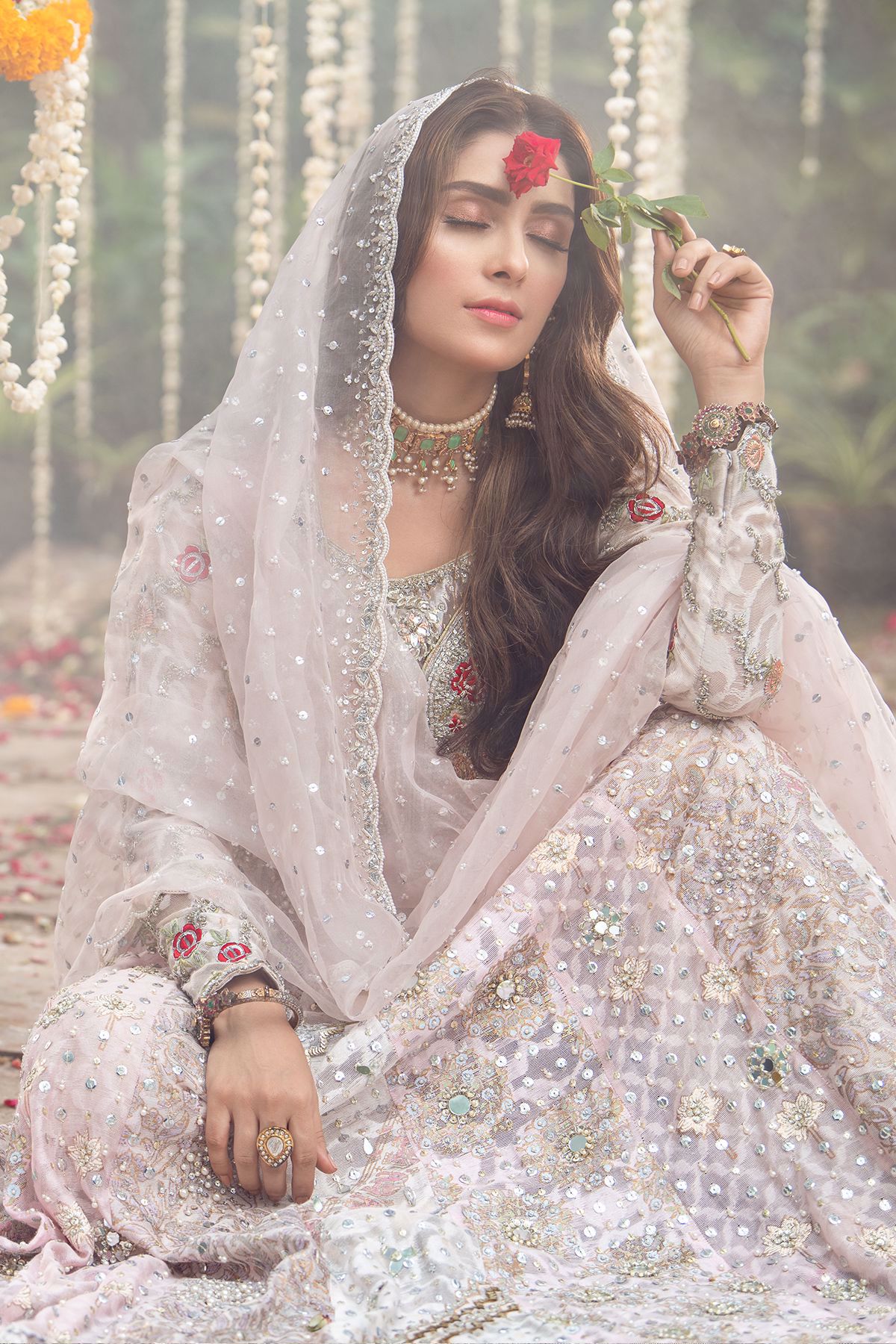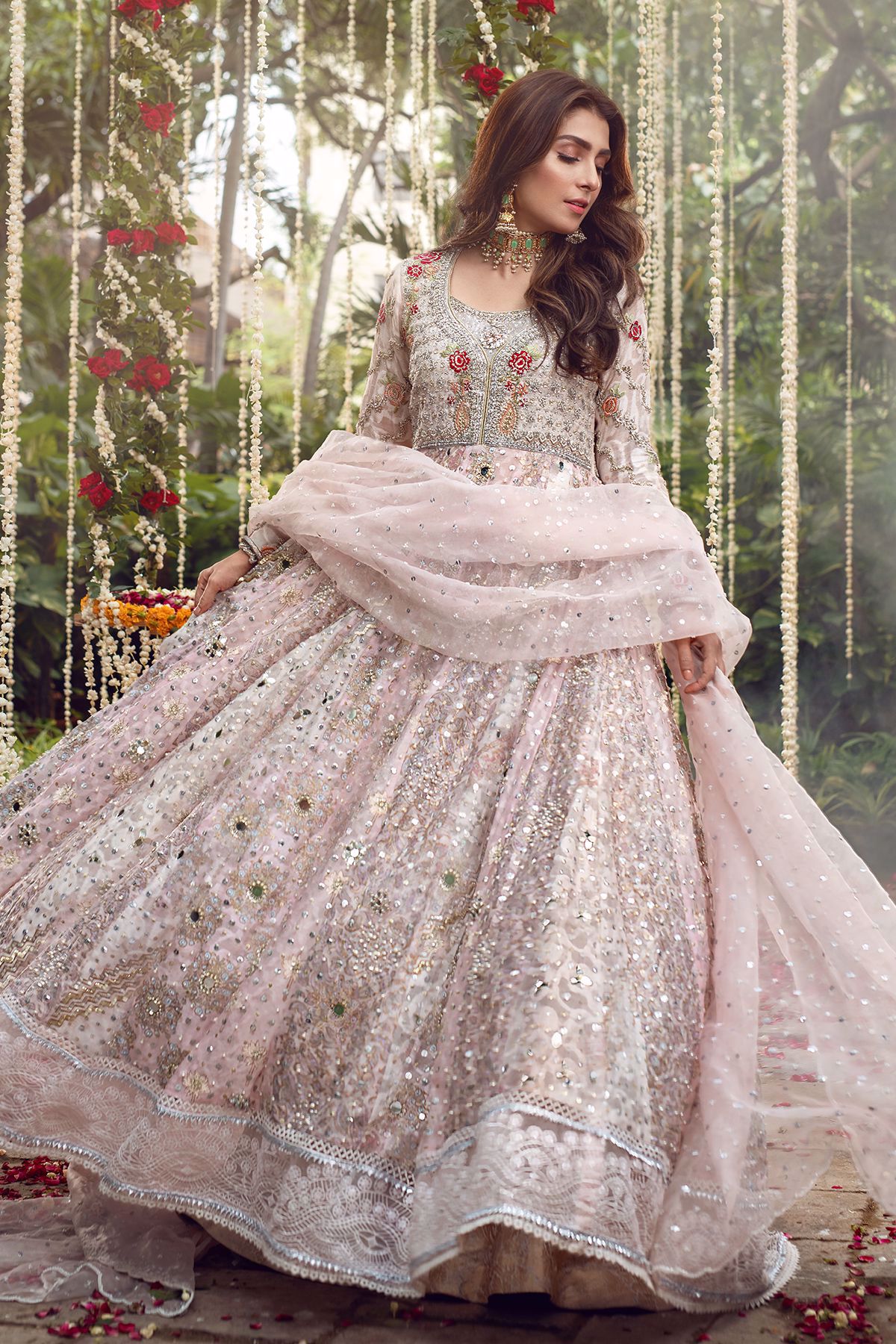 A bold and regal ensemble; inspired by dewdrops, a paneled kalidar in different shades of blush pinks incorporated with hand block printed details which are further enhanced with sequins, pearls and light catching mirrors merged together to create this shimmering labor of love. The bodice is adorned with intricate handwork of dabka and silk thread rosettes in fuchsia and peach. This stunning pishwas is layered over a gorgeous damask dhaka and worn with an embellished organza scallop dupatta with pearls and dabka details, this head turning kalidar makes an opulent statement.