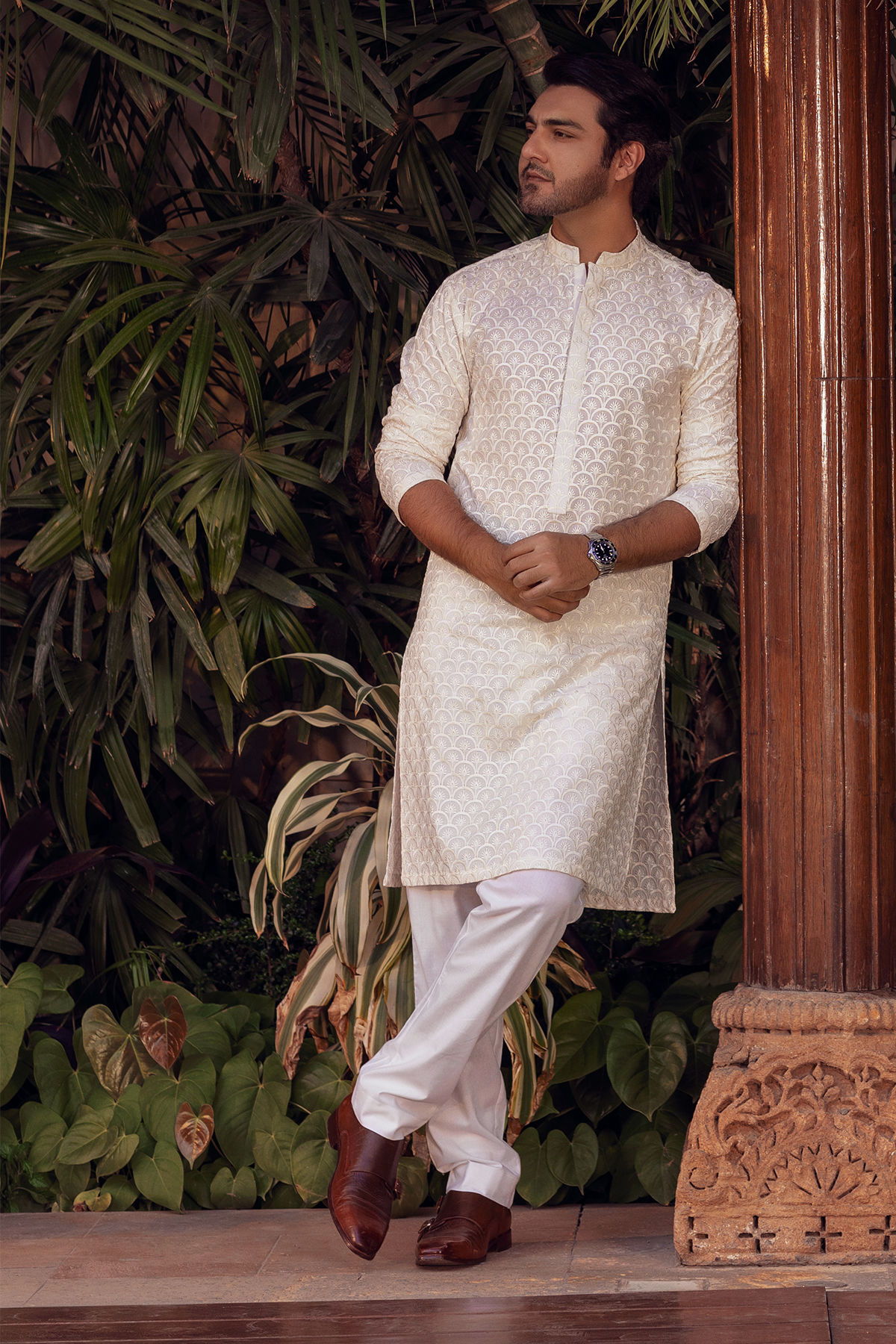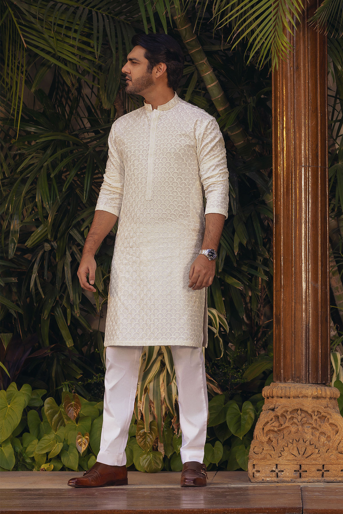 Self-embroidered kurta crafted from raw silk, showcasing harmonious tone-on-tone geometric and floral patterns. The neckline is elegantly accentuated with a placket, and the ensemble is complemented by straight white pants, completing the overall look.
