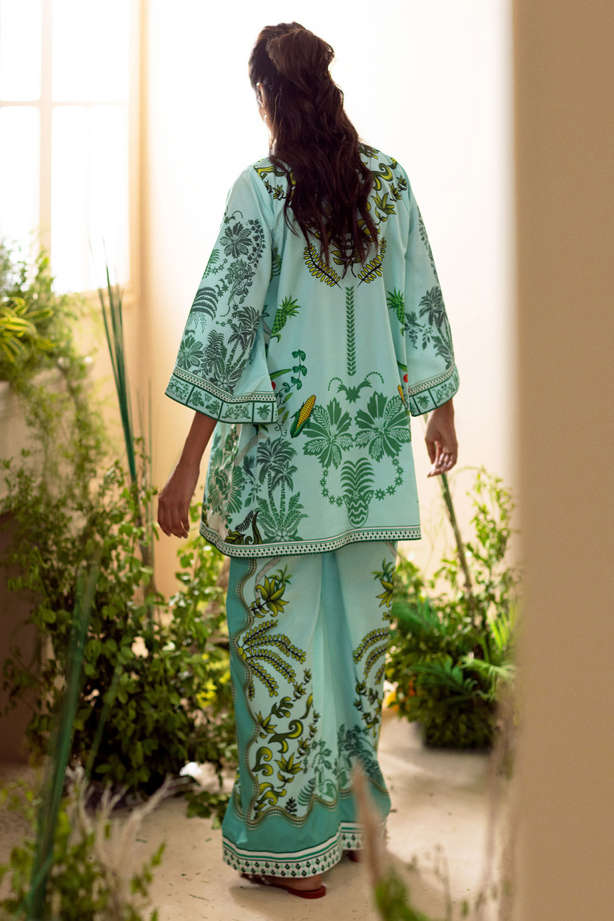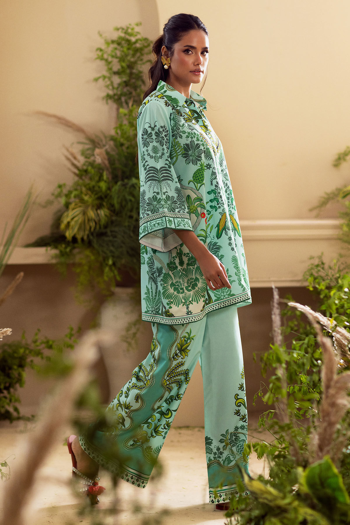 Co-ordinating set crafted from crepe silk, adorned with whimsical floral printed details. This ensemble includes a knee-length shirt characterized by a loose silhouette, embellished with floral and fauna printed accents. The shirt is elegantly paired with loose-fitting coordinating trousers.