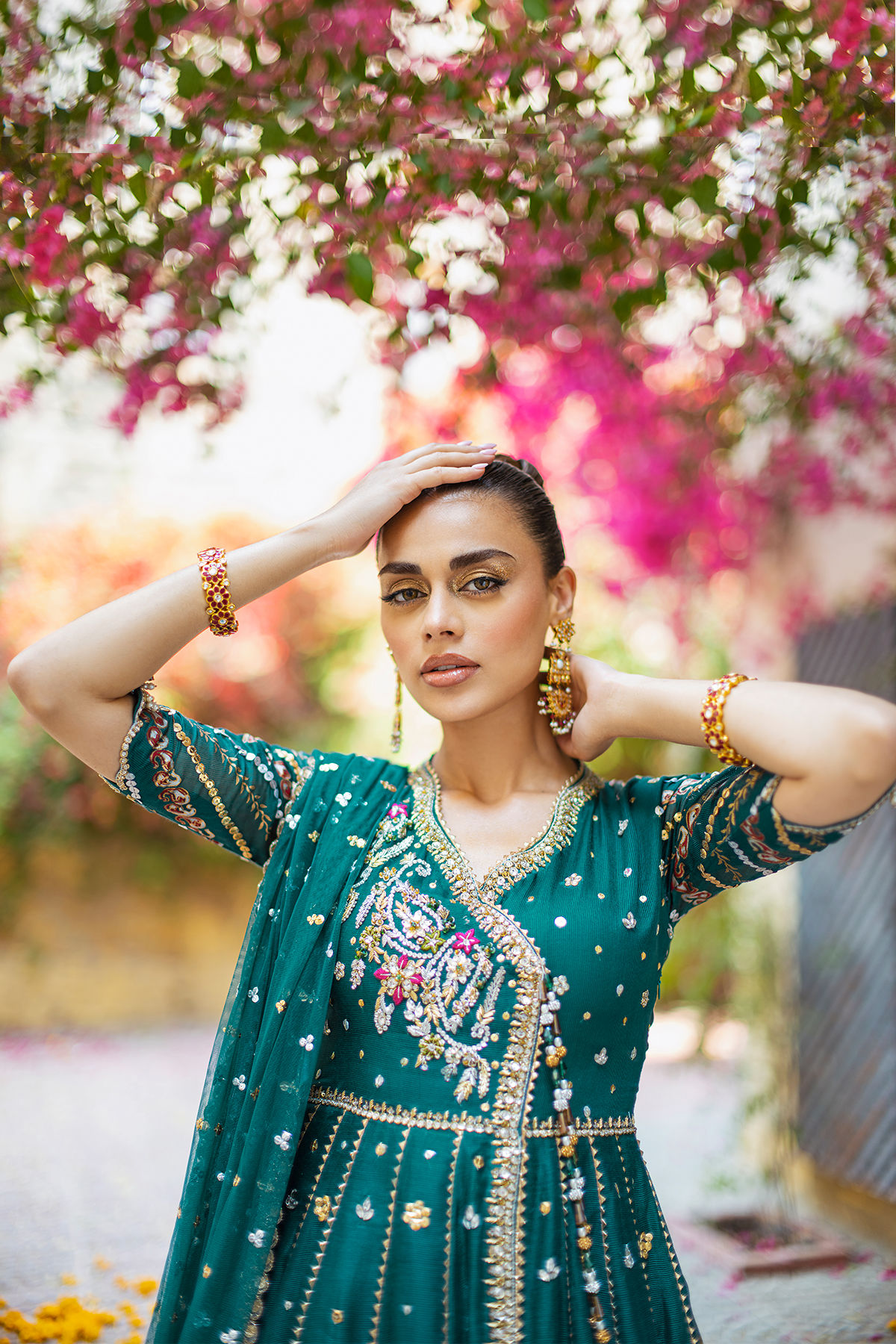 Long silhouette kalidar featuring subtle silk thread and zardozi floral details on bodice. The subtle panels on pure zari in shades of mint and peaches are enhanced with hand block printed details. The hand block printed canvas is further adorned with sequins spray and the hemline is adorned with gota details. The kalidar can be paired with gold damask dhaka and hand block printed organza dupatta in mint shade featuring sequins details.