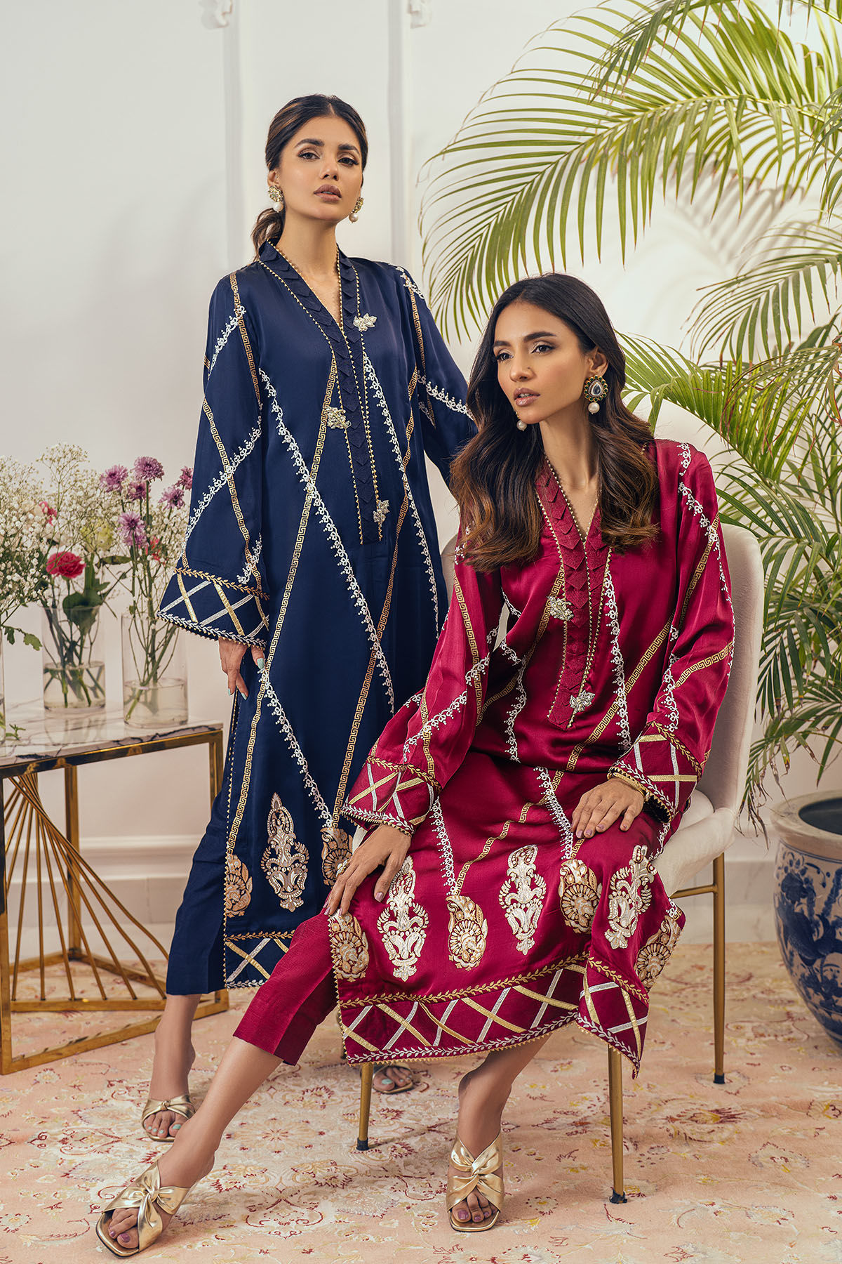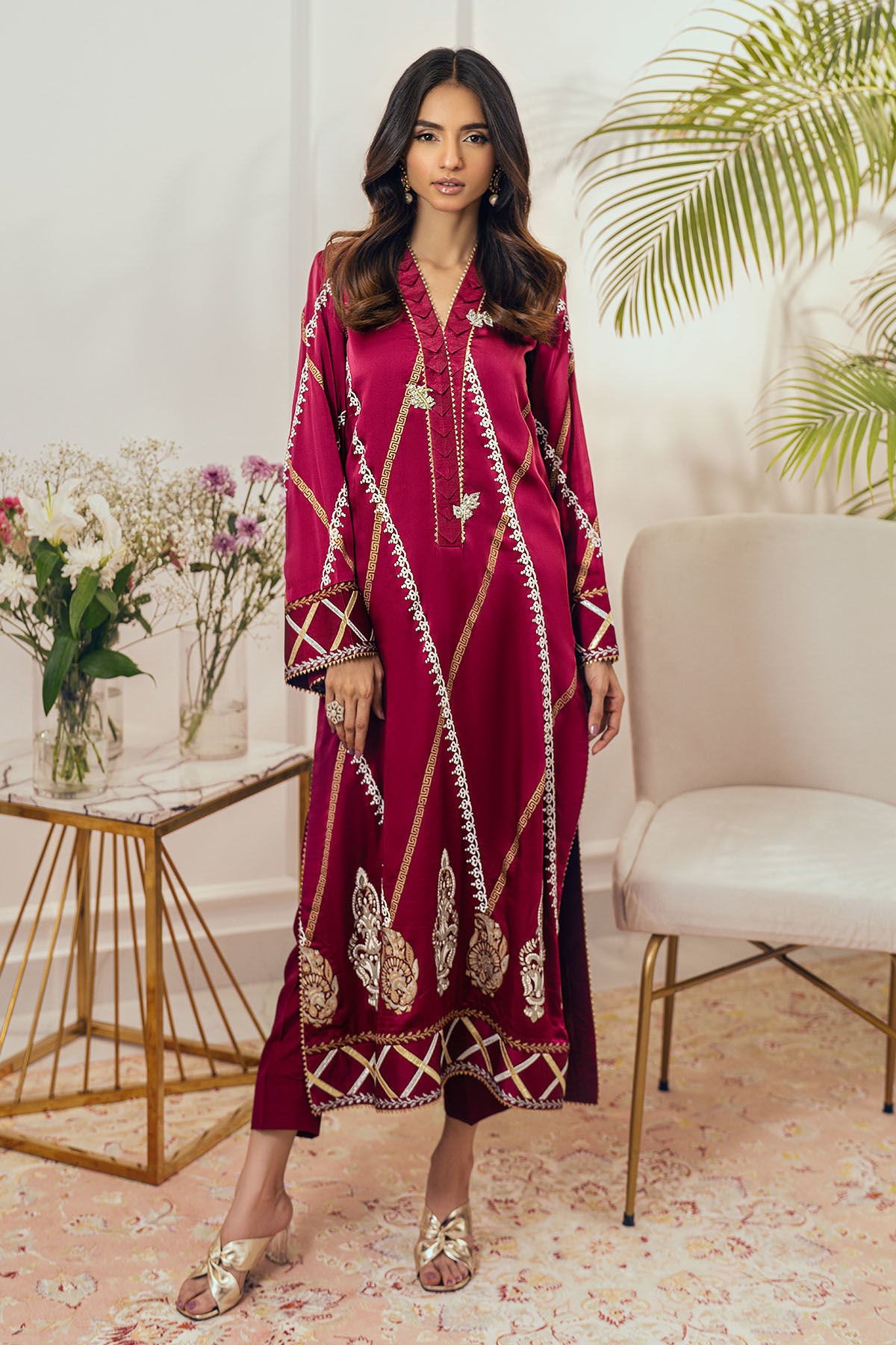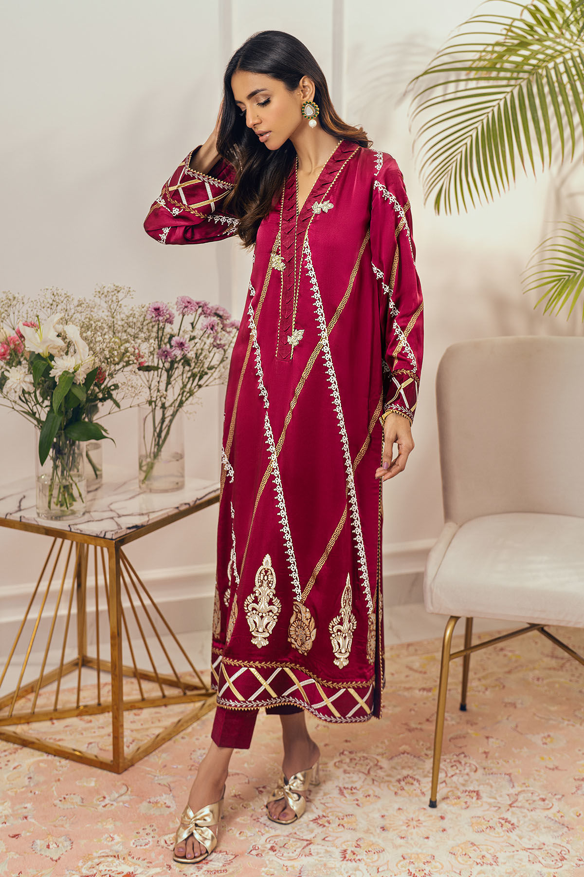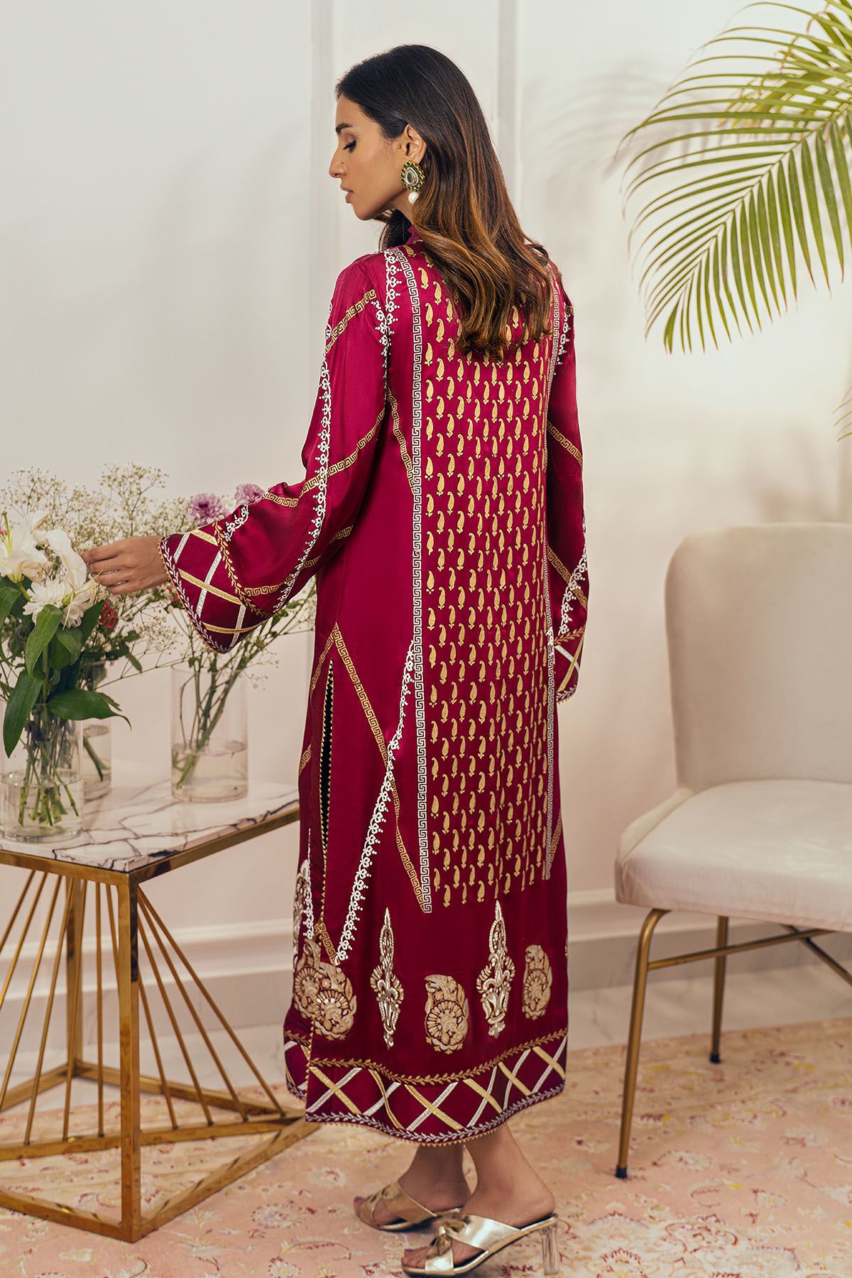Long silhouette shirt in gorgeous shade of ruby on silk canvas featuring hand block printed details in gold and silver. The neckline is adorned with fabric manipulation details featuring handcrafted embellishments. The shirt can be paired with matching raw silk pants.