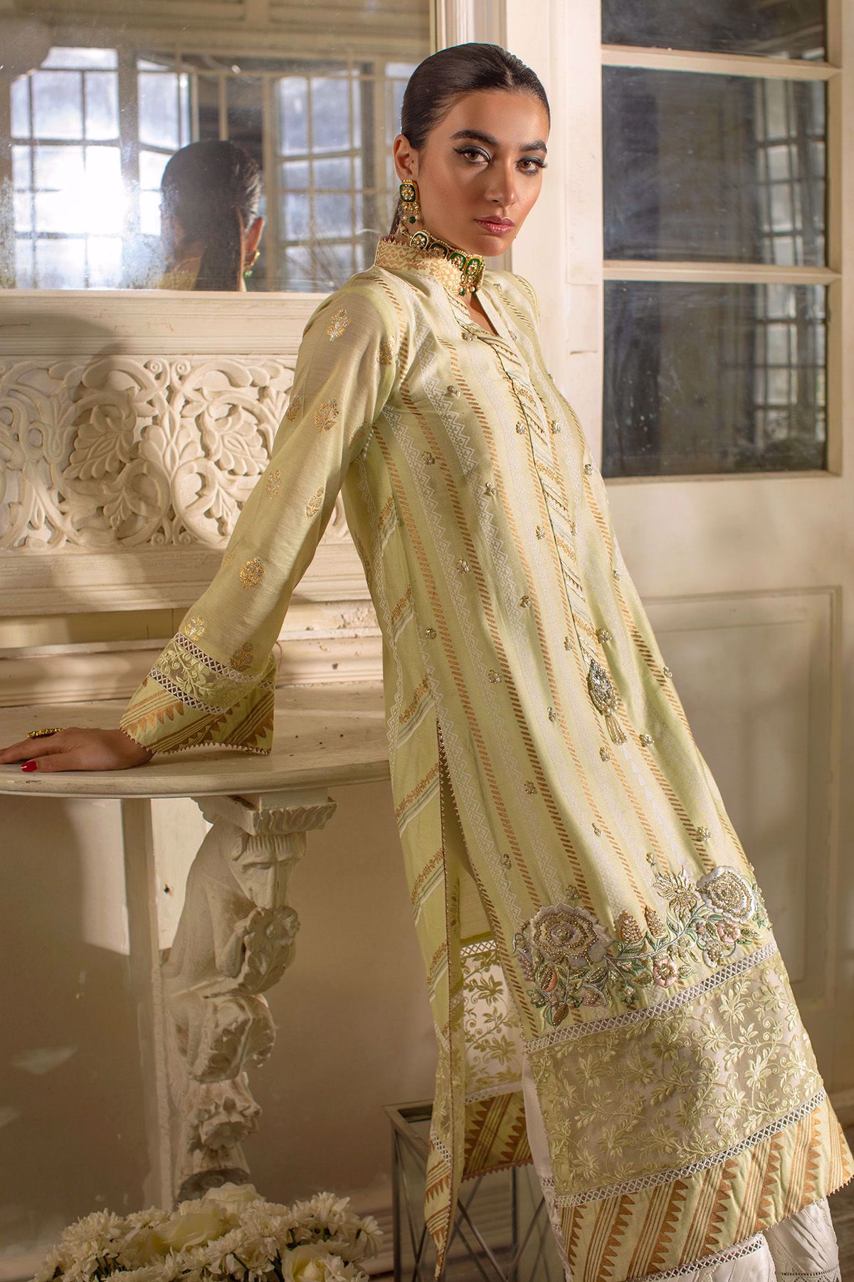 Long shirt with hand block printed geometric patterns on a subtle pastel canvas featuring silk thread embroidered details on hemline, the embroidered details are further enhanced with pearls, sequins and dabka. The neckline of the shirt is adorned with gota and hand crafted embellishments.