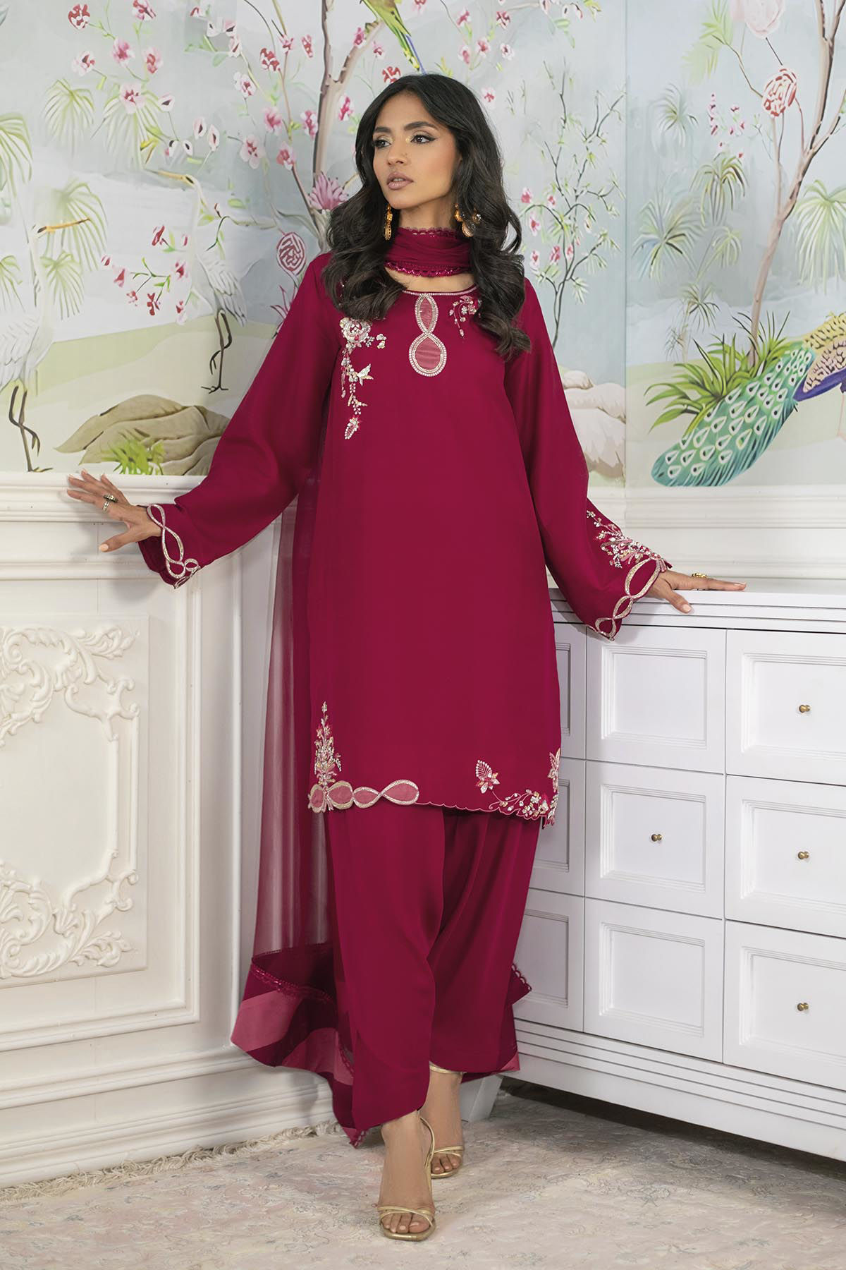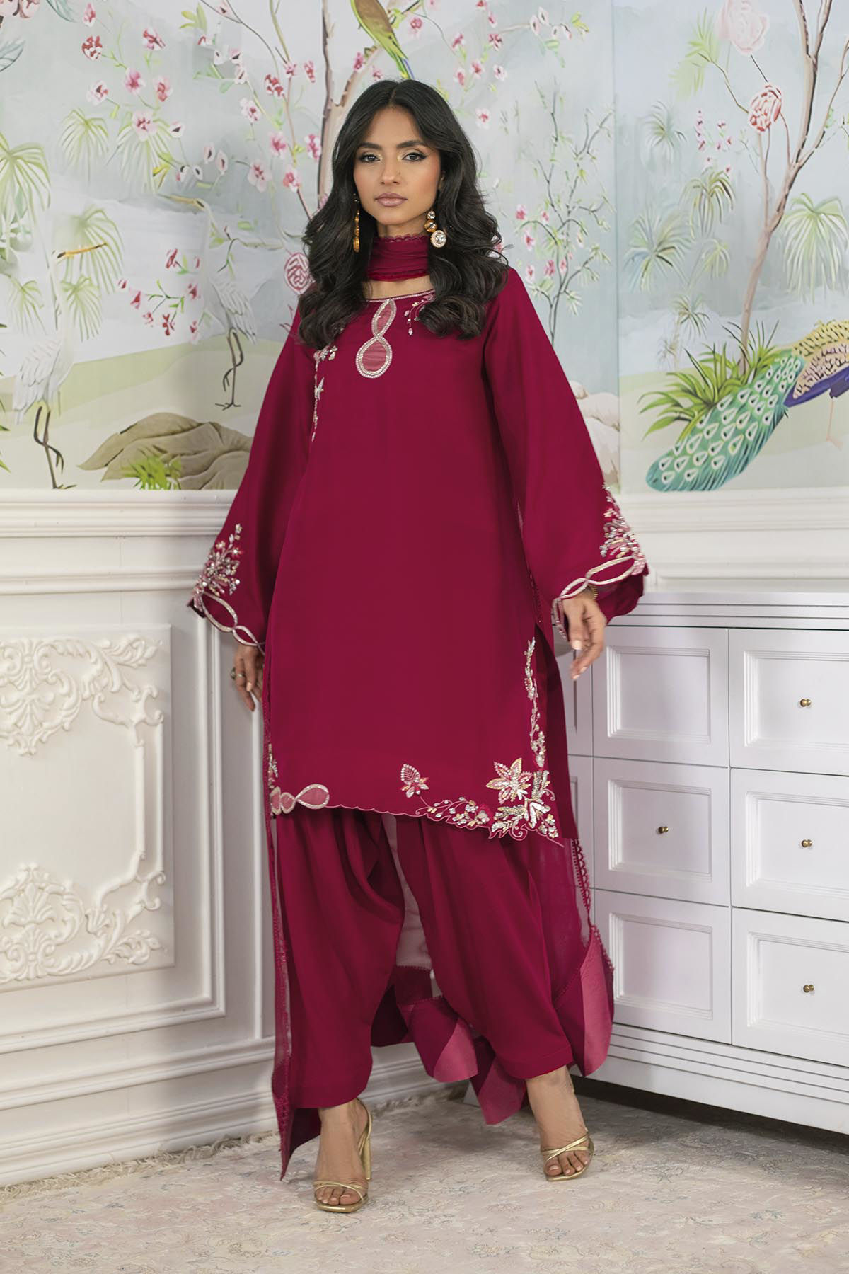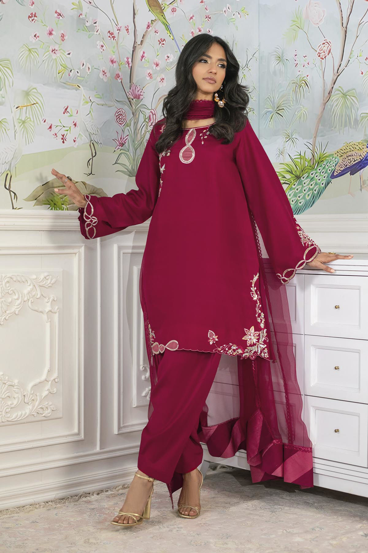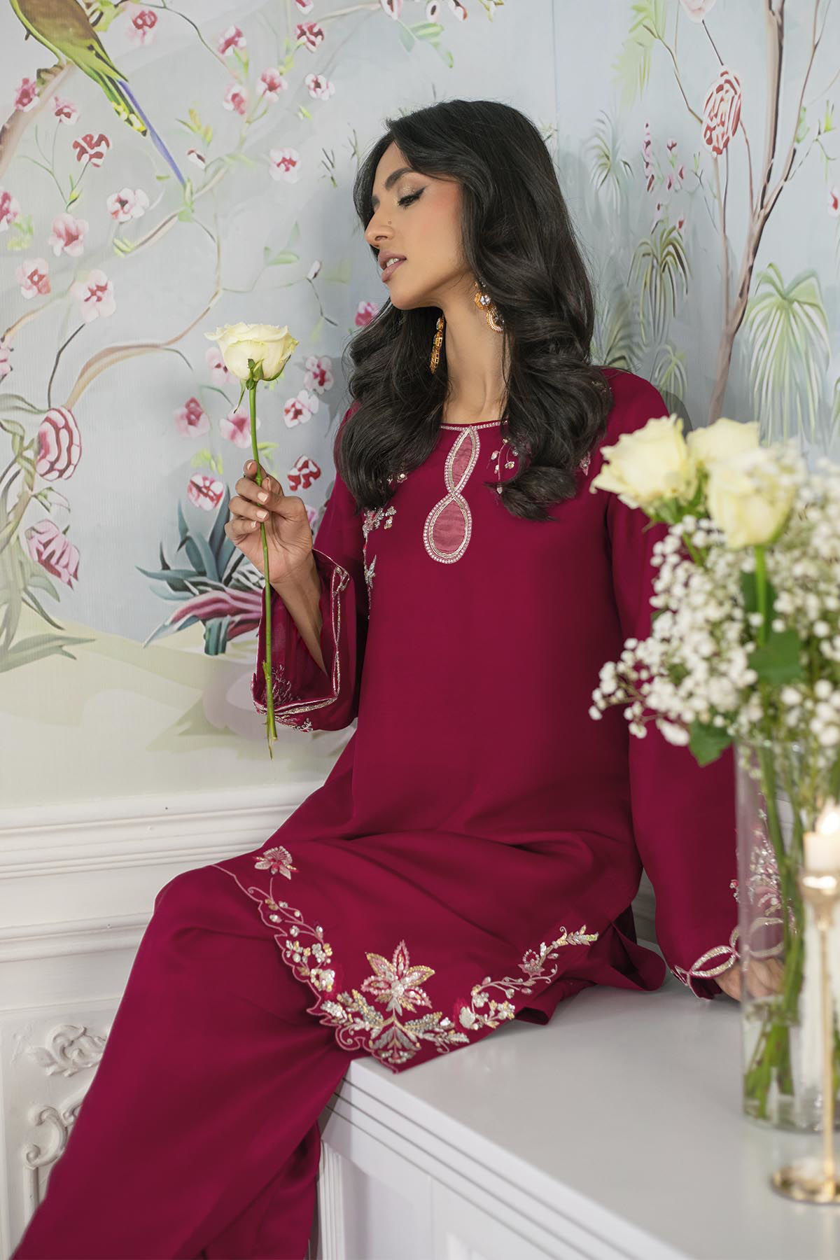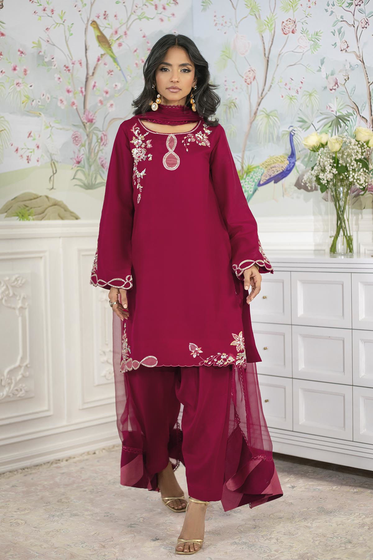 Knee-length shirt in a stunning deep crimson shade on pure raw silk, showcasing meticulously handcrafted zardozi and aari embellishments at the neckline and hem. The zardozi details are enhanced with silk thread resham accents in a delicate shade of pink. This ensemble is complemented by an organza dupatta that features refined chatta patti details and elegant lace finishings. The shirt is ideally paired with pure raw silk shalwar to achieve a distinguished look.