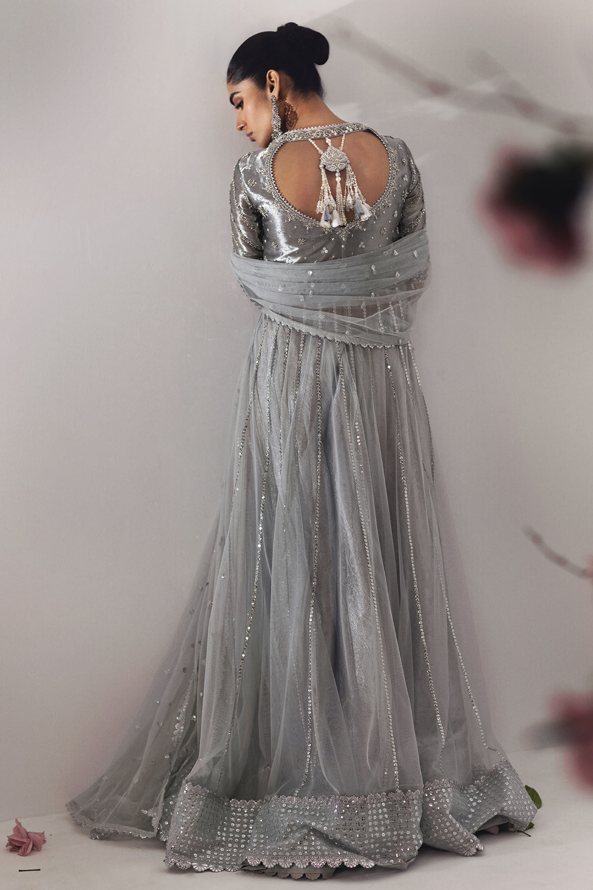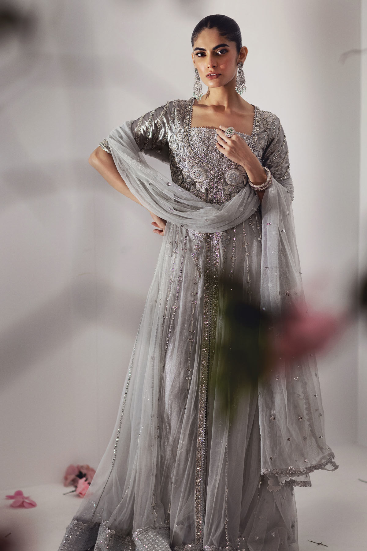 Floor-length pishwas in a refined metallic grey, embellished with tone-on-tone silk thread embroidery. The floral embroidered motifs are further enhanced with silver zardozi embellishments. The hem is elegantly adorned with a sequined border that catches the light beautifully. The centre back is meticulously crafted, featuring dangling handcrafted tassels. This outfit can be elegantly paired with damask dhaka pants and a net dupatta, which showcases sequins and lace details that shimmer with light.