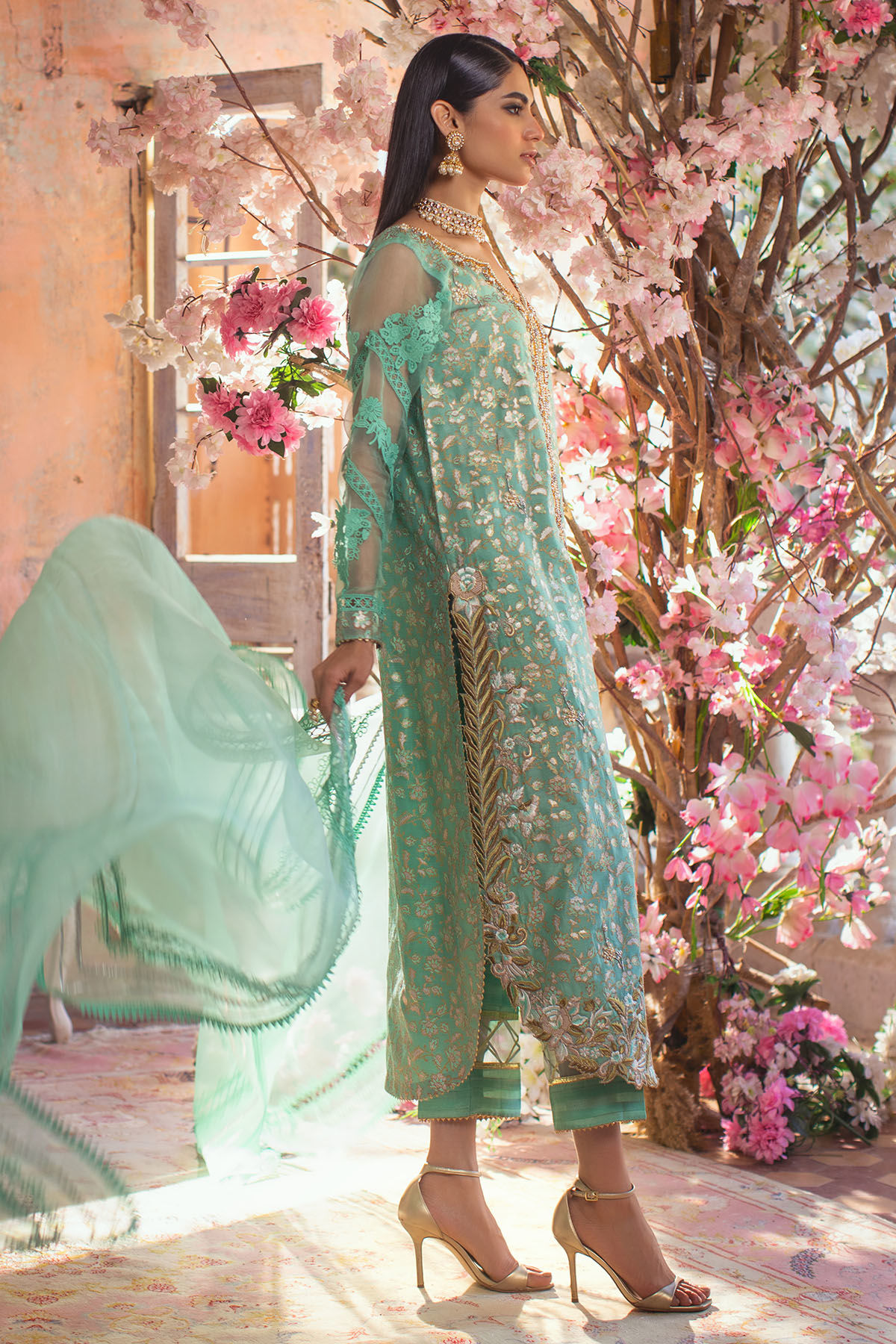 Long silhouettes shirt in gorgeous shade of marine green featuring hand block printed details in silver and gold which are further adorned with zardozi neckline. The hem of the shirt is enhanced with silk thread embroidered details, side slits features cutwork leaf patterned embroidered details. Organza sleeves are enhanced with crochet appliqué and laces. The shirt is paired with straight raw silk gota pants featuring pleats and kingri on hem. The shirt is paired with matching organza dupatta featuring laces and gota on all sides.