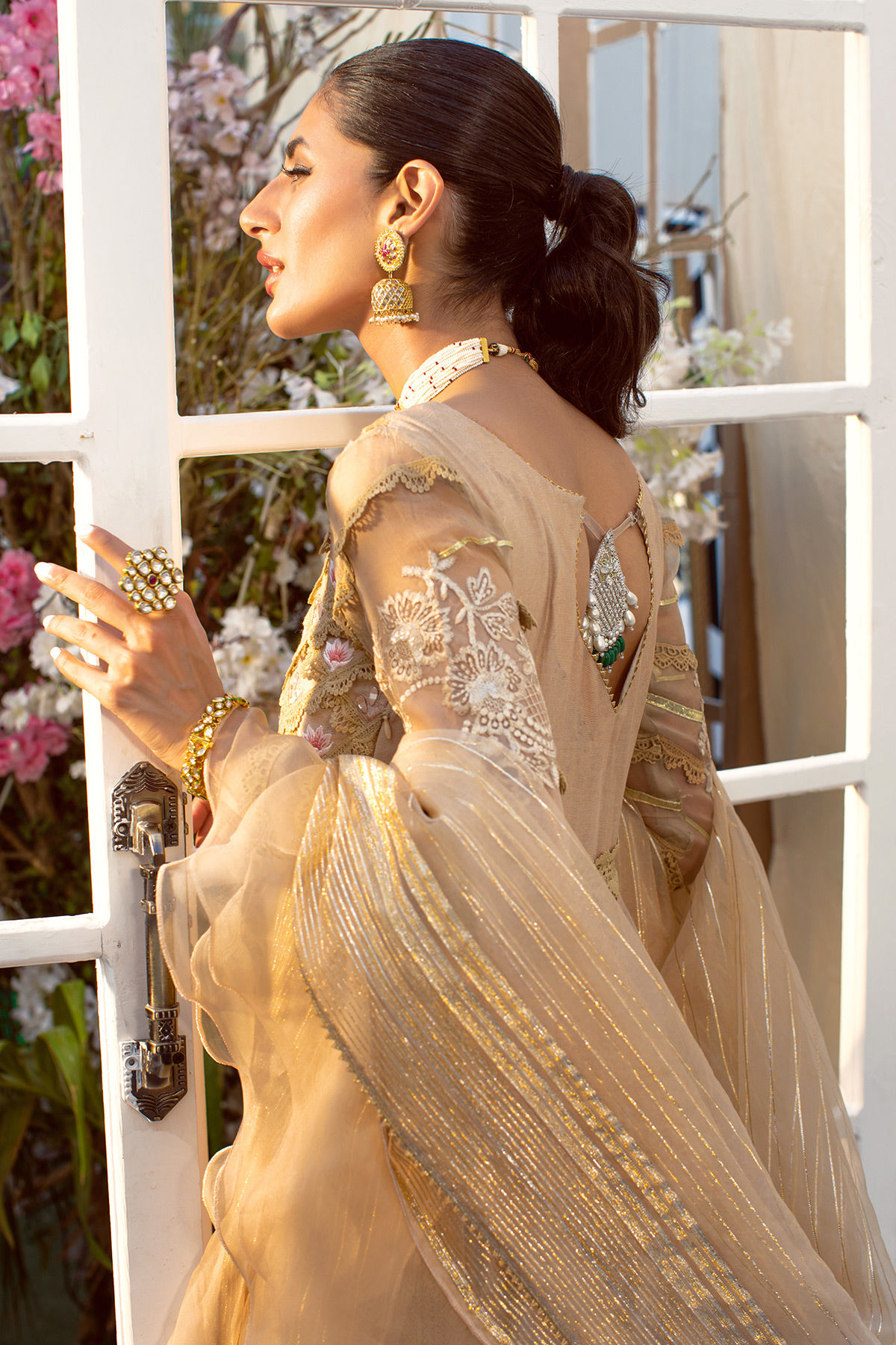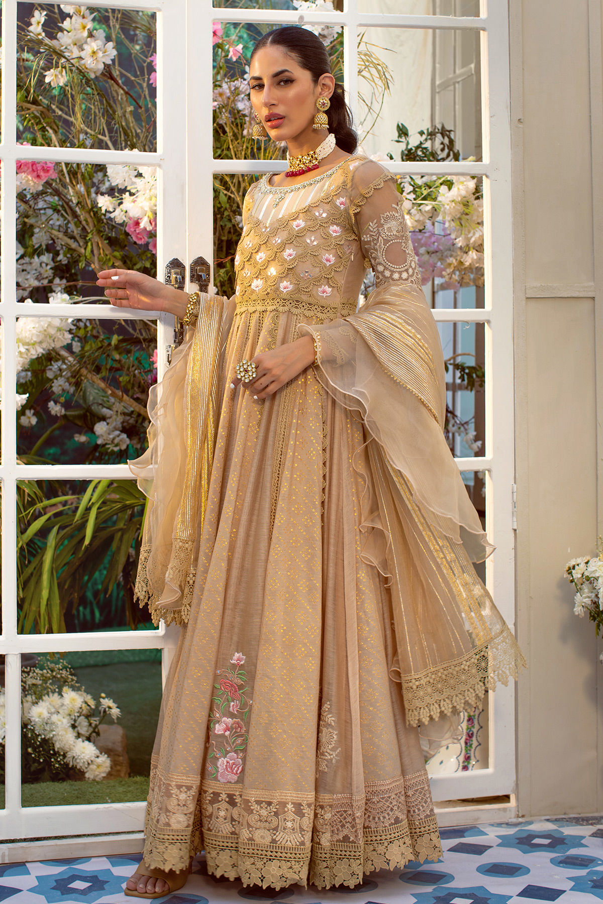Flared silhouette floor length kalidar in head turning beige featuring crochet laces and silk thread embroidered bodice. The bodice is further adorned with zardozi details on shimmering lorex fabric. Each panel is sewn to perfection with inserting crochet laces and finished with silk thread embroidered bunches and applique details on alternate panels. The Kalidar is paired with Raw Silk detailed pants and lorex organza ruffled dupatta.
