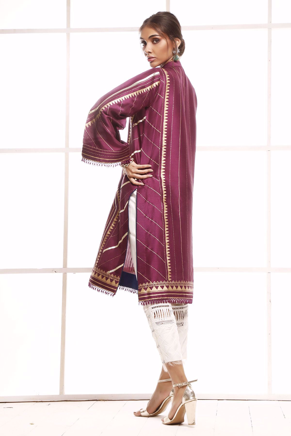 Pure raw silk magenta shirt with gold hand block printed details. The neckline of the shirt is enhanced with handcrafted embellishments. The shirt is paired with Afterglow White pants with silk thread motifs on front incorporated with crochet laces and pleats.