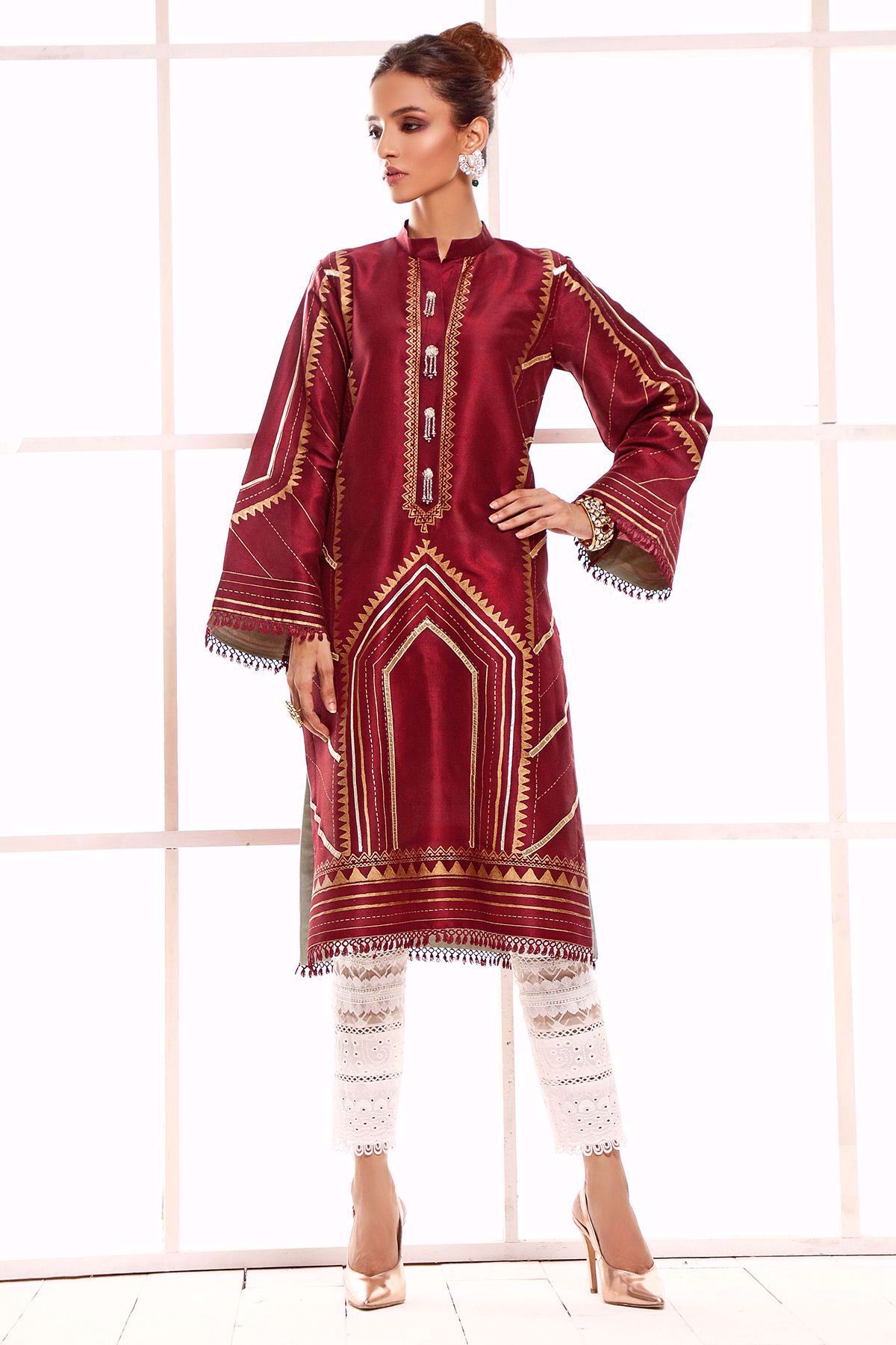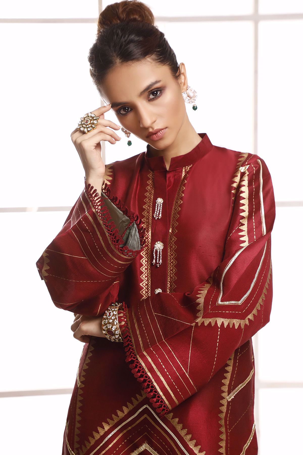 Pure raw silk crimson shirt with gold hand block printed details. The neckline of the shirt is enhanced with handcrafted embellishments. The shirt is paired with Zahara Chikan pants with silk thread motifs on front incorporated with crochet laces and pleats.