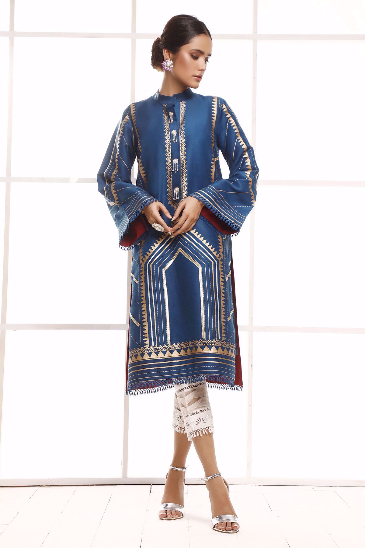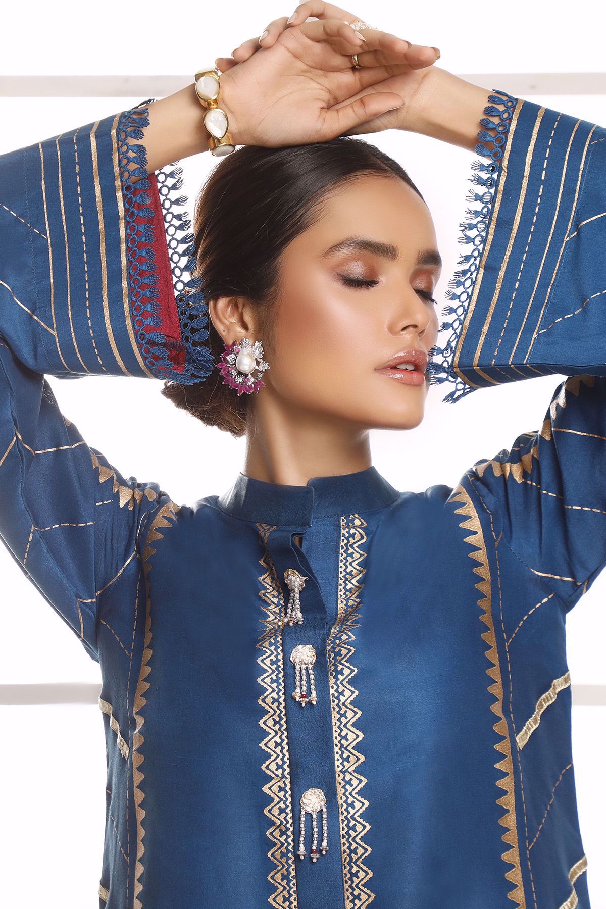 Pure raw silk sapphire blue shirt with gold hand block printed details. The neckline of the shirt is enhanced with handcrafted embellishments. The shirt is paired with Lotus pants with silk thread motifs on front incorporated with crochet laces and pleats.