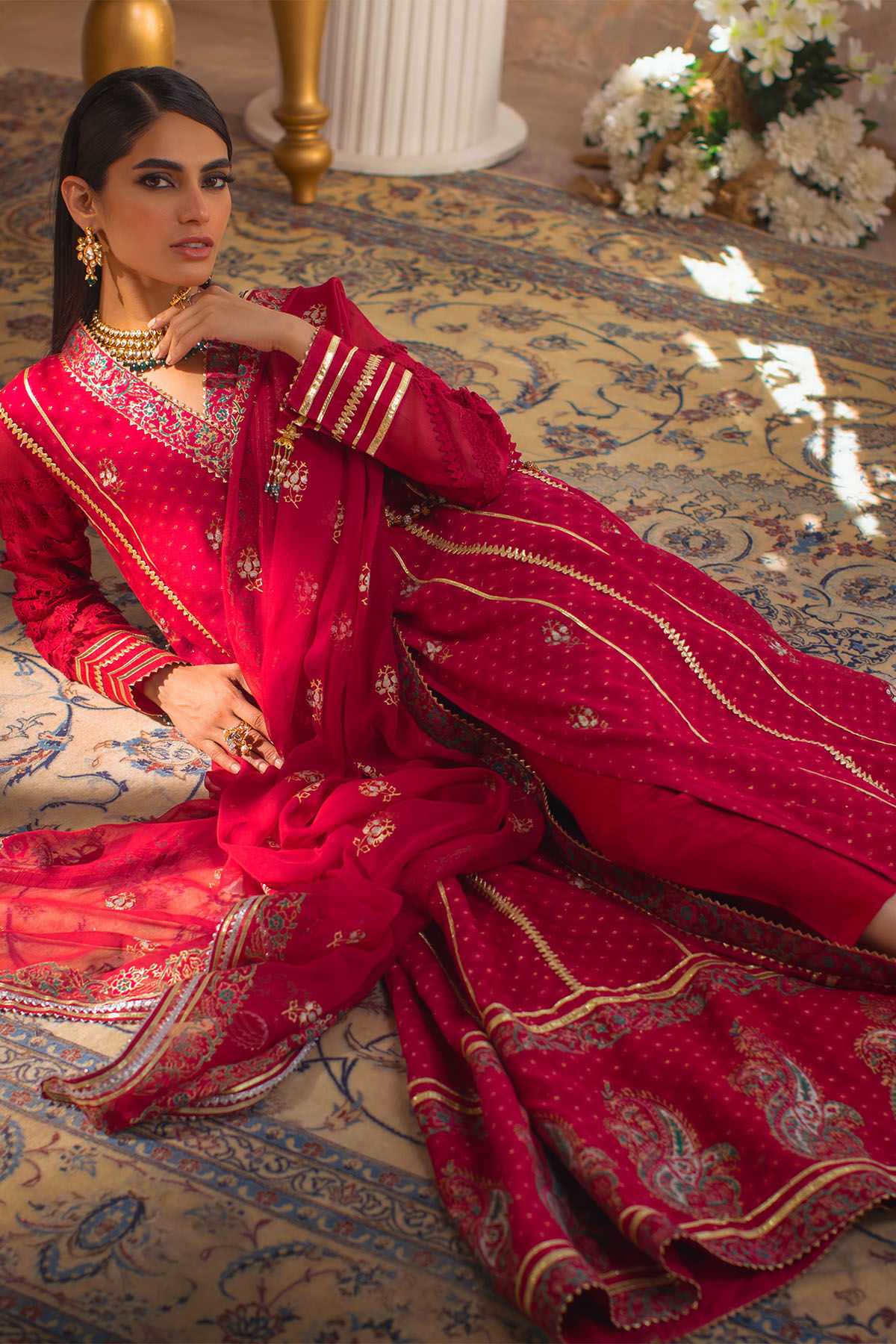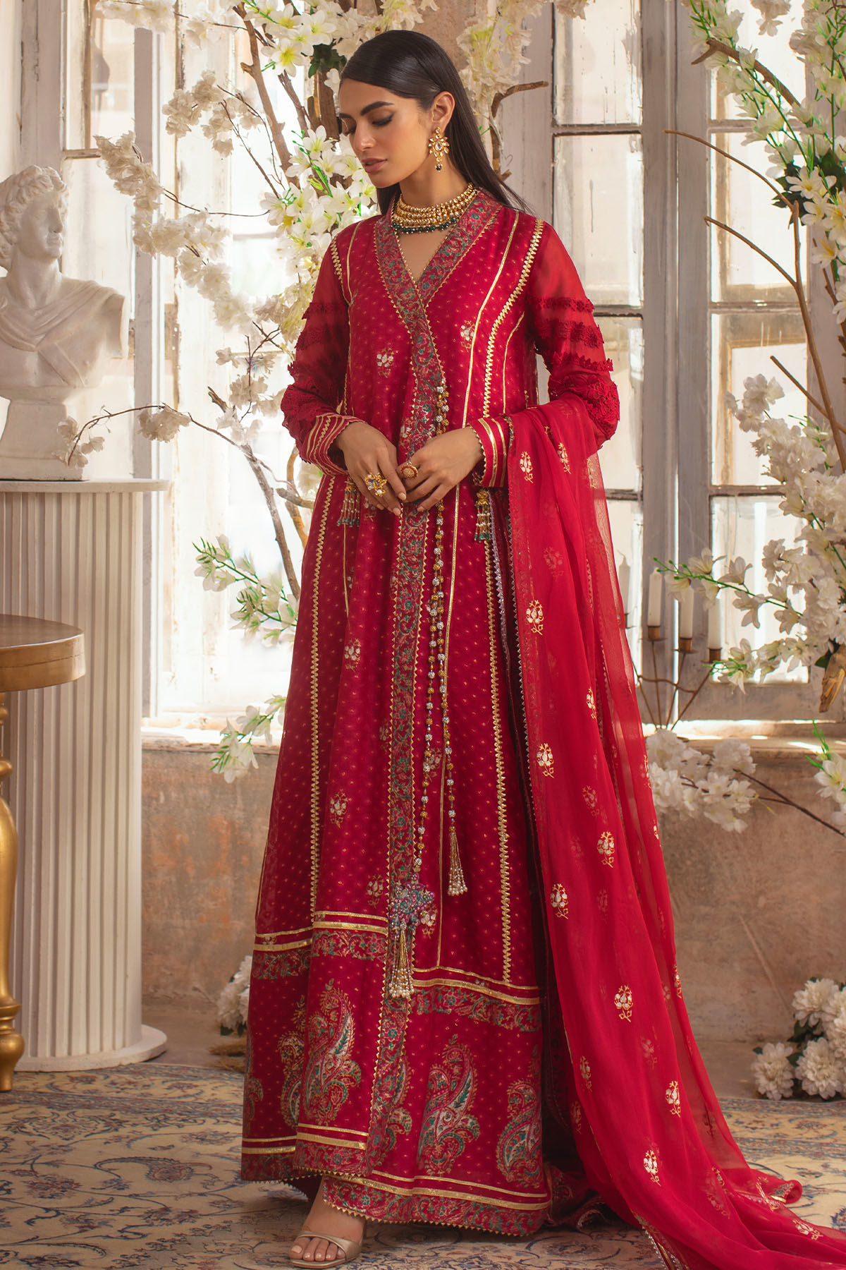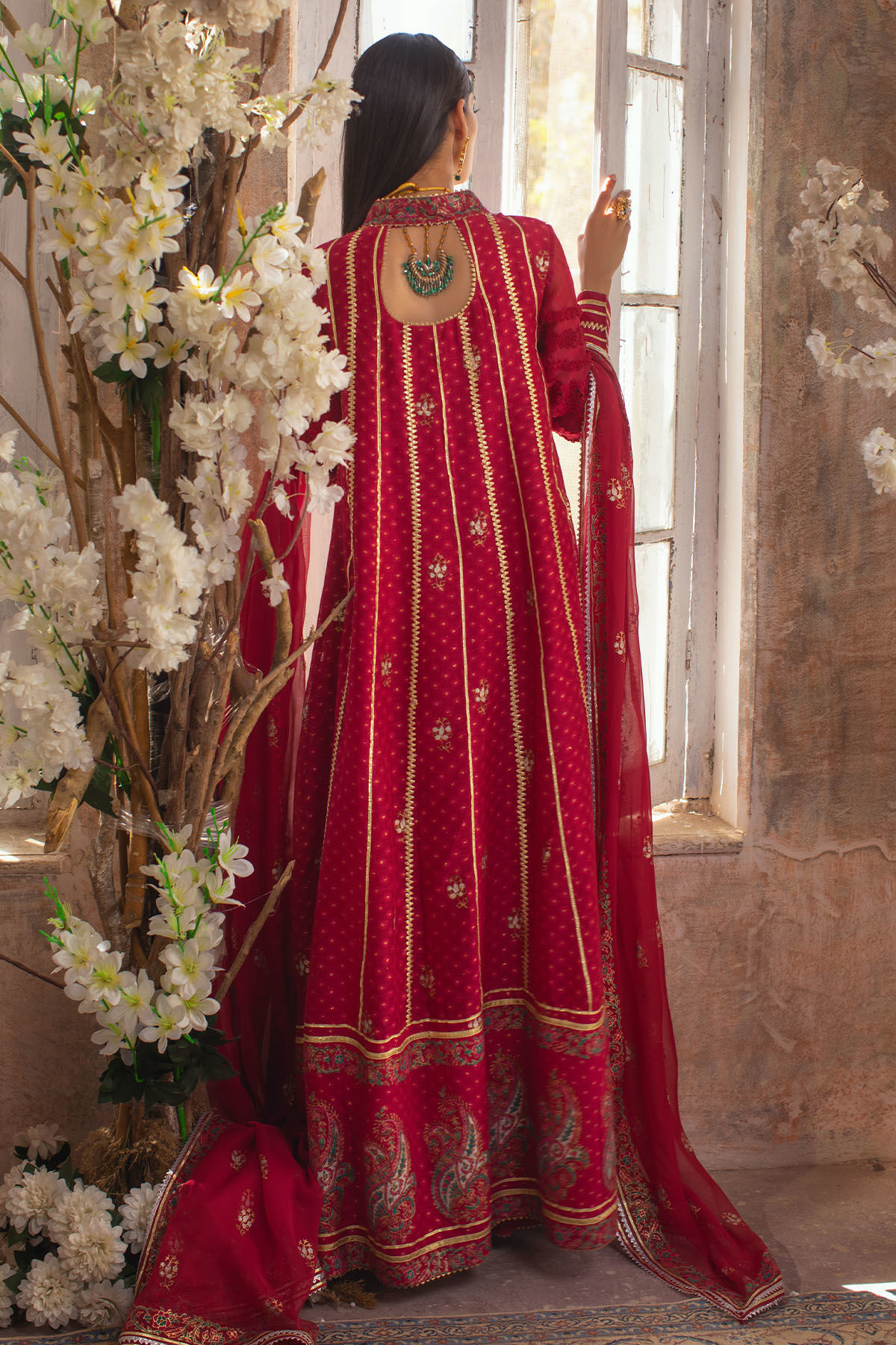 Flared silhouette angharka on self-cotton net canvas featuring hand block print and gota details. The center front is adorned with handcrafted tassels and the back keyhole is enhanced with zardozi and crystal embellished tassels. The outfit can be paired with straight raw silk matching pants and chiffon hand block printed dupatta featuring gota finishing.