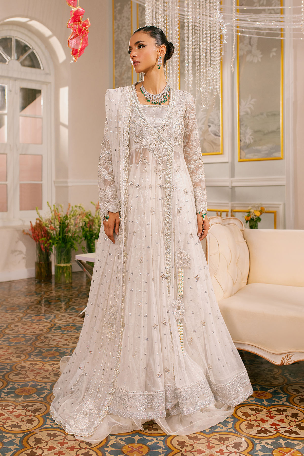 Experience the breathtaking beauty of delicate silk thread rosettes on pure white canvas adorned with radiant light-catching crystals and intricate zardozi work.