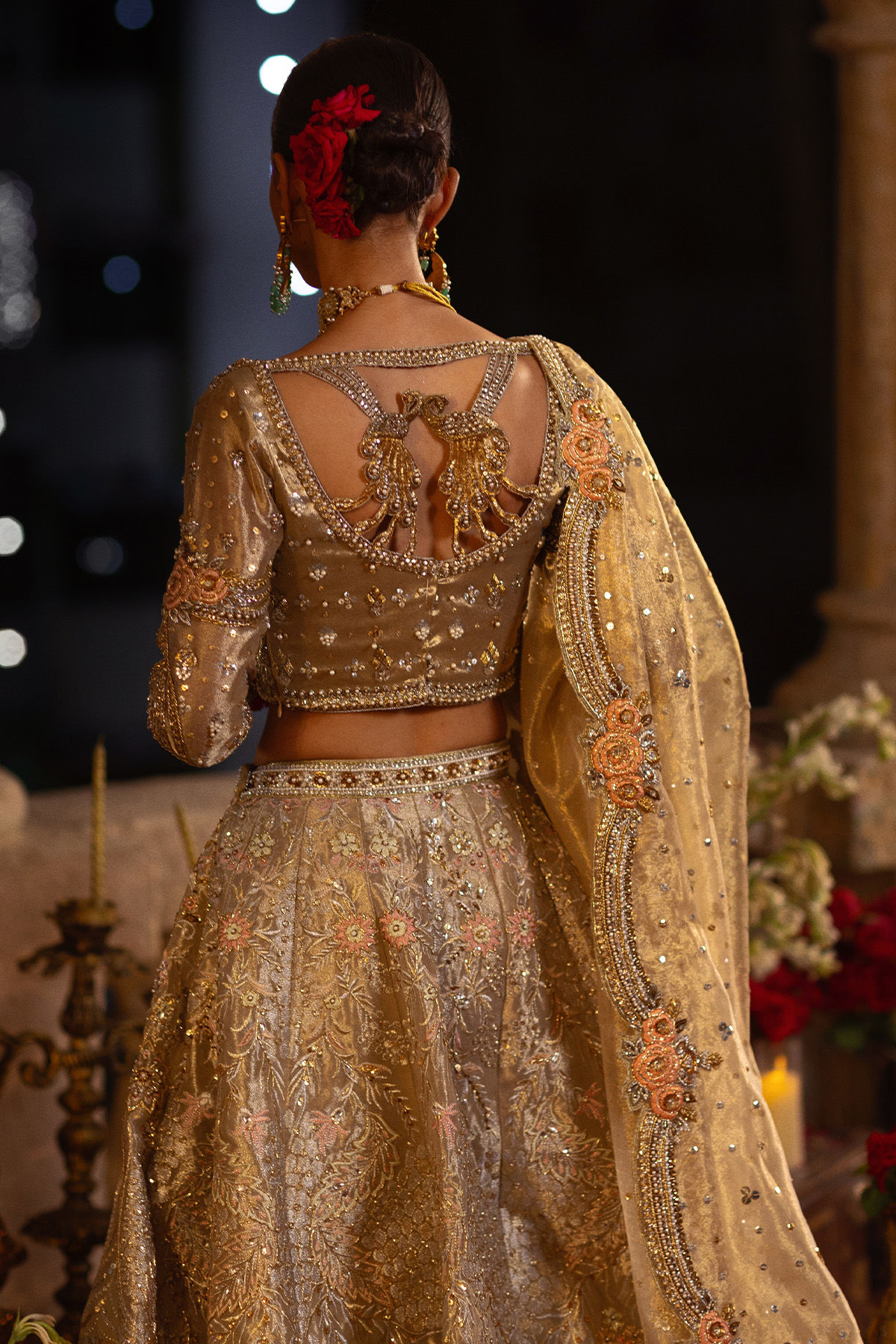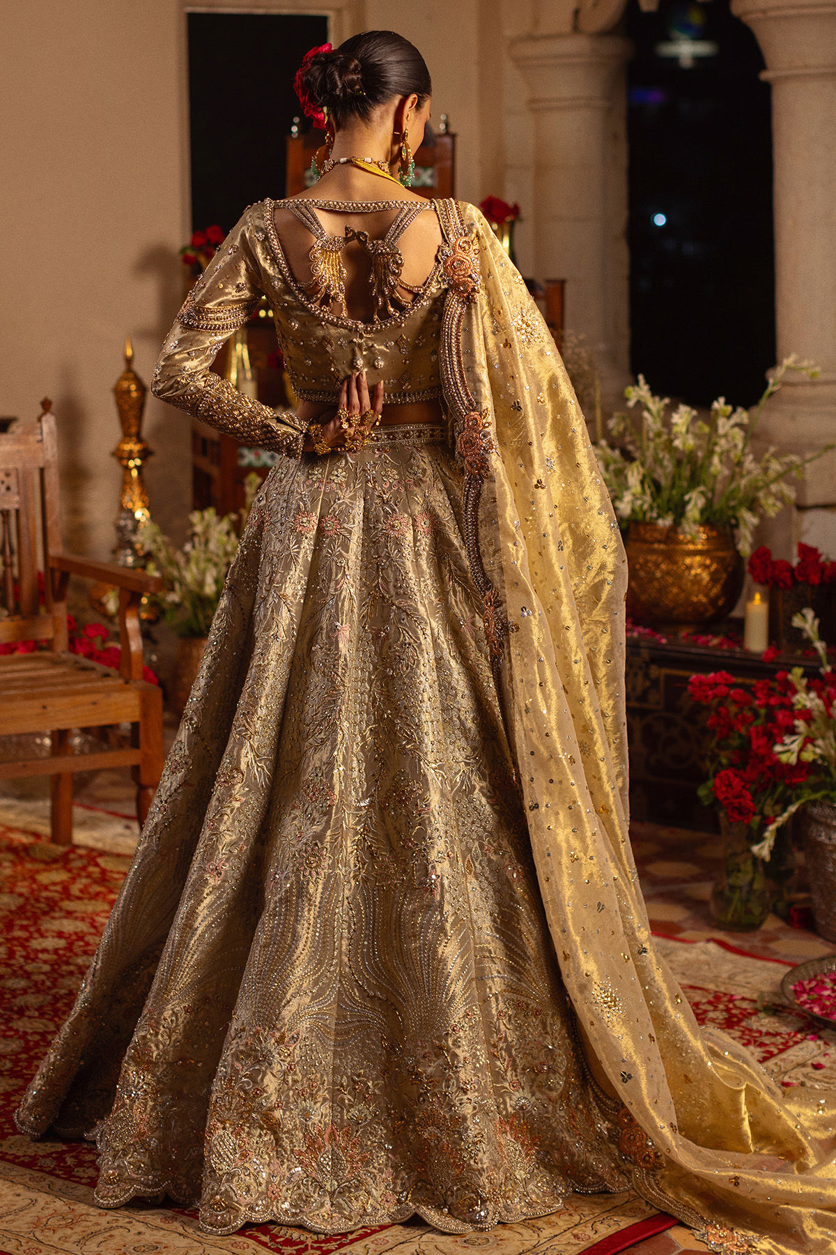 Exquisite choli crafted on a gold glistening lamé fabric, adorned with antique and gold zardozi embellishments. The zardozi details are further enhanced with silk thread rosettes in an opulent coral peach hue. The choli is elegantly paired with a flared lehnga, which boasts subtle hand-embroidered accents in gold, peach, and pink, further enriched with zardozi work and shimmering sequins. The center front of the lehnga is impeccably designed, featuring handcrafted dangling tassels. This sophisticated ensemble is complemented by a long dupatta, showcasing silk thread rosettes and zardozi borders, making it a striking choice for this wedding season.