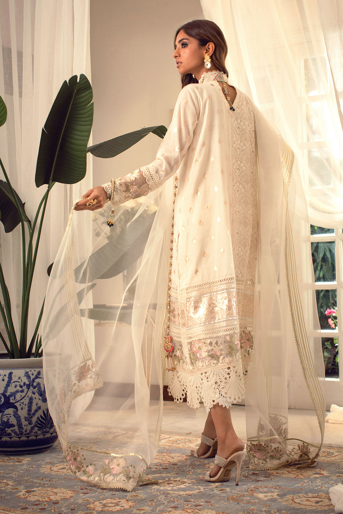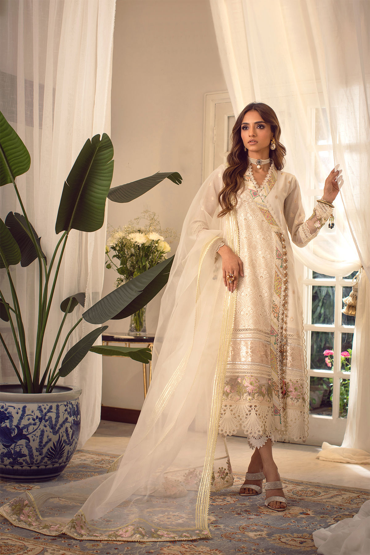 Long silhouette angharka in ivory shade featuring lorex and embroidered details on the hemline. The centre front of the outfit is enhanced with handcrafted tassels. The lorex sleeves are enhanced with lace and embroidered organza details featuring handcrafted tassels. The outfit is paired with pure organza gota dupatta featuring embroidered details on each pallu. The outfit is paired with raw silk Rooh pants featuring embroidered organza, fabric manipulation and crochet lace details.