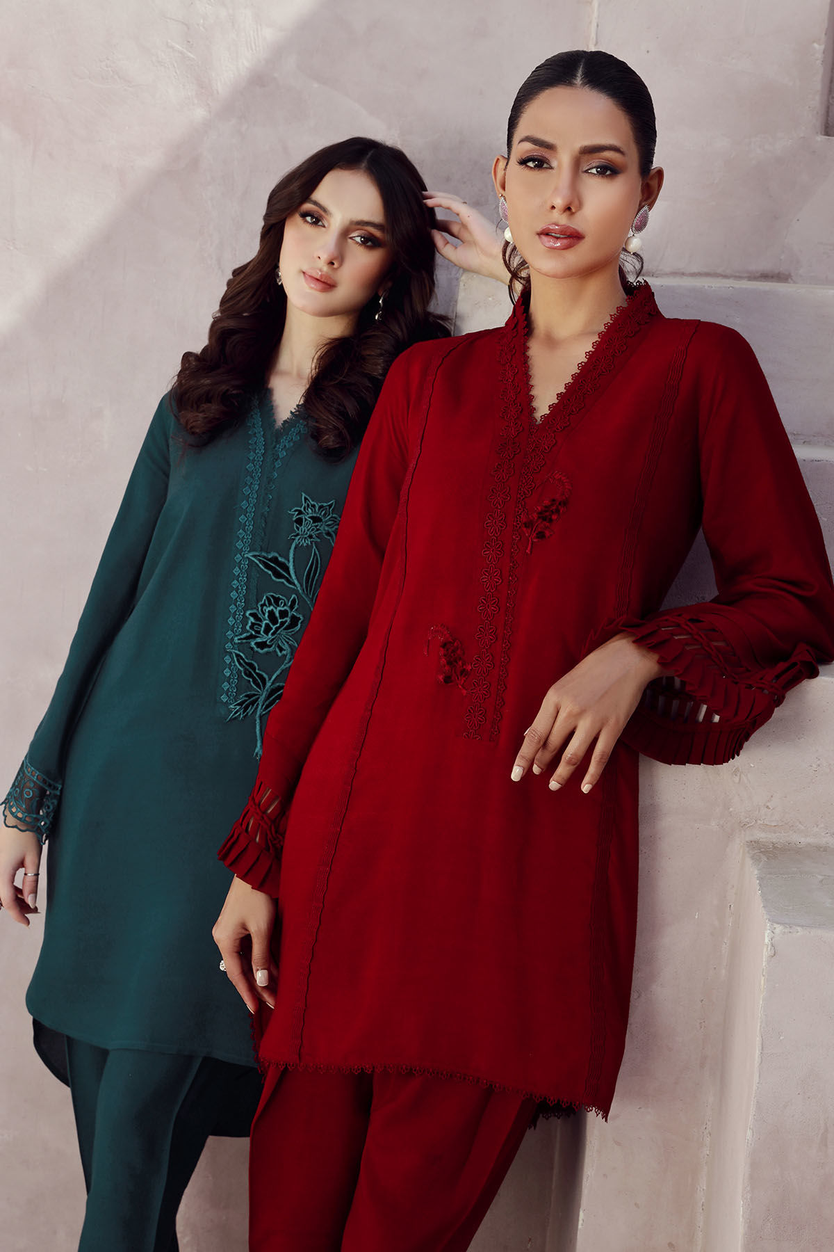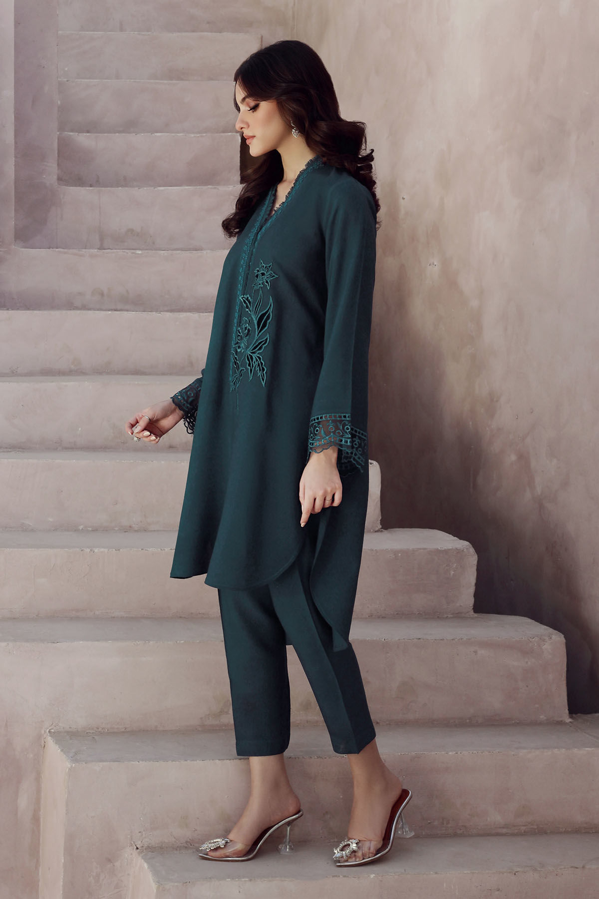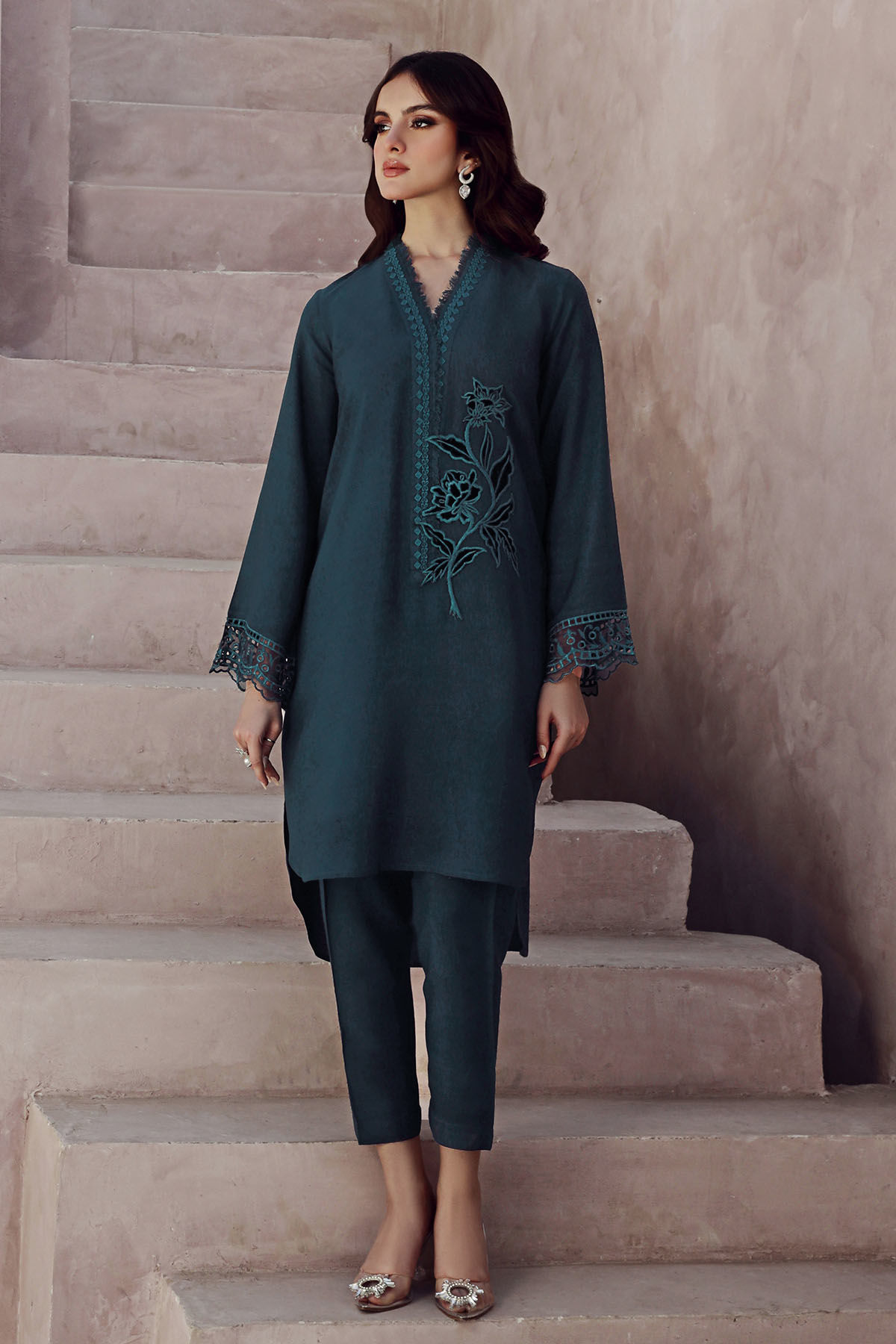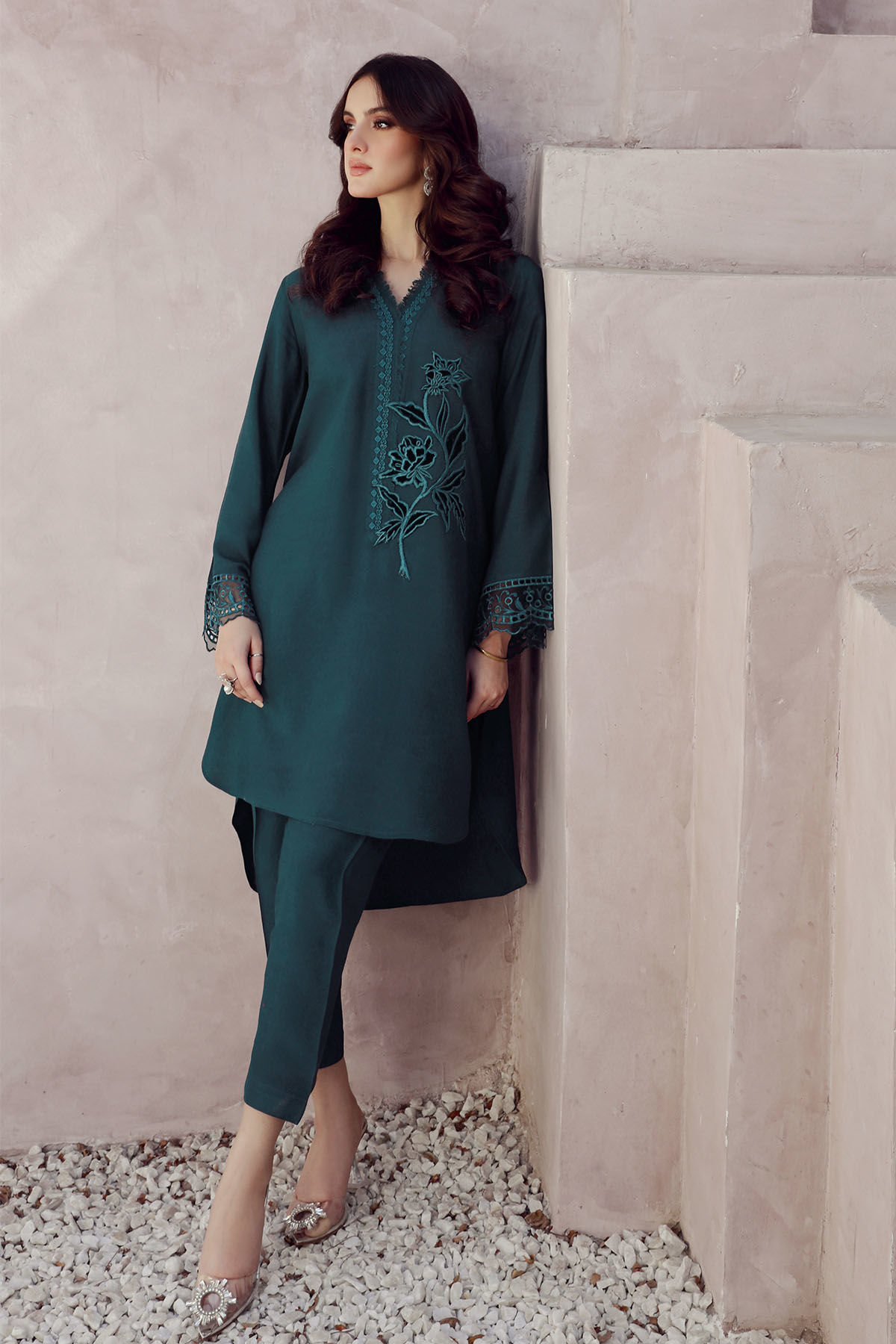 High low co-ord featuring velvet appliqué motifs on center front, the neckline is enhanced with lace and fringe details and the sleeves are adorned with schiffli. The top is paired with matching shalwar for a sleeker look.