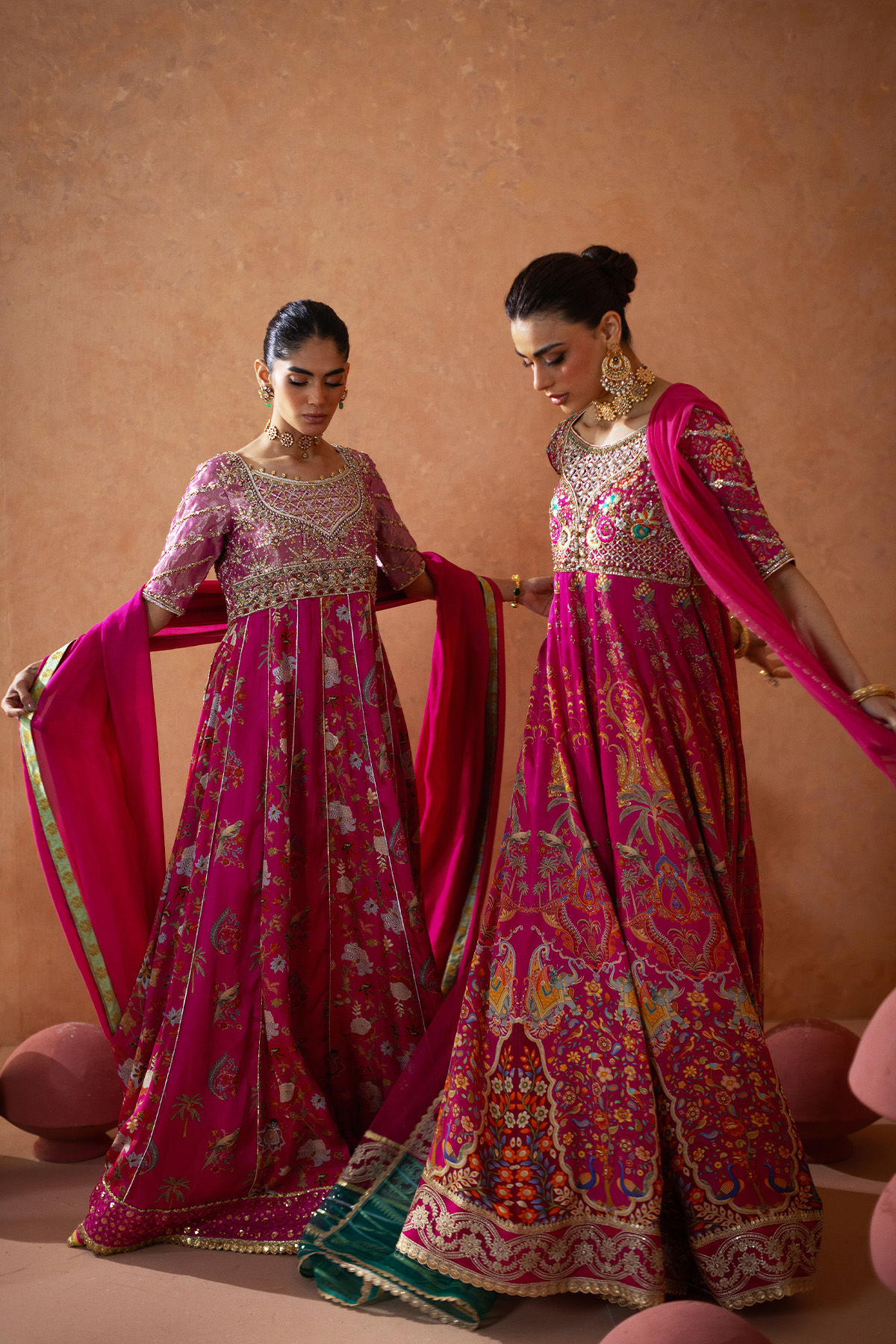Floor-length Kalidar in a captivating shade of deep pink crafted from silk canvas, showcasing signature AA printed embellishments. The bodice is intricately adorned with zardozi and resham detailing in a harmonious blend of silver, gold, and antique tones. Accompanying the Kalidar is a net colour-blocked dupatta, which features an organza and zari embroidered panel embellished with gota accents. For a complete festive ensemble, the Kalidar may be elegantly paired with straight raw silk trousers.