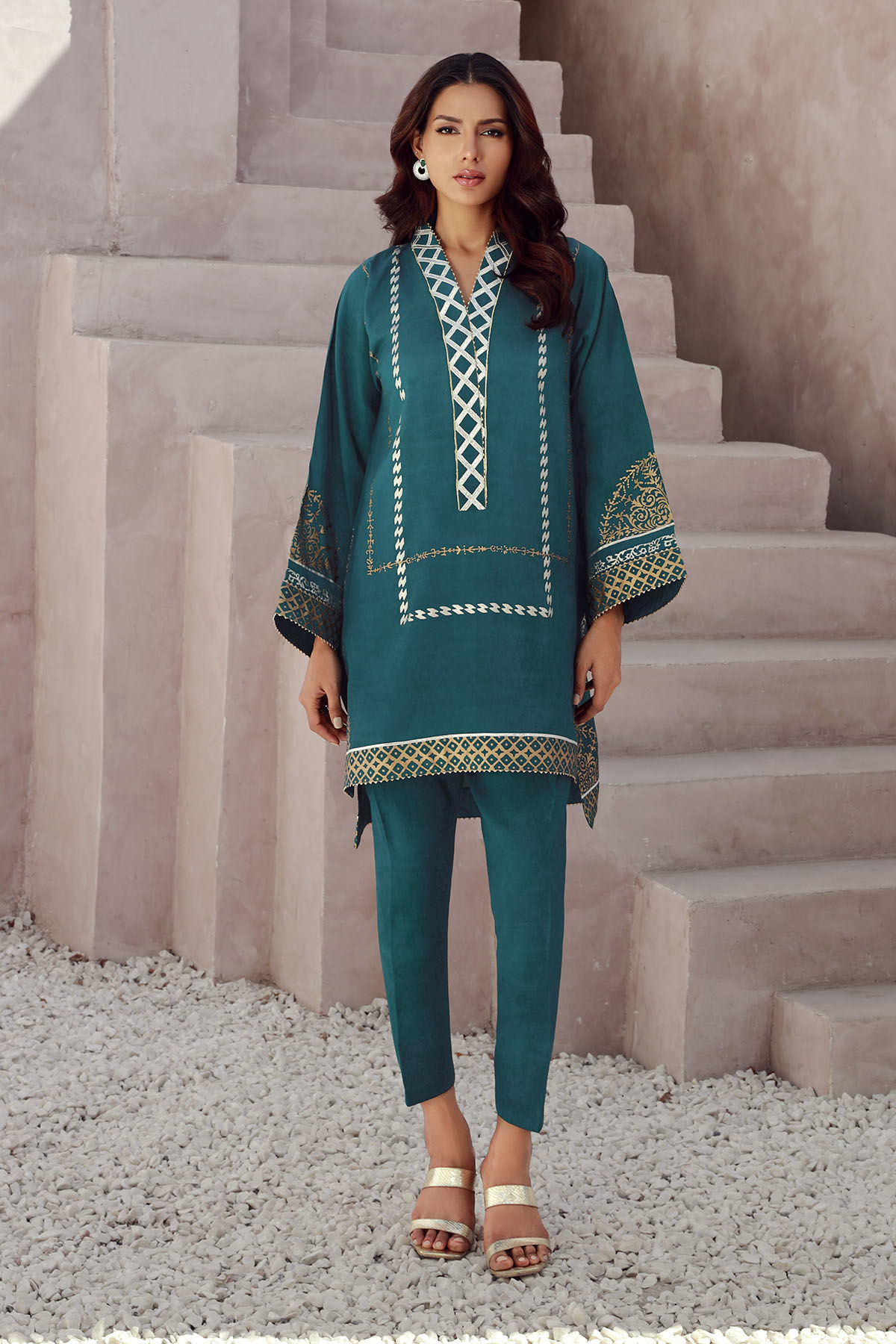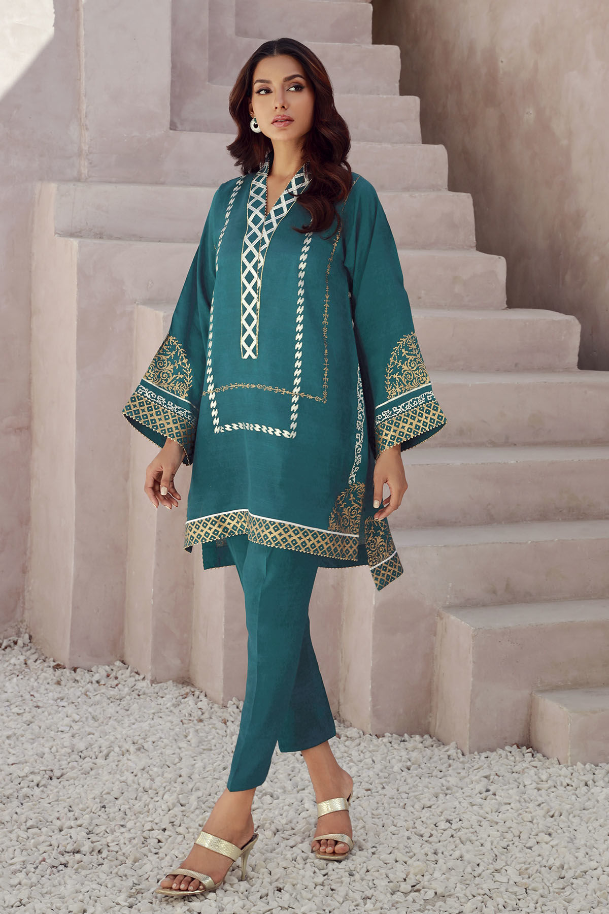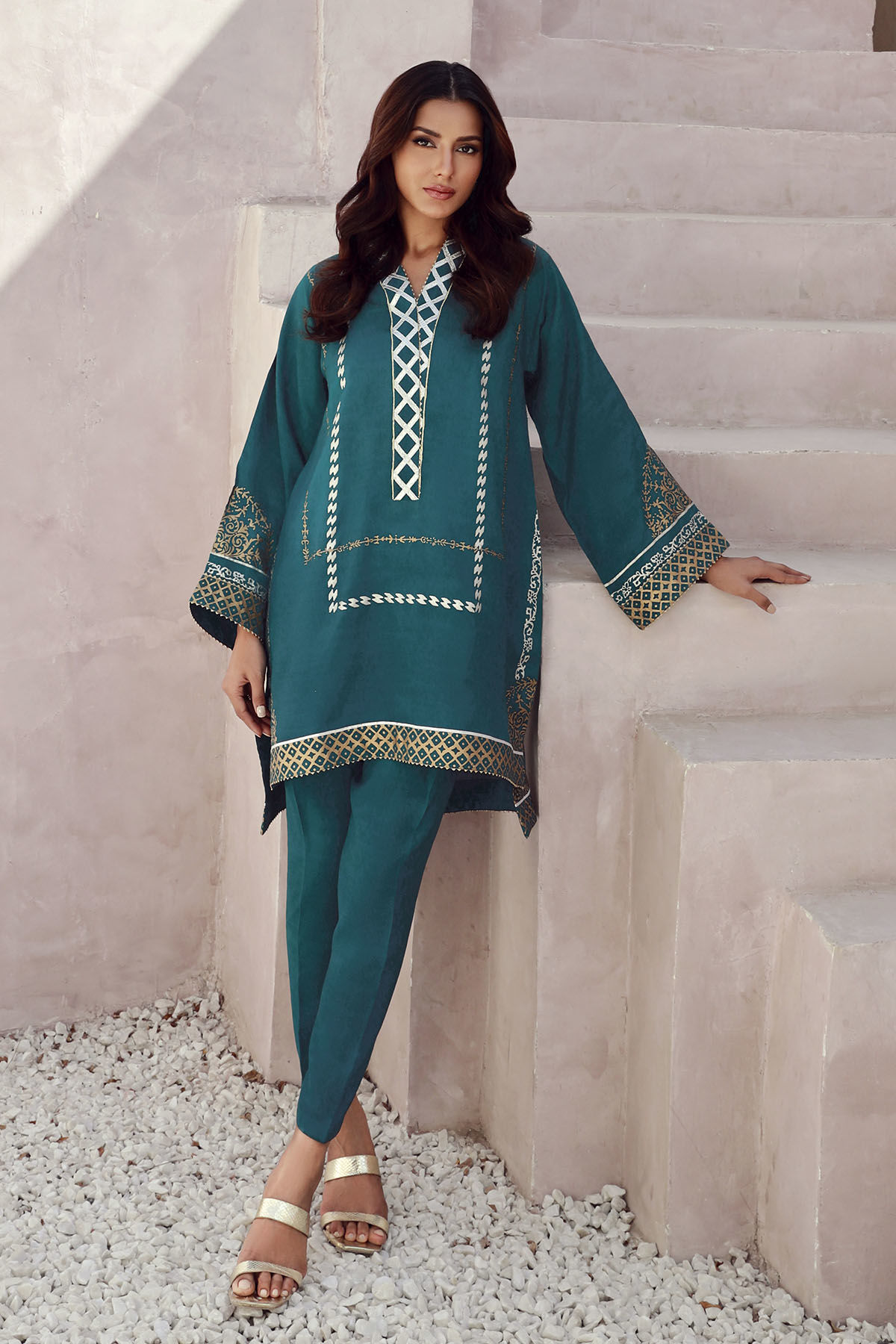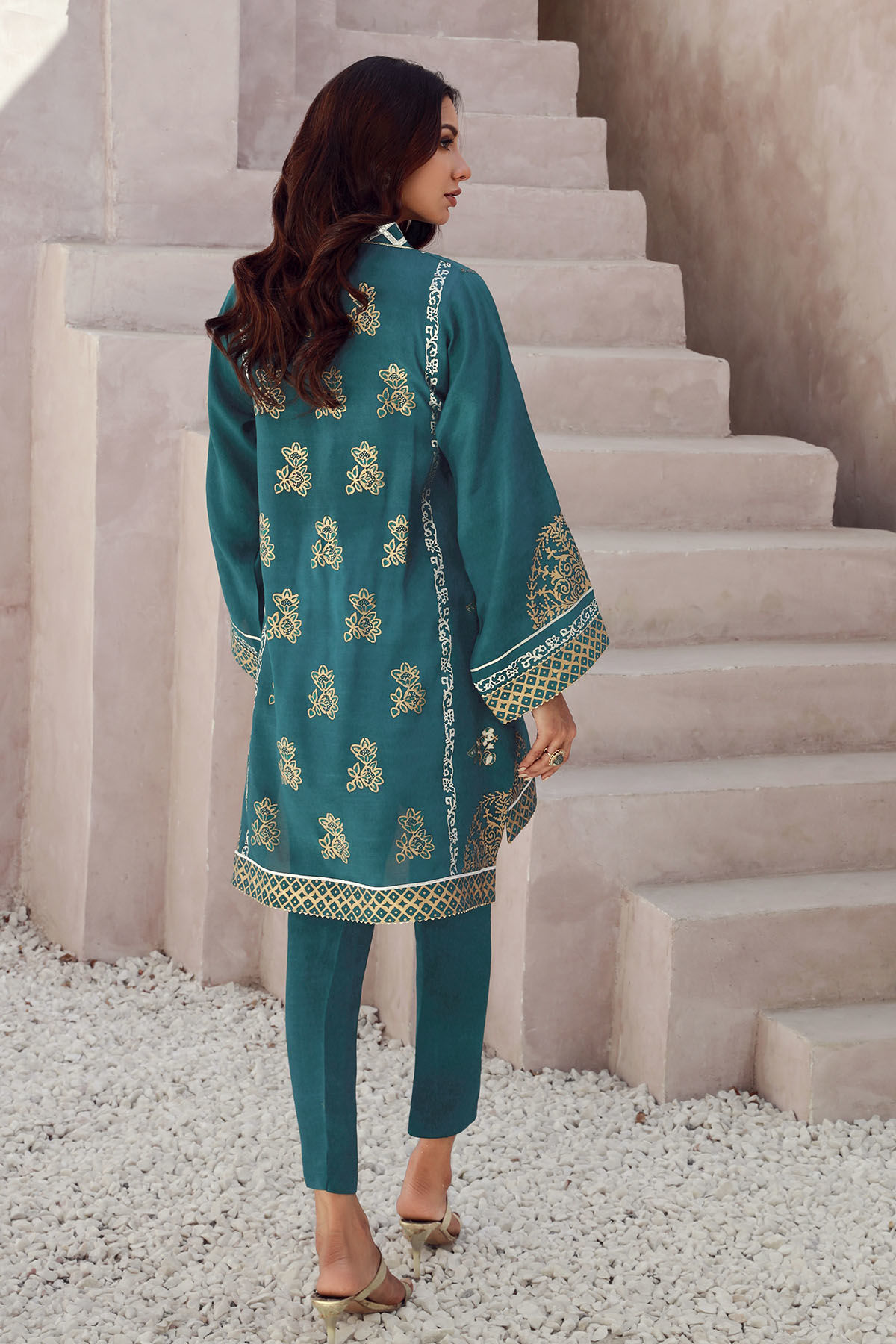 High low silhouette shirt on blended raw silk featuring gold and silver block printed details, the neckline of the shirt is adorned with gota manipulation and the shirt can be paired with matching straight raw silk pants.
