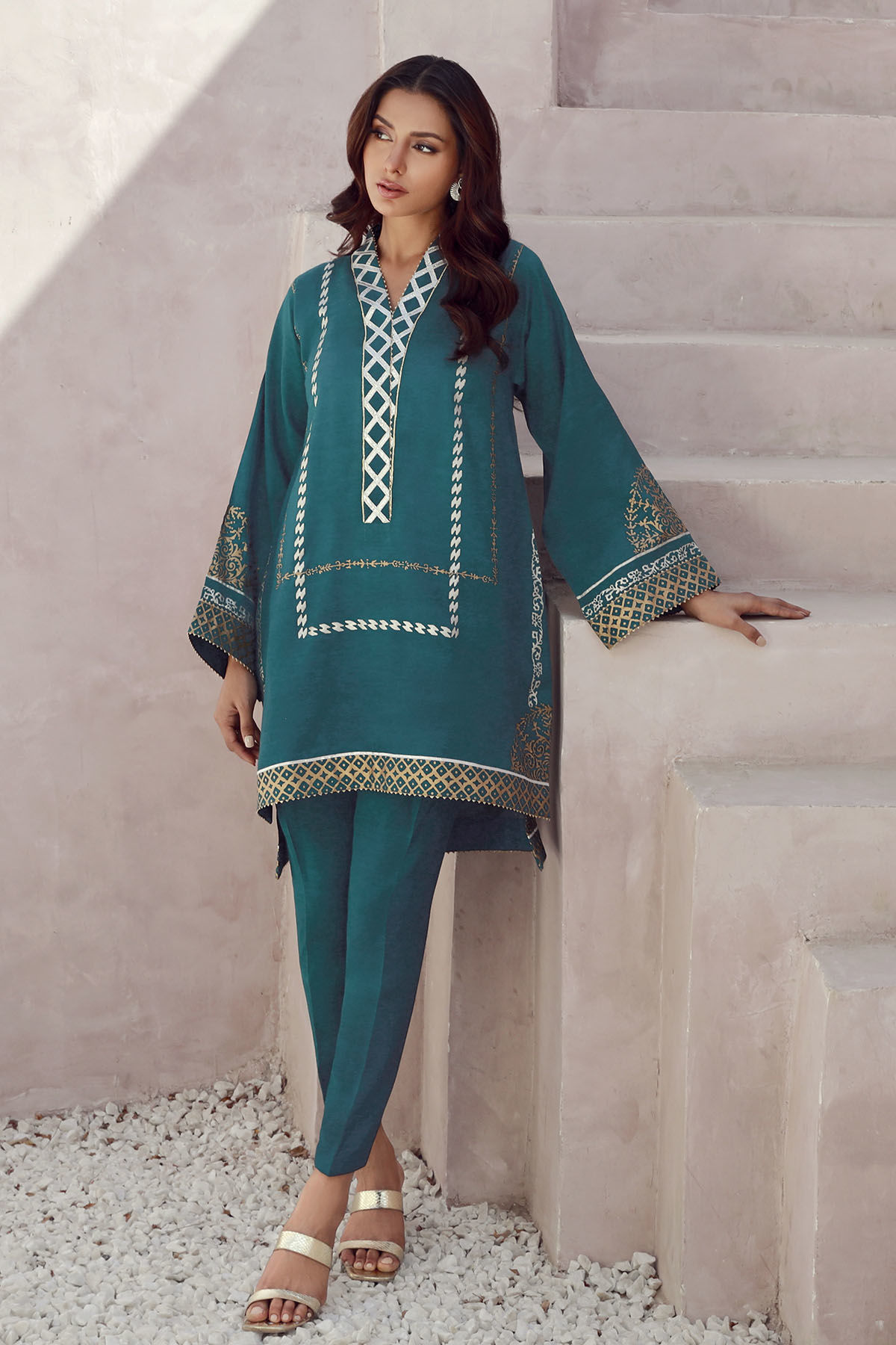 High low silhouette shirt on blended raw silk featuring gold and silver block printed details, the neckline of the shirt is adorned with gota manipulation and the shirt is paired with matching straight raw silk pants.