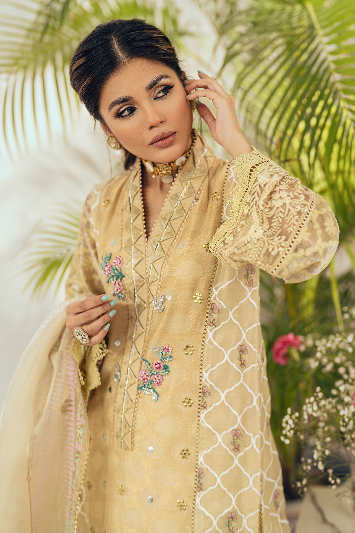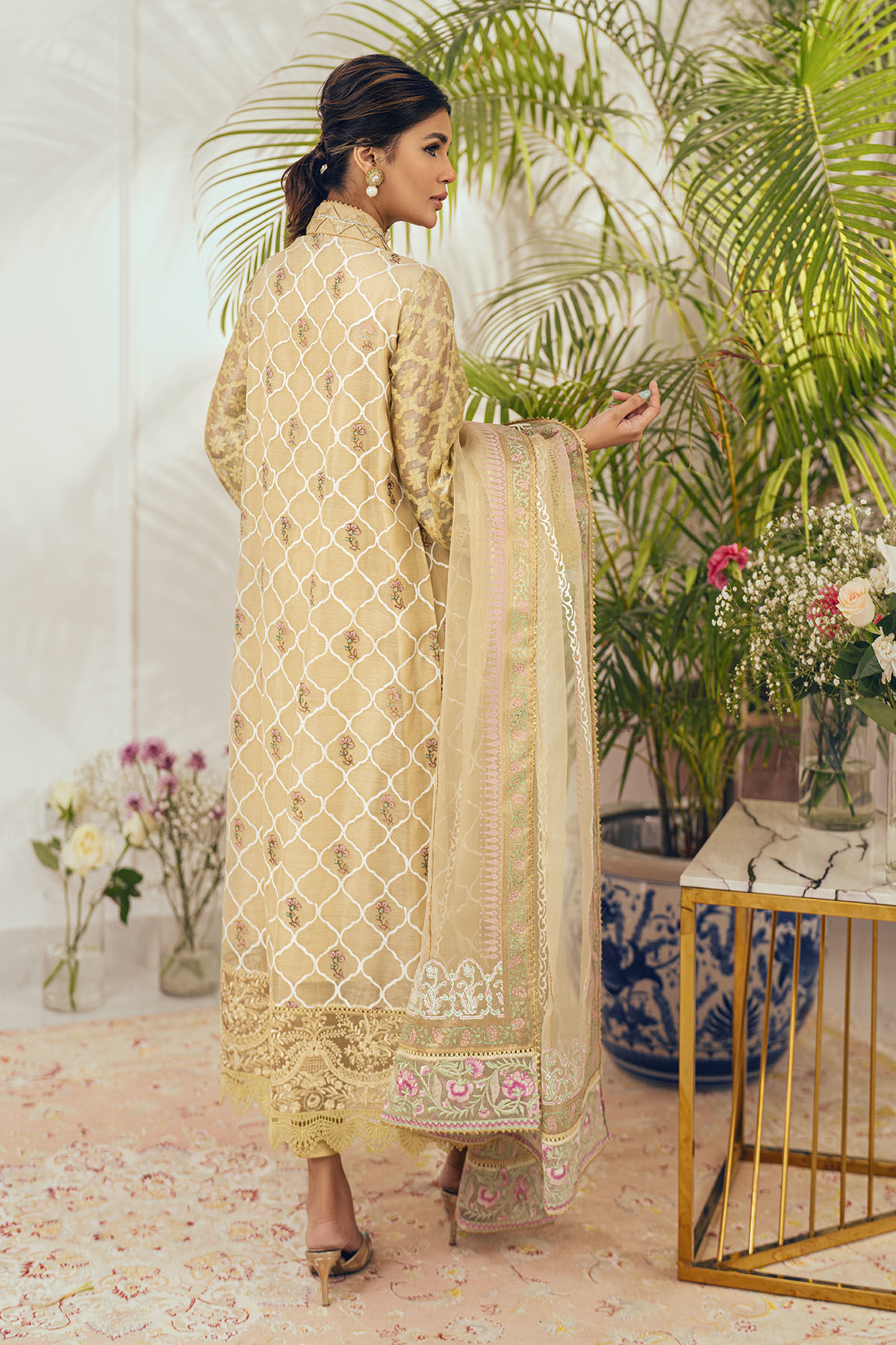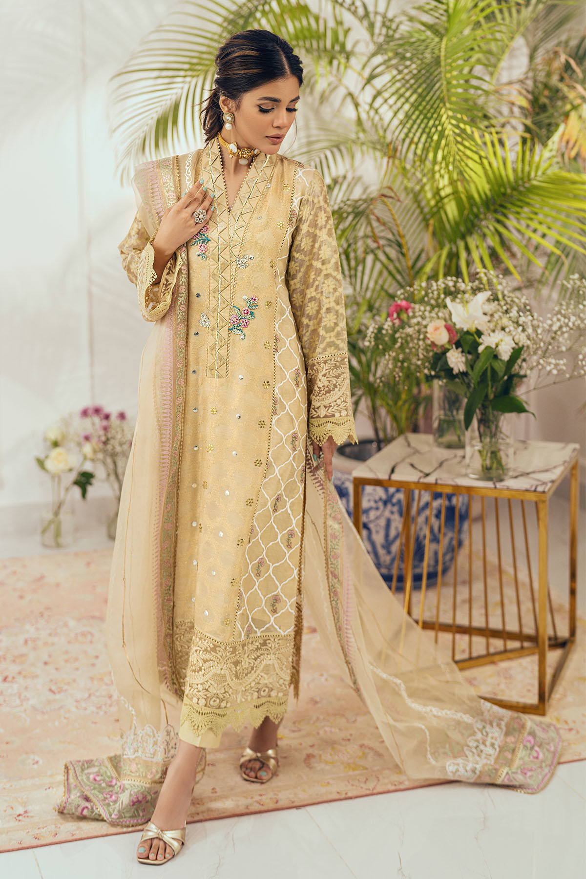 Long silhouette shirt in a stunning shade of gold on zari canvas featuring shimmering details of kaamdani in gold and silver. The hemline is adorned with sequins embroidered organza panel and lamé sleeves are adorned with lace and embroidered organza. The neckline is enhanced with fabric manipulation details along with striking resham rosette and light catching crystals and pearls.