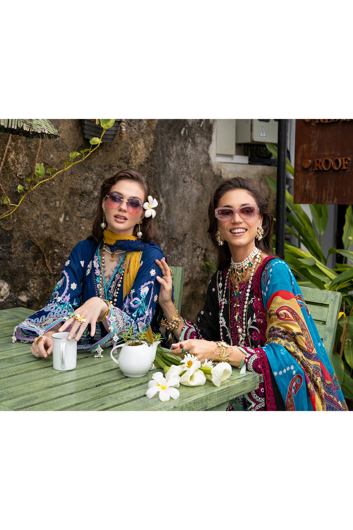 Rendered on a gorgeous turquiose canvas, "Riba" features single thread tone-on-tone miniature floral embroidered details. The side slits and hem are accentuated with cutwork panel details. The esemble is accompanied by breathable lawn bottoms and a gorgeously composed organza dupatta featuring whimsical floral details to set you a part this summer.