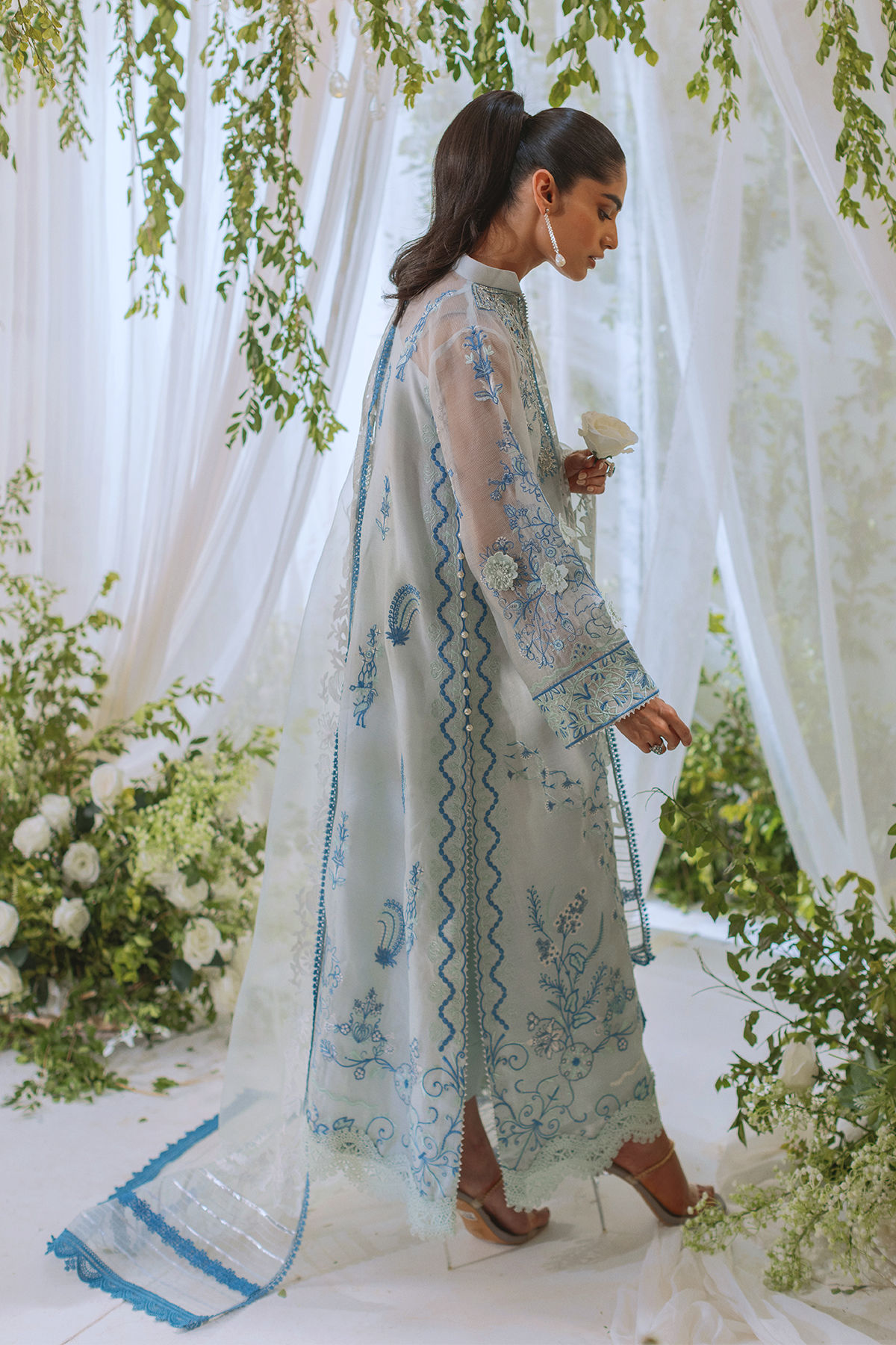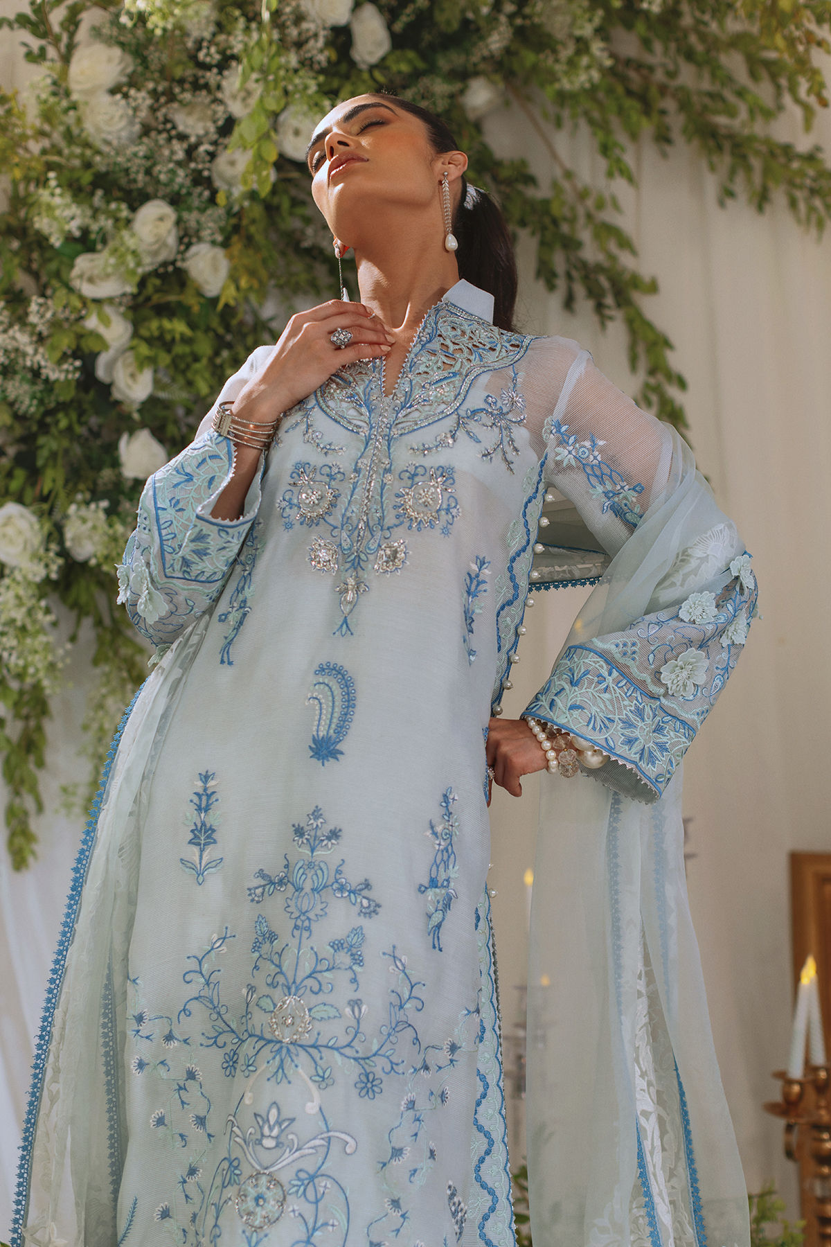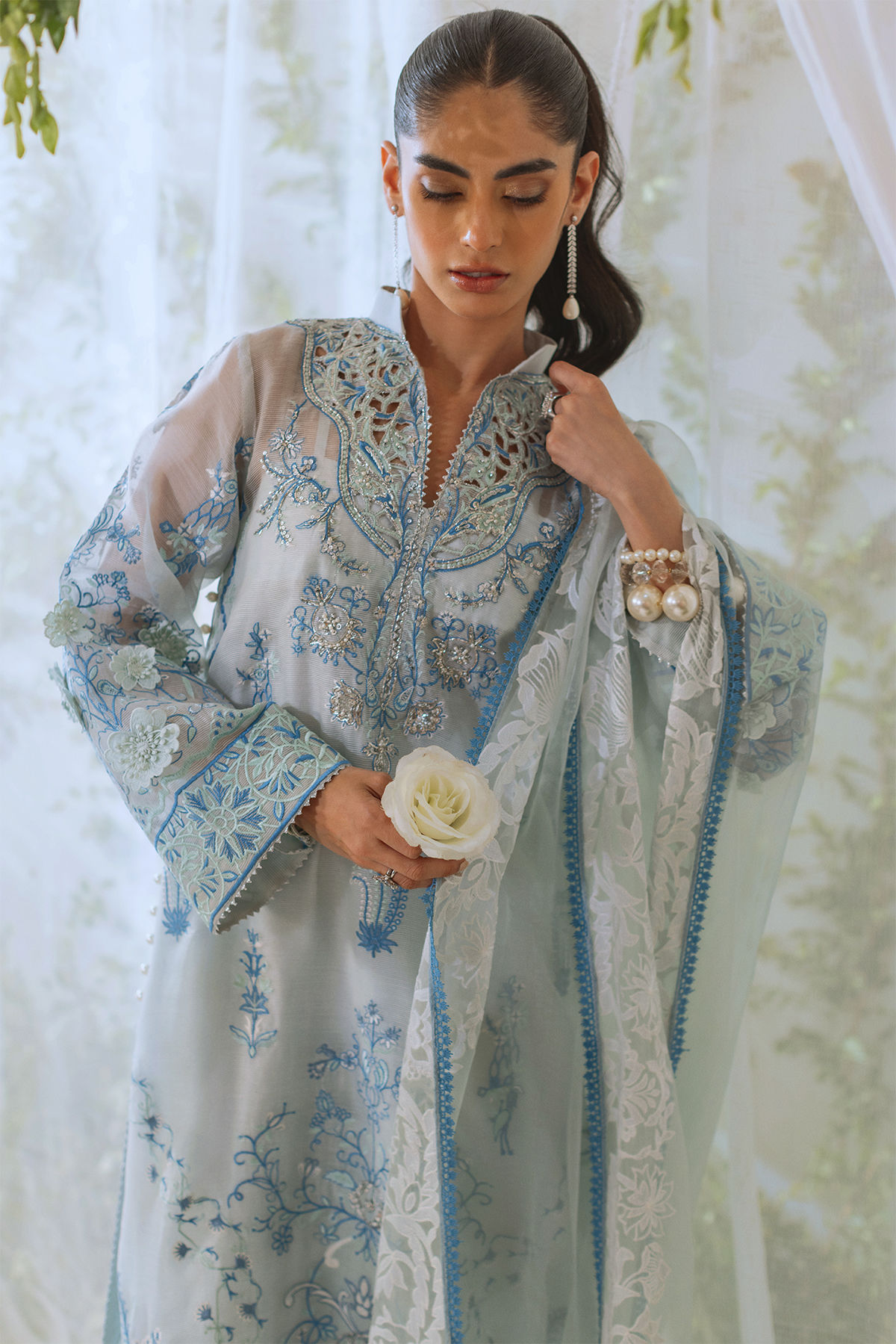 Long silhouette shirt in subtle ice blue canvas featuring cutwork details on neckline which are further adorned with all silver zardozi and pearls. The shirt is adorned with subtle tone on tone embroidered details and 3d appliqué details. The outfit is paired with coordinating organza dupatta and matching raw silk pants to create a festive look.