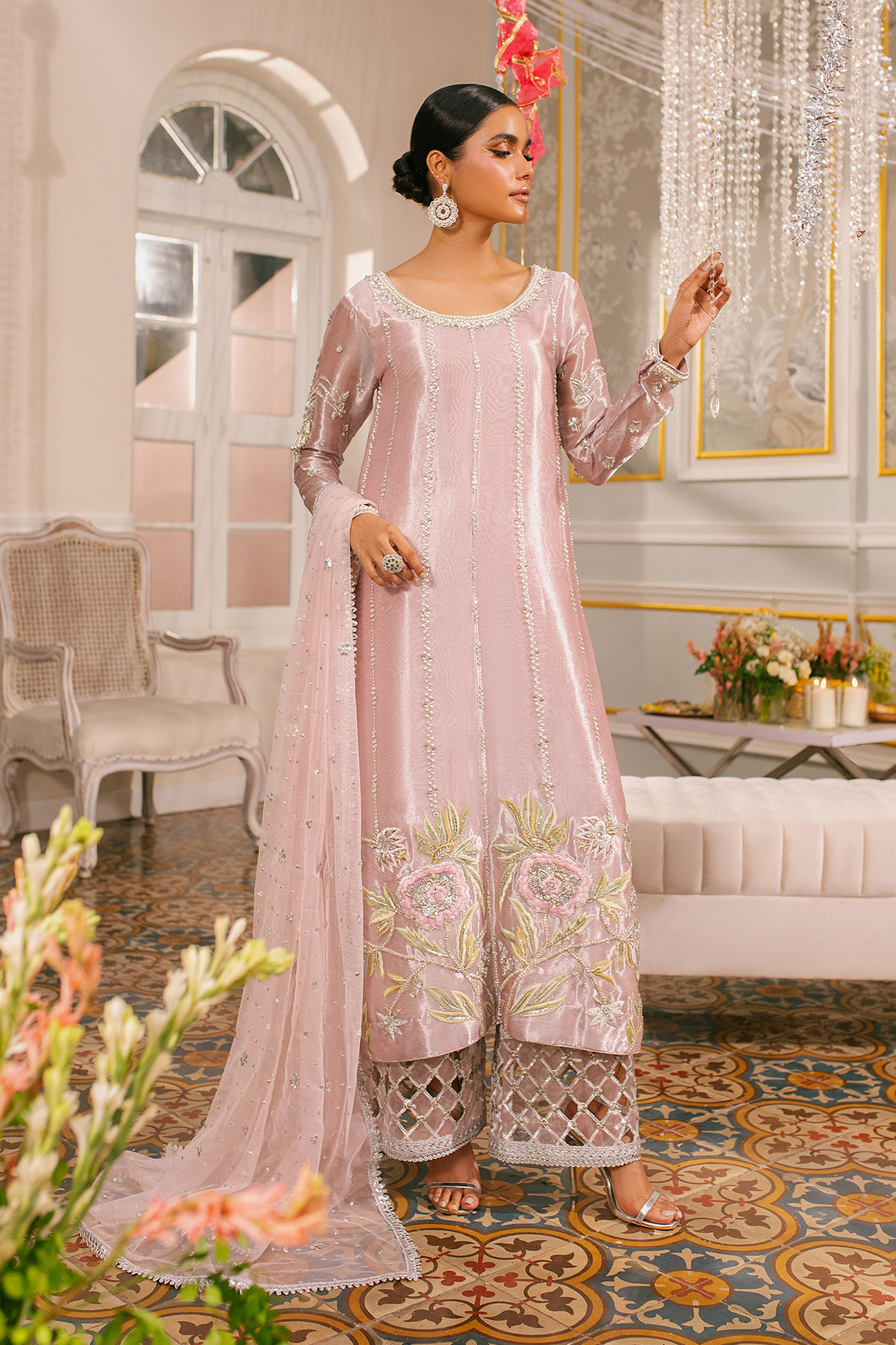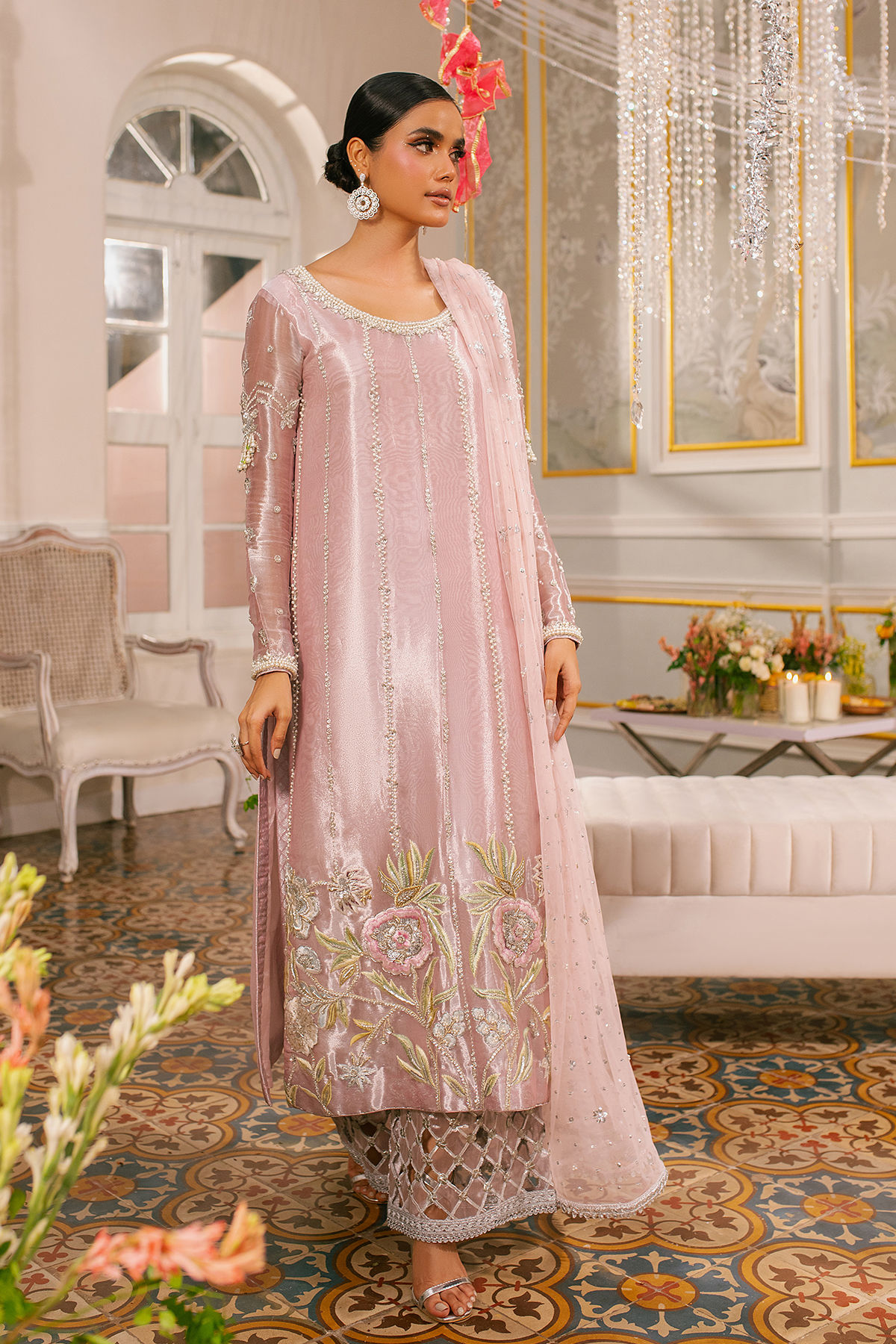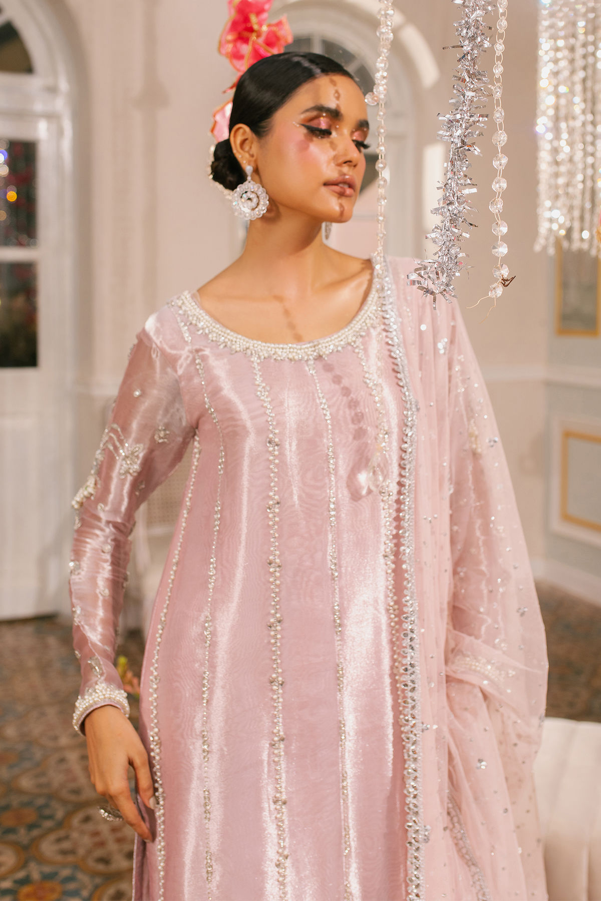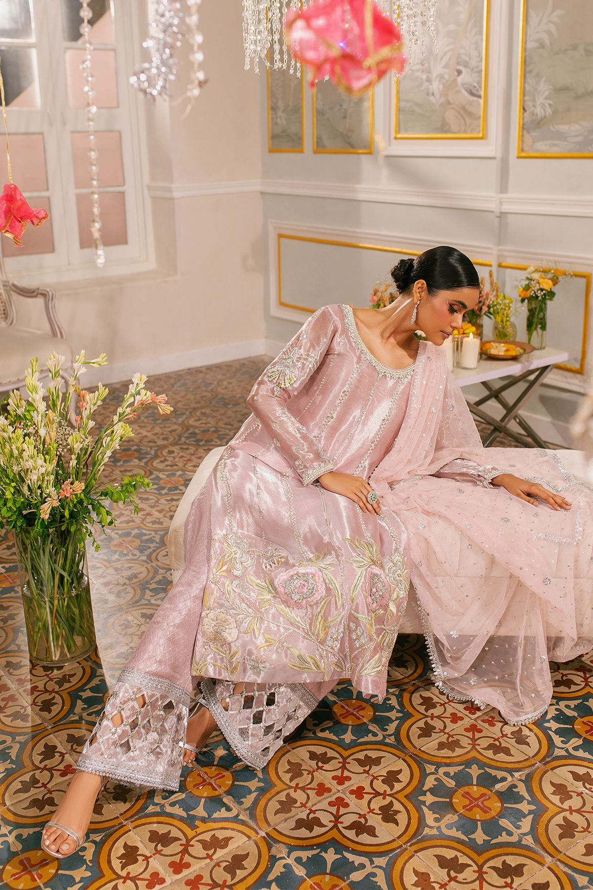 Shimmering details of light catching crystals and whimsical floral embroidered details on metallic soft pink lamé canvas.