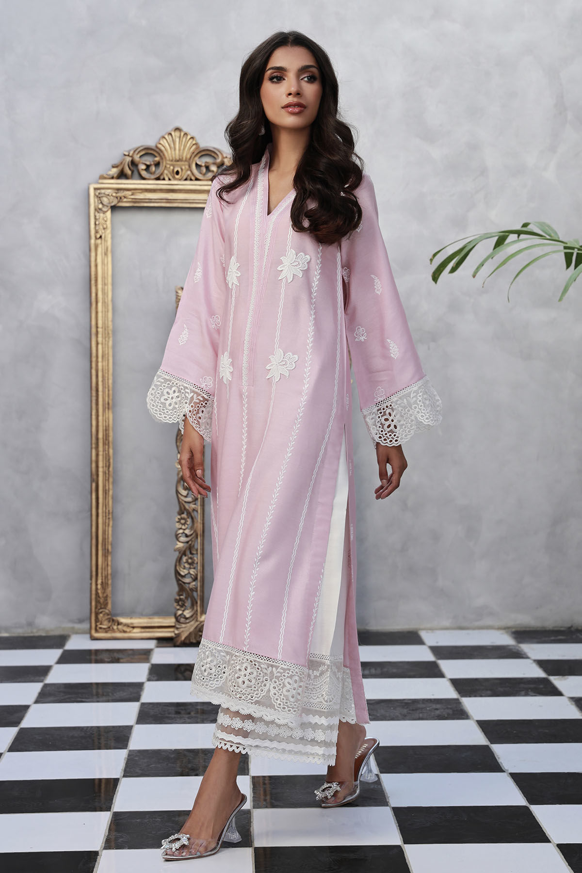 Long silhouette cotton net shirt in soothing chai pink featuring block printed details adorned with crochet appliqué rosettes. The hem of the shirt is enhanced with schiffli details on pure organza. The shirt can be paired with AA signature Izaar featuring crochet laces on pure organza panel.