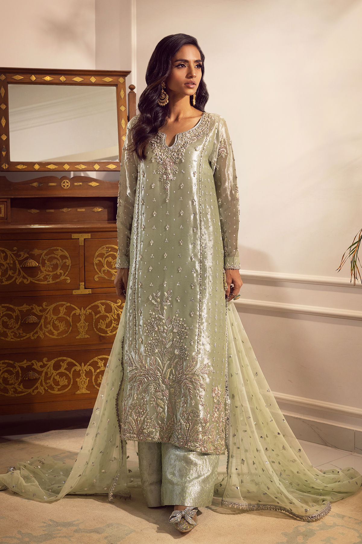 Long silhouette shirt crafted in a subtle mint hue on a glistening lamé canvas, elegantly featuring muted silk thread embroidery in matching tones and delicate peach accents. The silk thread rosettes are further embellished with zardozi work and light-catching crystals and pearls, rendering it an impeccable selection for the festive season. The side slits of the shirt are tastefully adorned with intricately dangling tassel details. This shirt may be elegantly paired with loose silhouette trousers and a net dupatta, which is enhanced with sequins and lace finishing.