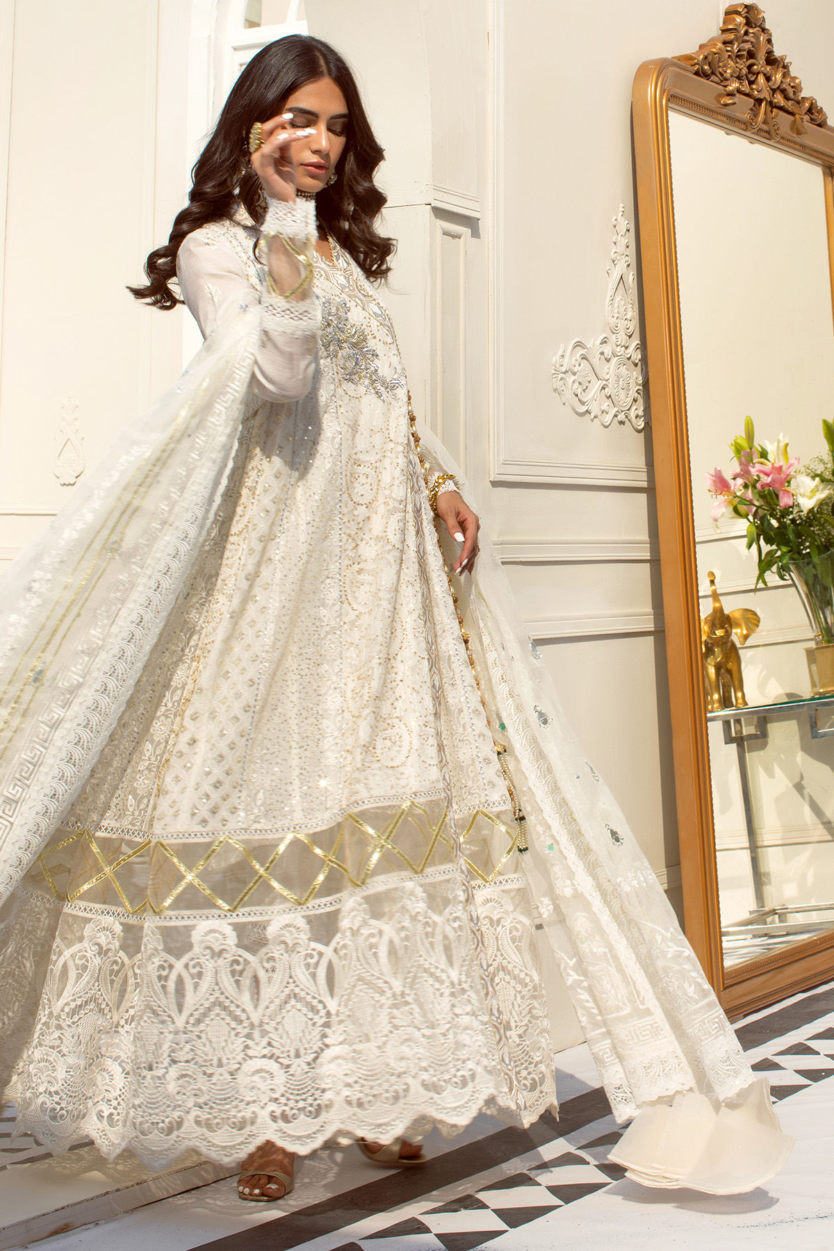Flared silhouette angharka in pristine white featuring different patterns of chikankari in each panel on pure chiffon canvas. The hemline of the angharka is enhanced with gota and embossed organza borders. The angharka is adorned with beautifully placed motif on front and handcrafted dangling signature AA tassels.