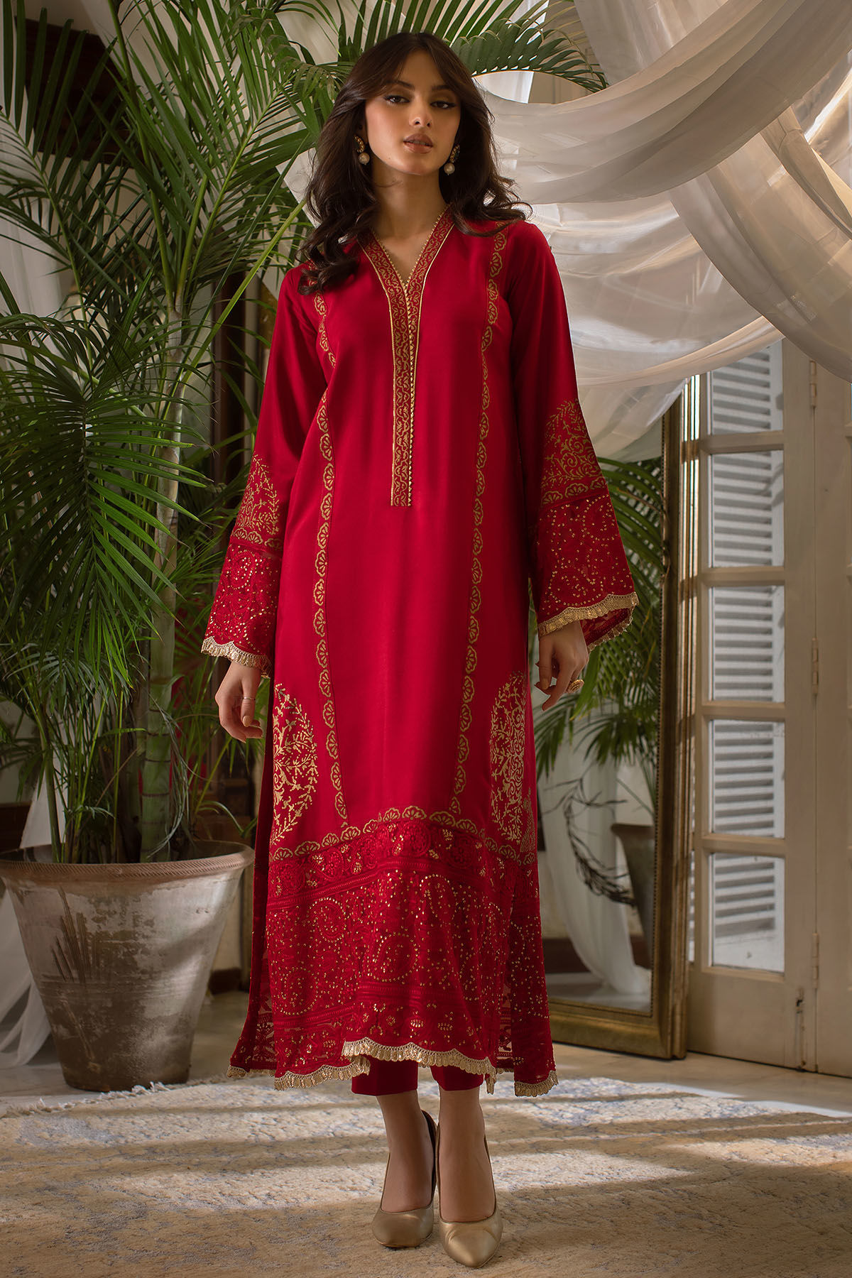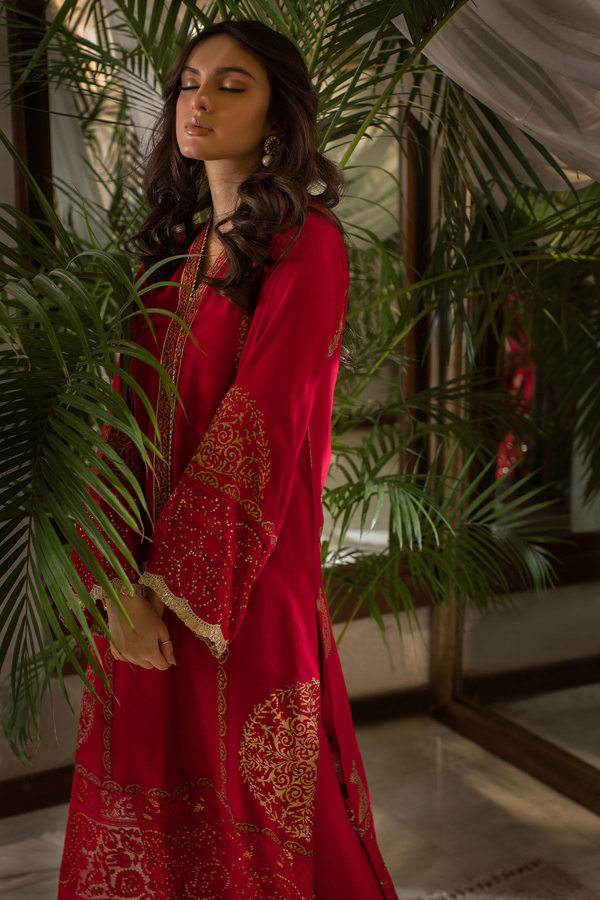 Long silhouette cotton net shirt in a gorgeous shade of bright red featuring hand block printed details in gold. The neckline is adorned with gota details and the hem is enhanced with chikankari and sequins panel which is finished with gold festive lace.