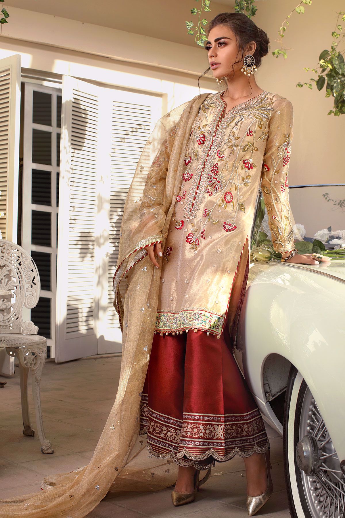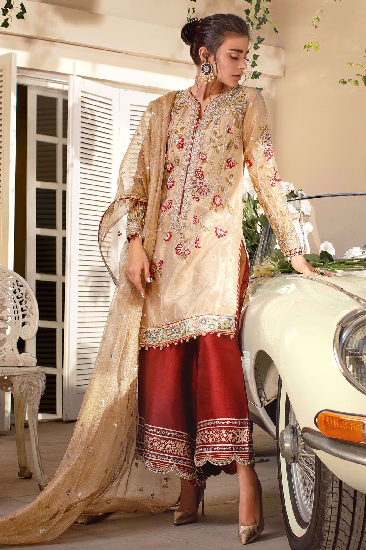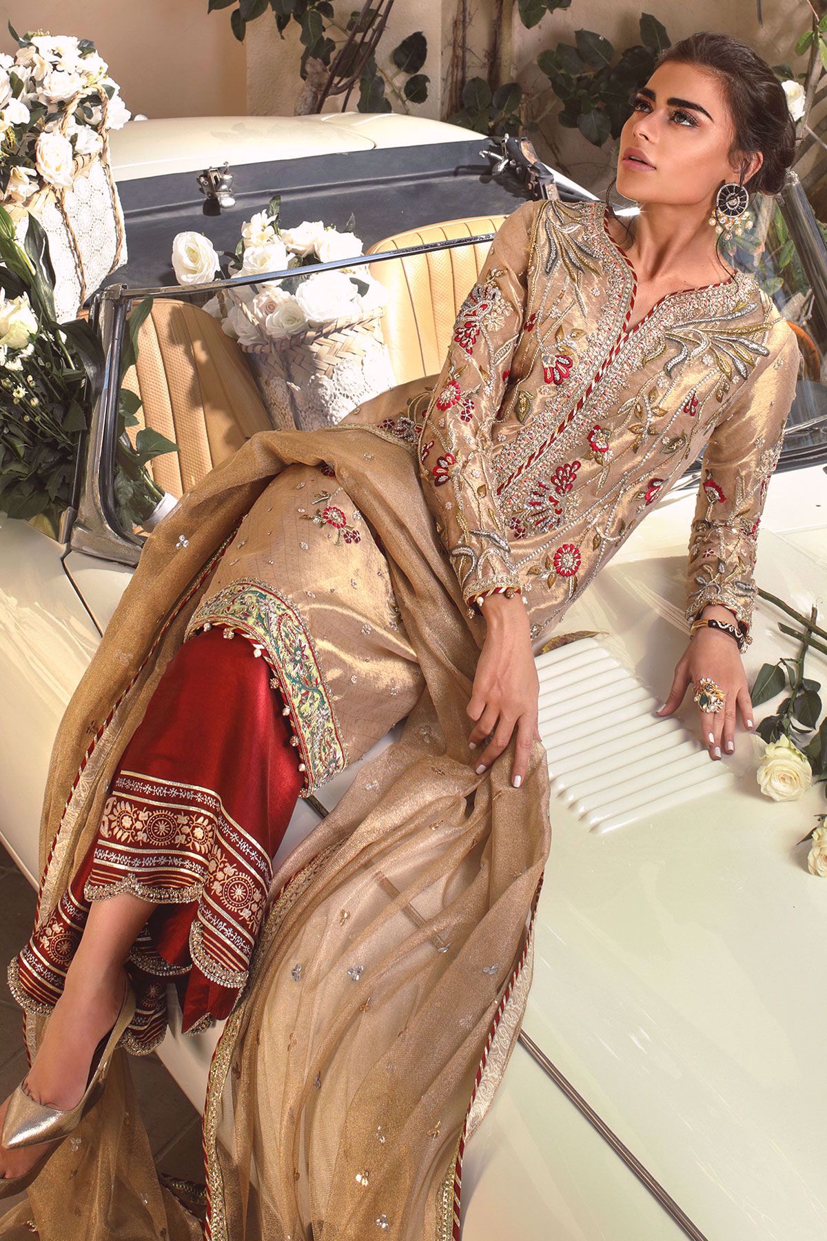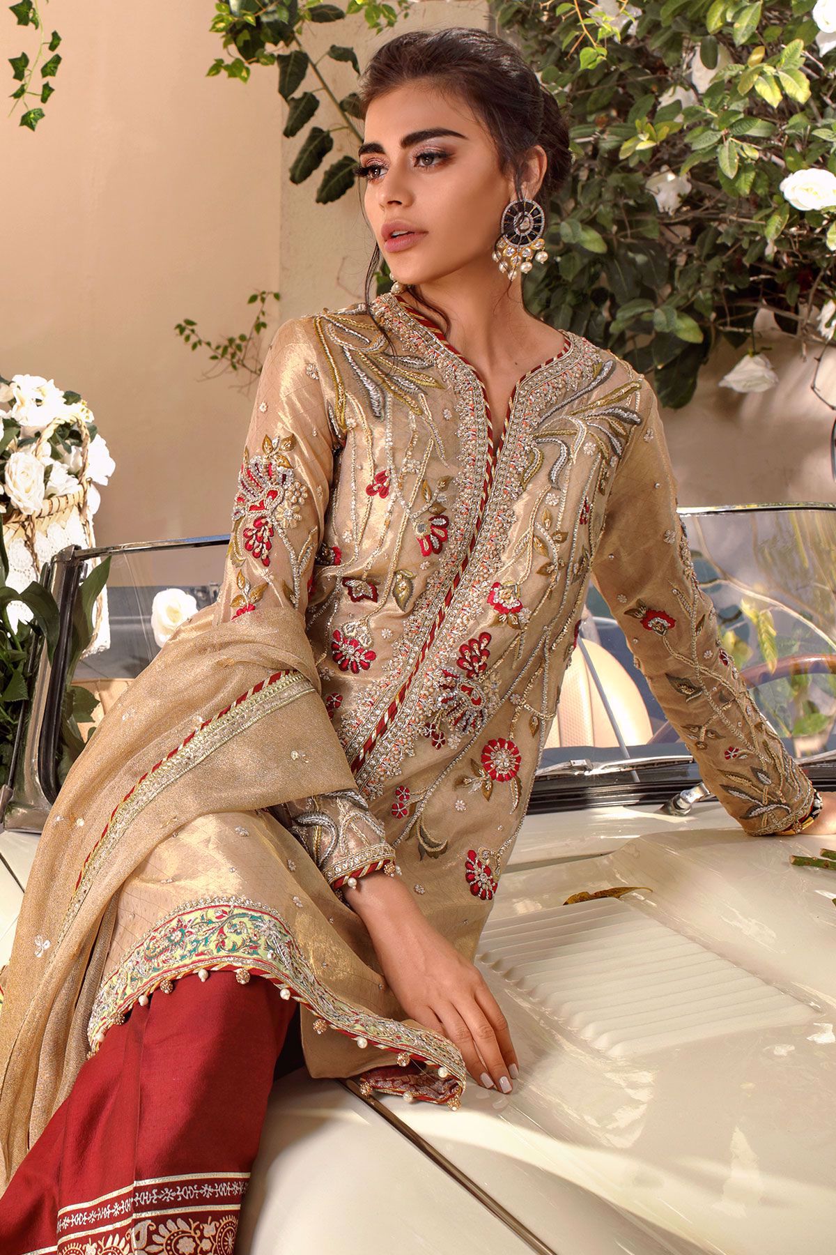 Straight silhouette Lamé gold shirt with opulent floral details in shades of scarlet and deep maroon which is enhanced with hand embroidered techniques of old school era. The shirt is paired with deep maroon izar with hand block printed details which are enhanced with hand embroidered scalloped hemline of dabka, kora sequins and swarovski’s. This ensemble is paired with dull gold handloom dupatta with sequins and crystals.