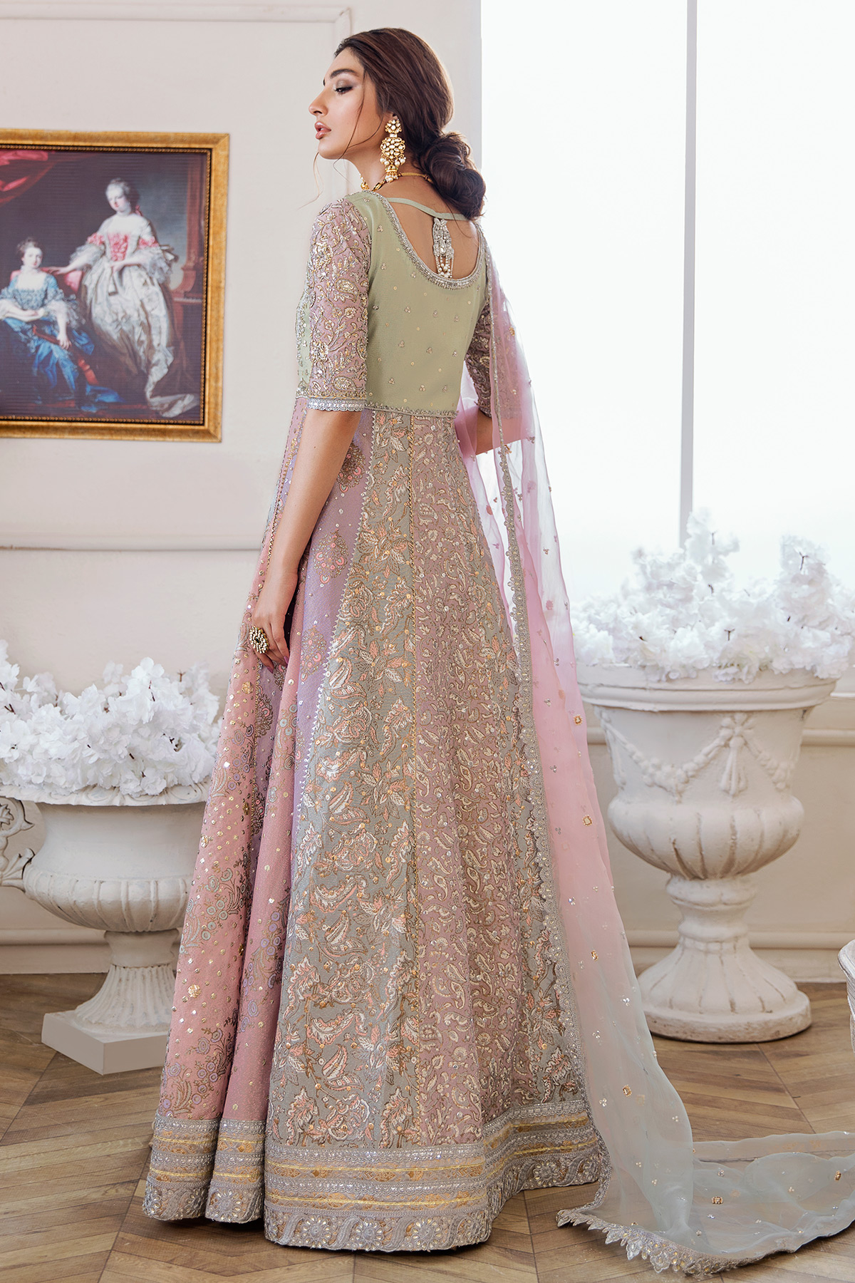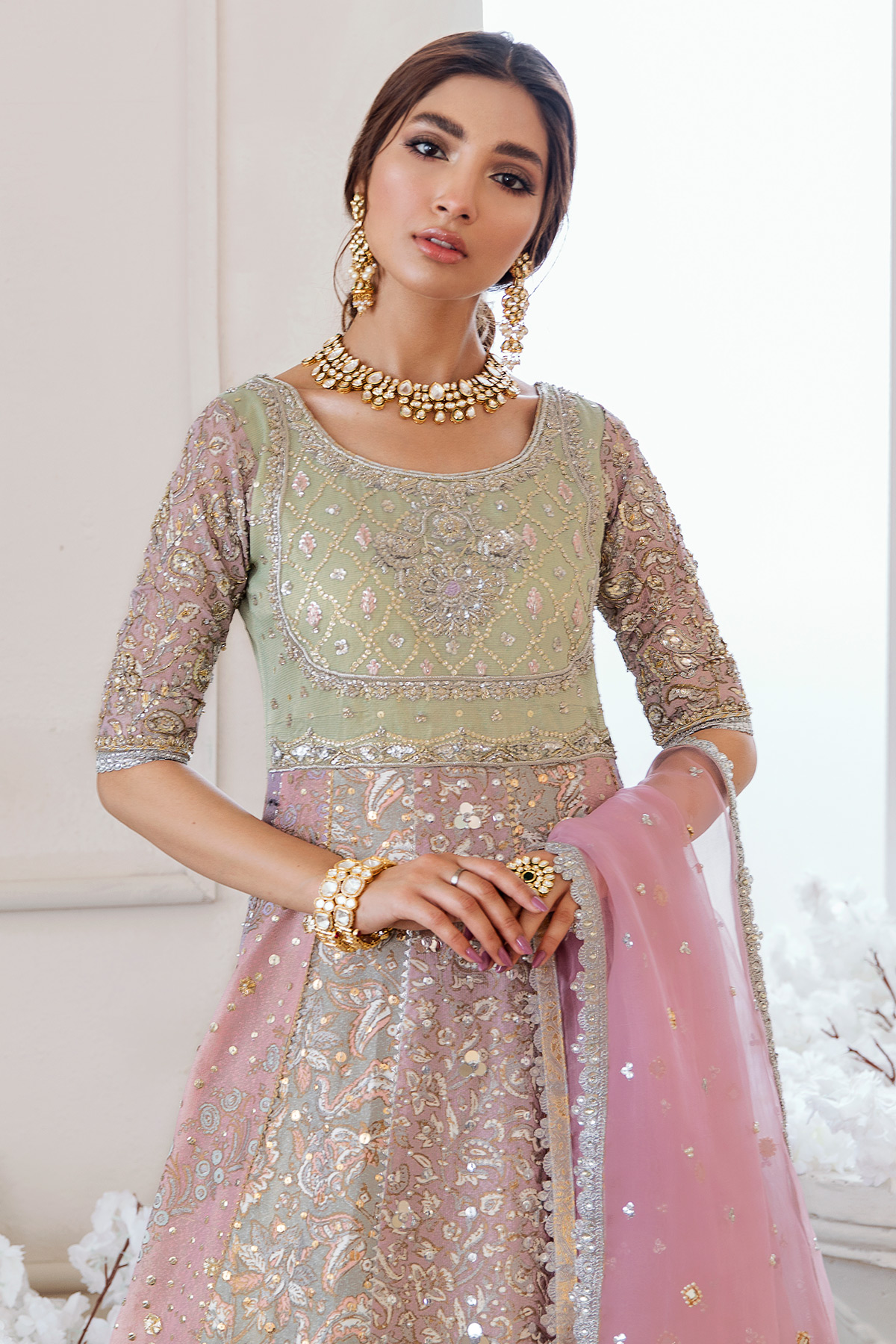 The pishwas can be paired with gold dhaka and an ombre dupatta featuring sheesha, pearls and sequins embroidered details.