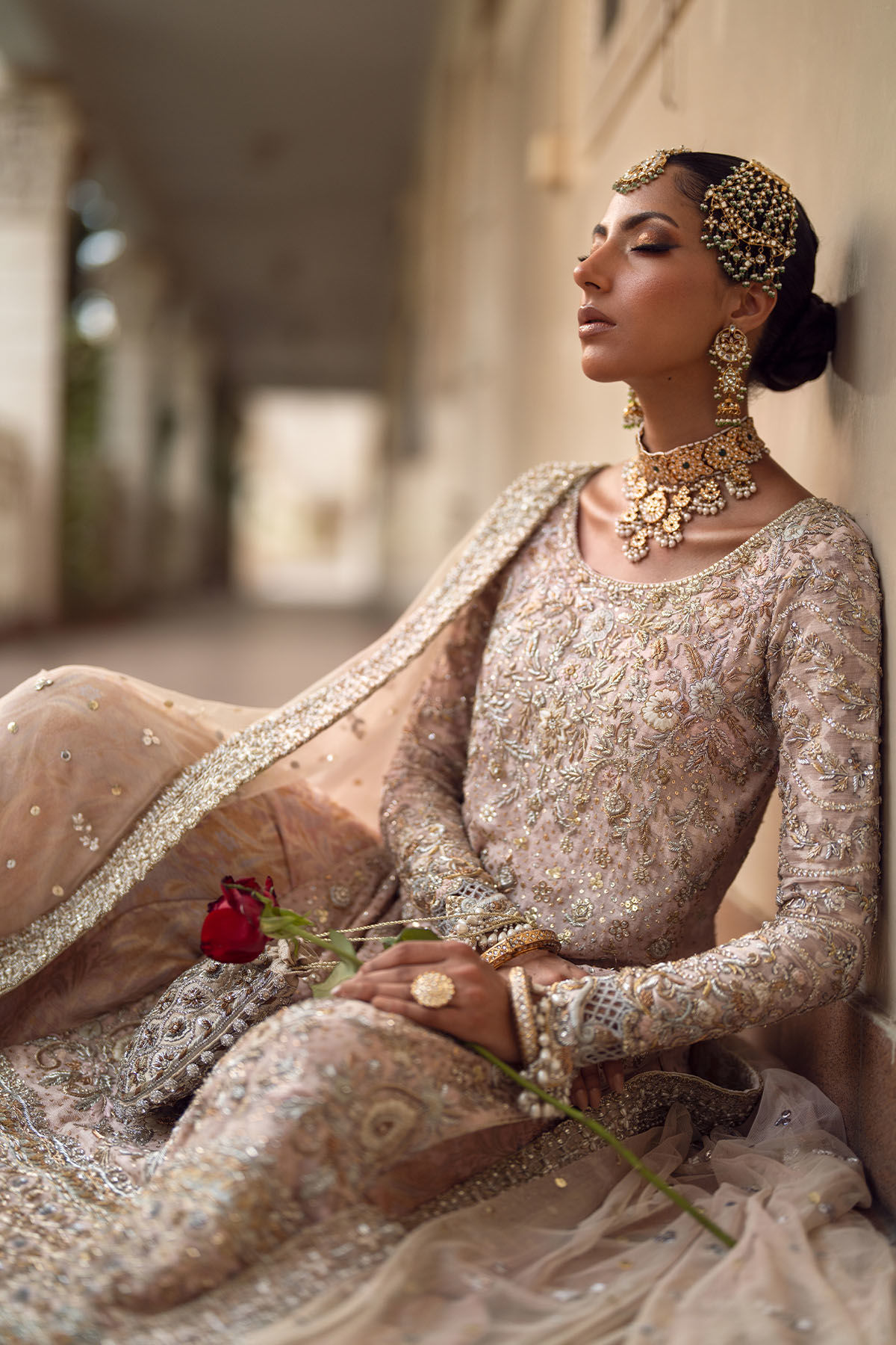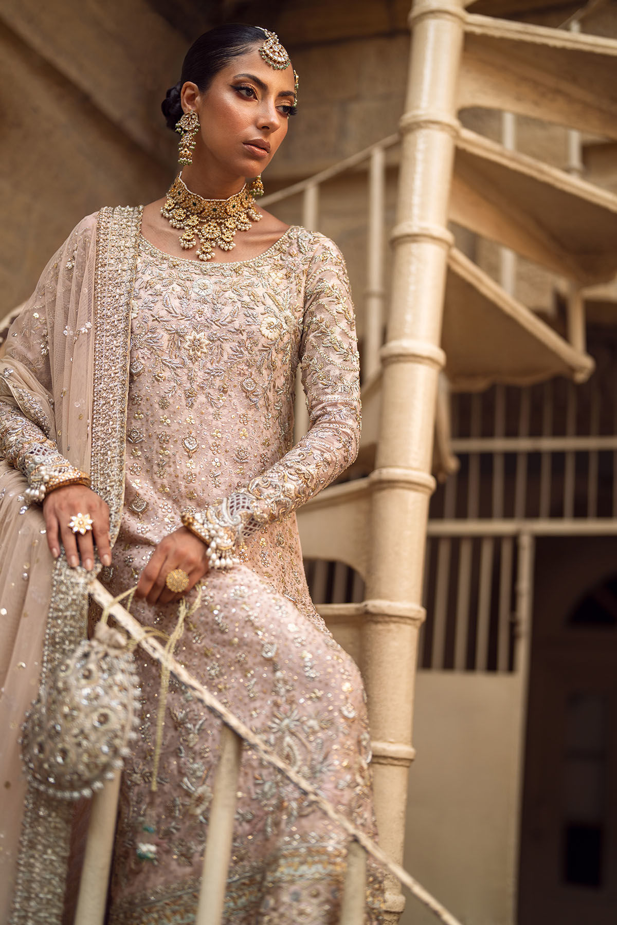 Showcases traditional zardozi detailing on a subtle shade of salmon pink cotton net canvas adorned with intricate single dhaga resham rosettes. The antique zardozi embellishments are further accentuated with light-catching crystals and sequins. Completing the ensemble is a biscotti net dupatta featuring zardozi borders all over, paired with a two-legged damask dhaka featuring aari and zardozi border on the hemline