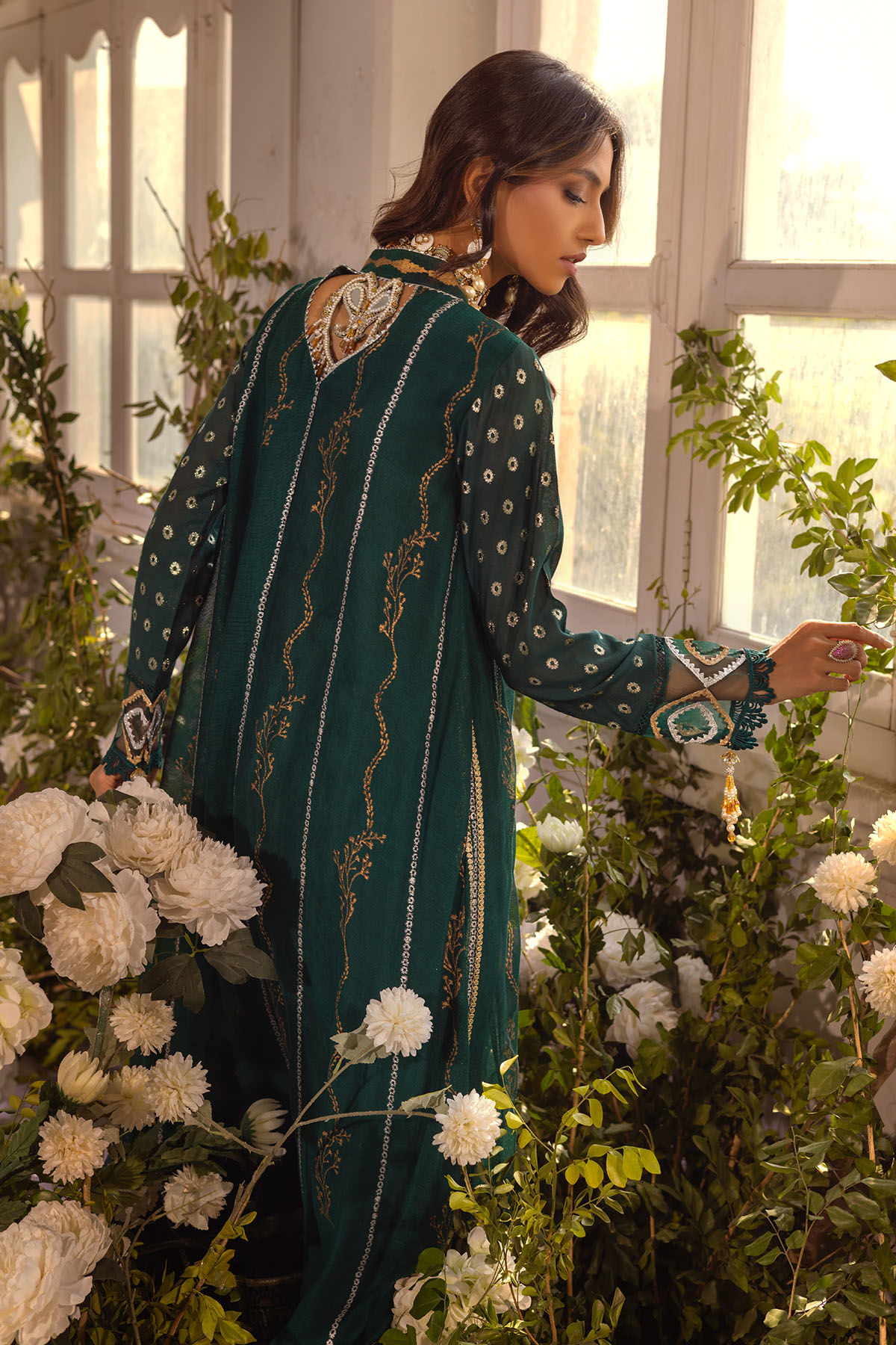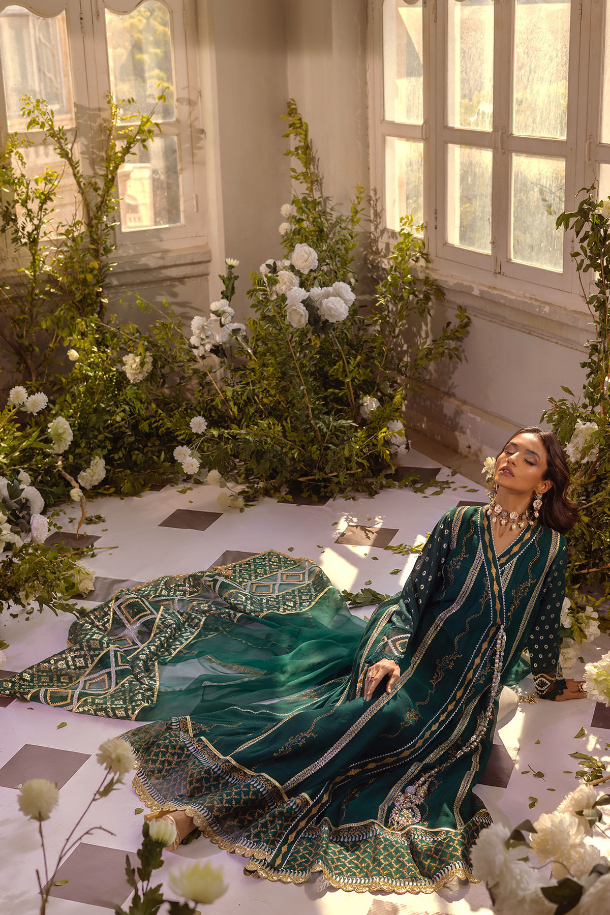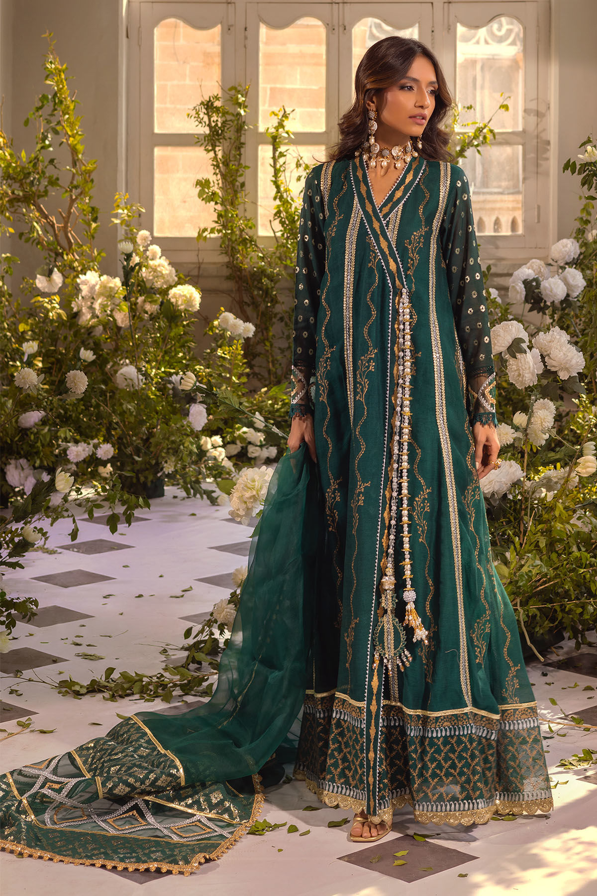 Floor length angharka on pure silk net canvas in gorgeous emerald shade featuring hand block printed details in silver and gold, each kali is further adorned with zari embroidered details and the centre front of the angharka is enhanced with handcrafted kundan tassels featuring pearls and crystal dangling’s. The angharka can be paired with matching organza dupatta featuring gota and block printed details. The outfit is paired with matching raw silk pants.