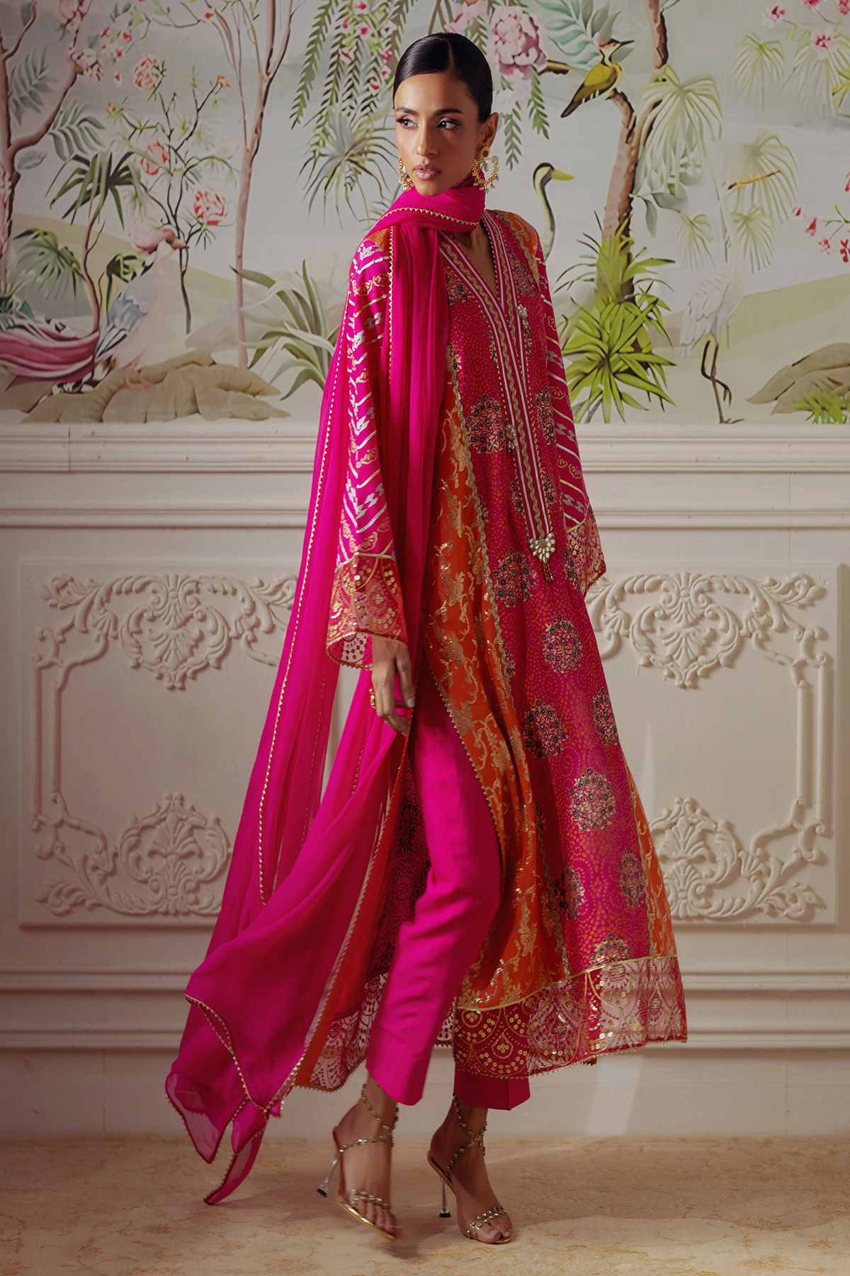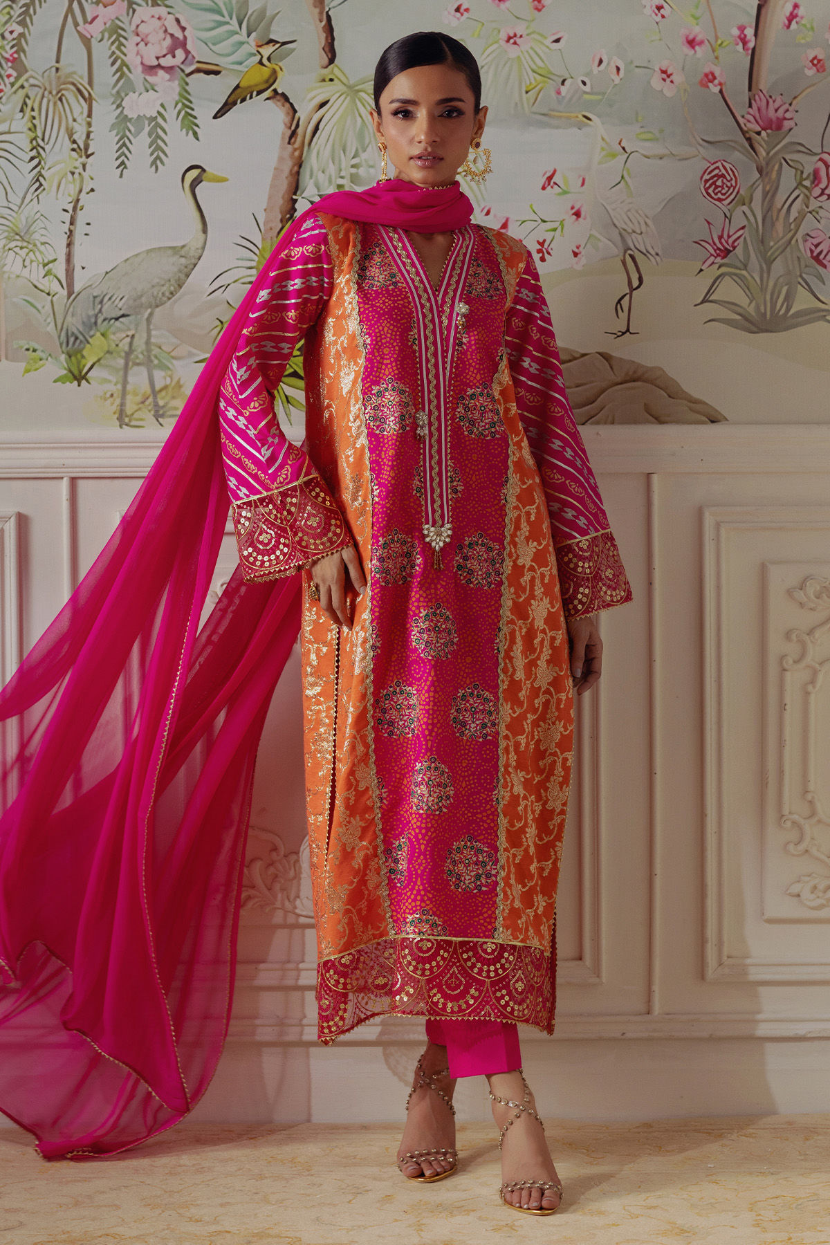 A long silhouette shirt in a rich fuchsia and tangerine hue, elegantly featuring shimmering Lorex panels and meticulously hand block printed details. The neckline is adorned with intricate gota manipulations. This ensemble is complemented by a matching chiffon dupatta and straight-cut pants, creating a harmonious and sophisticated look.