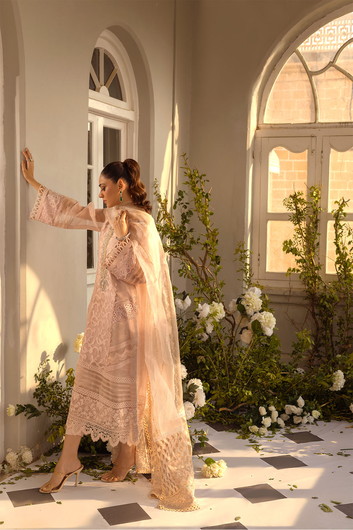 Long silhouette shirt on embossed silk net canvas featuring zardozi detailed neckline. The side panels of the shirt are adorned with schiffli details, lace and pleats details. The hemline is adorned with light catching sequins embossed organza. The shirt can be paired with hand block printed organza dupatta and straight matching raw silk pants.