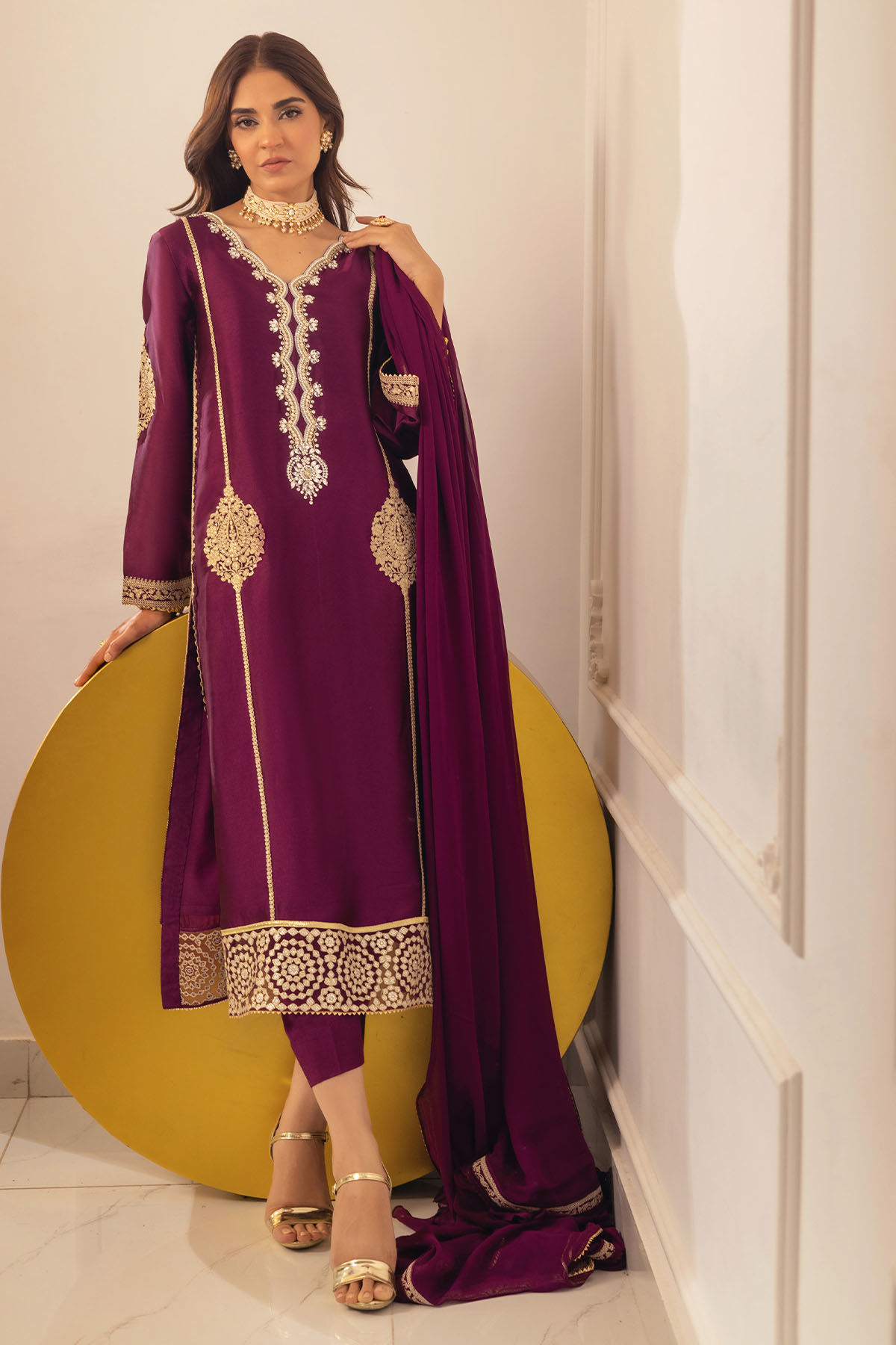 Long silhouette shirt on pure sheesha silk featuring handcrafted zardozi and aari details on neckline. The centre front, back and sleeves are adorned with zari appliqué details. The shirt comes with chiffon dupatta featuring ruffles and embroidered zari borders on each pallu. The shirt can be paired with matching raw silk pants to create a festive look.