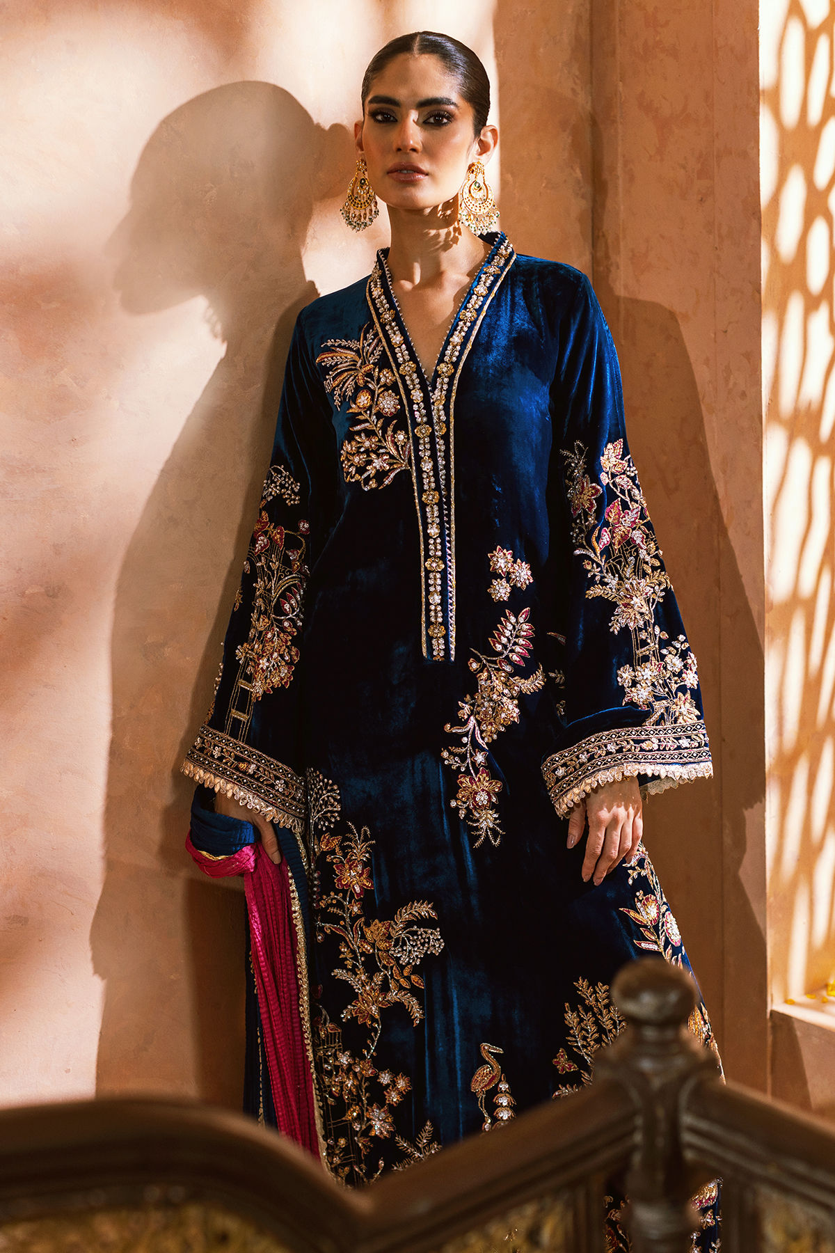 Long silhouette shirt in two-tone velvet, presented in a magnificent lapis blue, showcasing intricate floral and fauna imagery at the center front. The imagery is artfully enhanced with handcrafted zardozi details in silver, gold, and antique finishes, complemented by light-reflecting sequins. This ensemble is accompanied by a color-blocked crushed dupatta and matching raw silk pants, designed to evoke a festive appearance.
