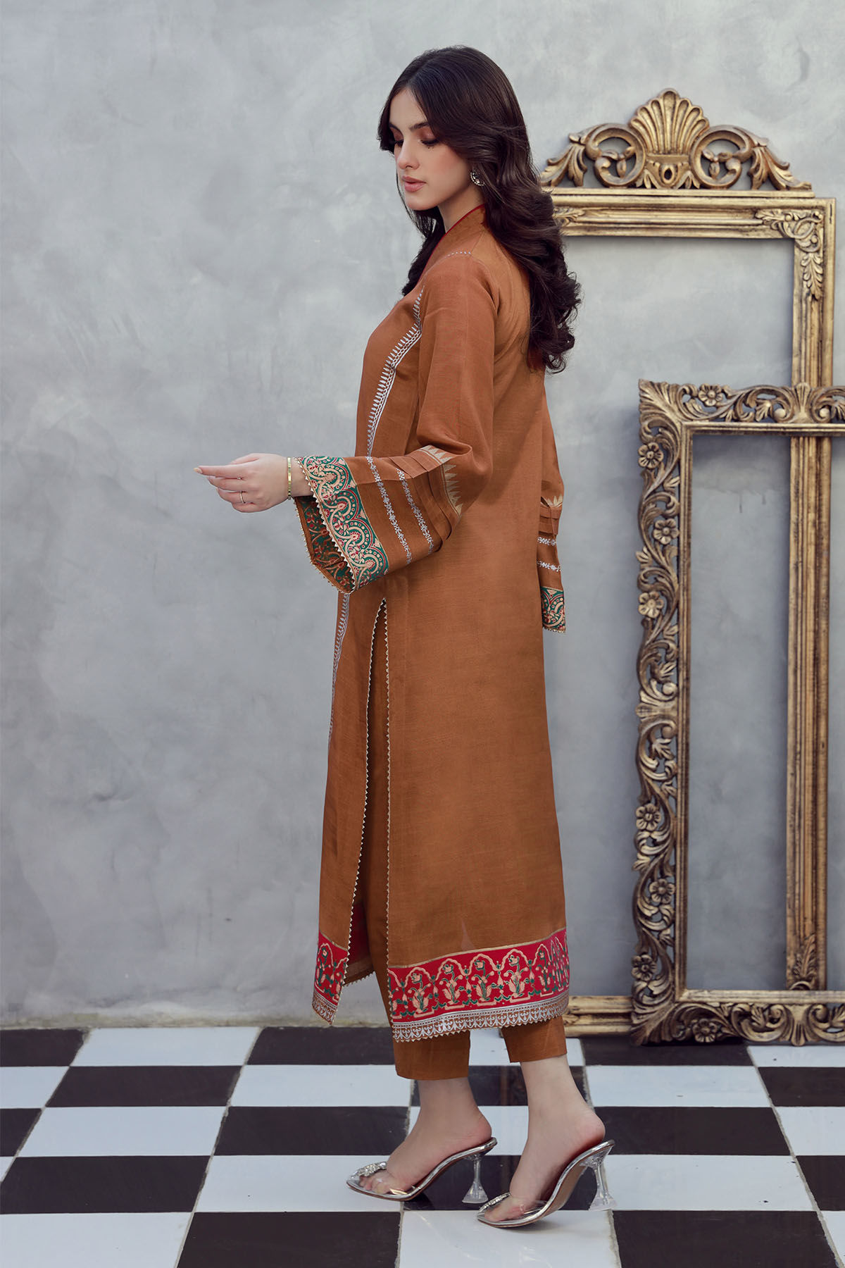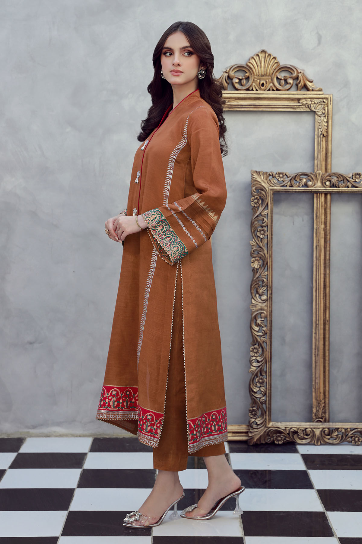 Long silhouette shirt on blended raw silk featuring hand block printed details. The neckline is adorned with handcrafted pearl embellishments. The shirt can be paired with matching raw silk pants to create more festive look.