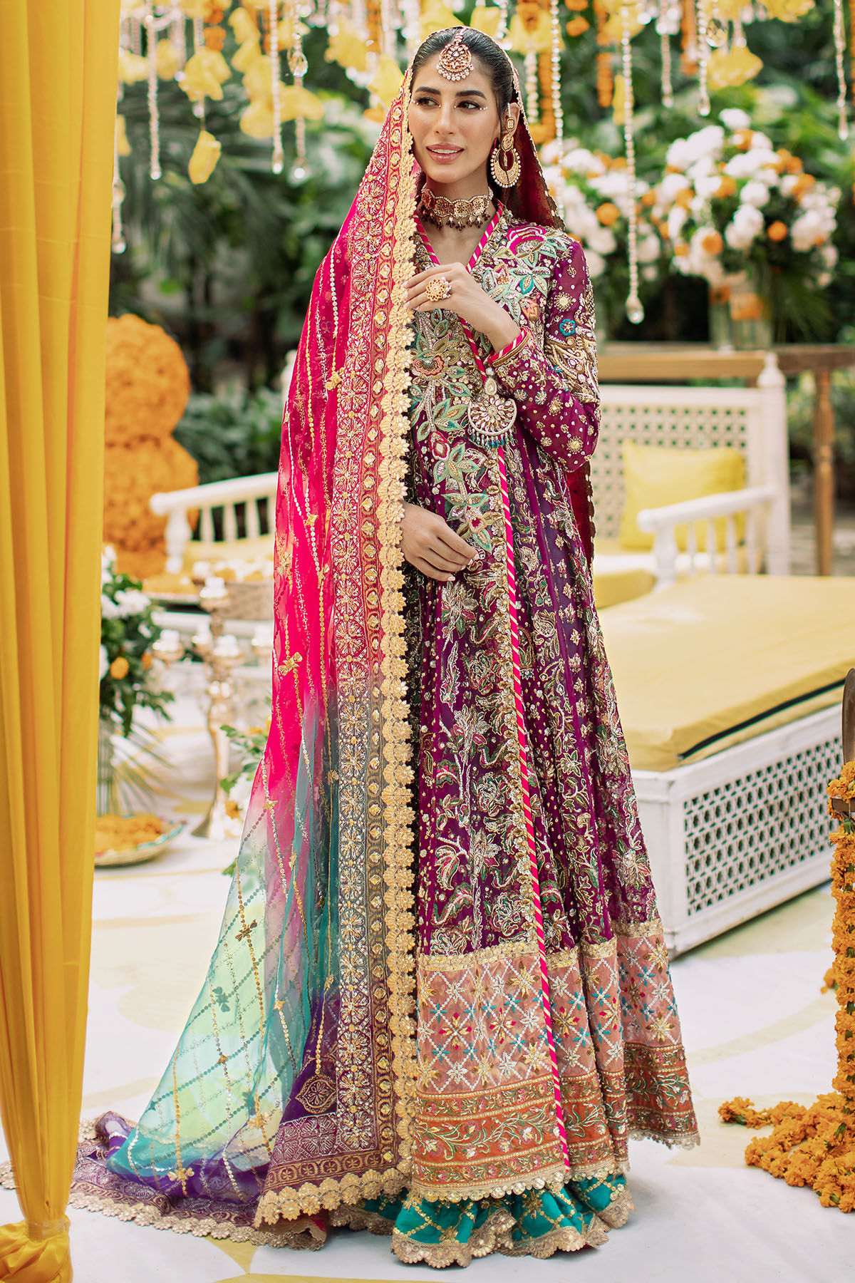 Long silhouette angharka in deep cranberry shade on pure silk net featuring hand block printed details on each panels which are enhanced with zardozi and sequins. The angharka is paired with ombré hand block printed dupatta with zarodzi borders and lace details. The angharka is paired with aquamarine raw silk dhaka featuring gota and sequins details.