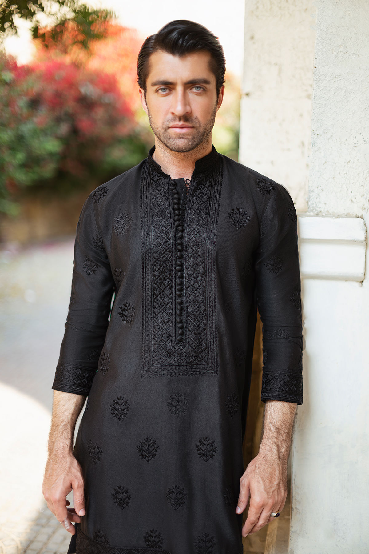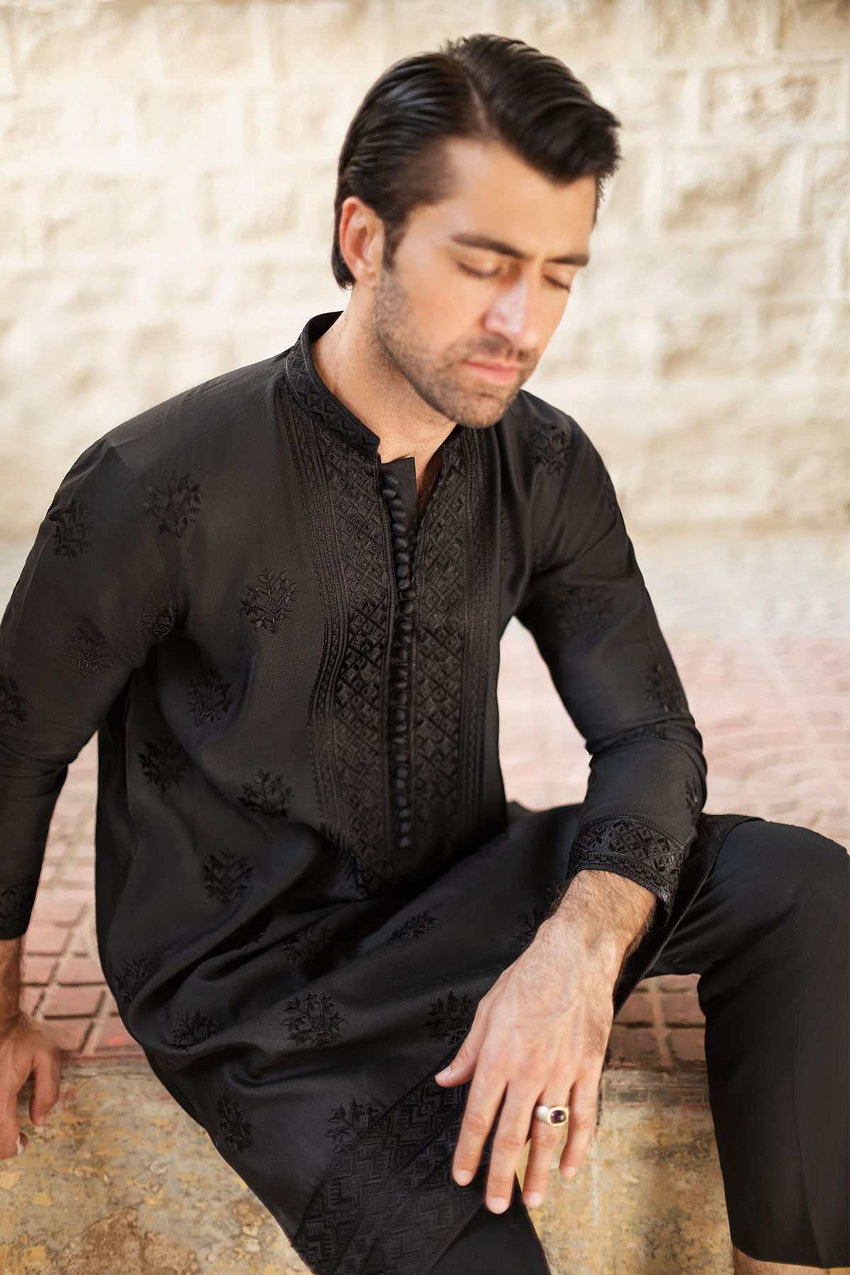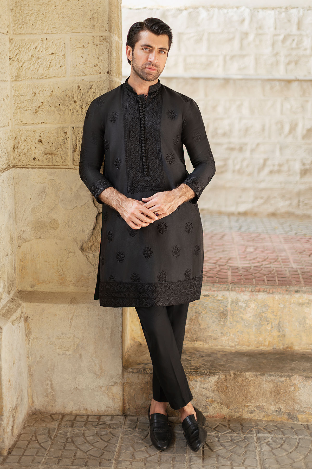 Pristine black kurta featuring self embroidered details on neckline and hem . The neckline of the kurta is adorned with loops and handcrafted buttons. The kurta can be paired with straight cotton pants.