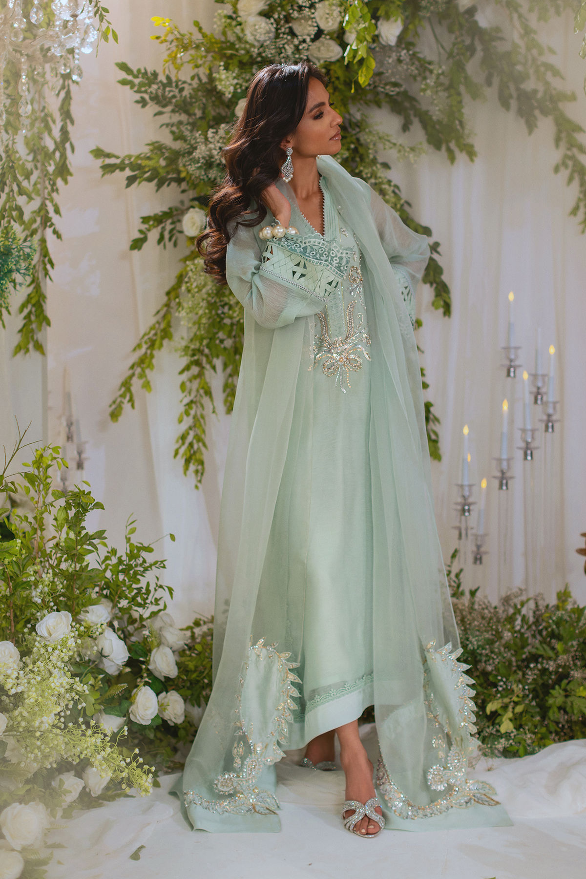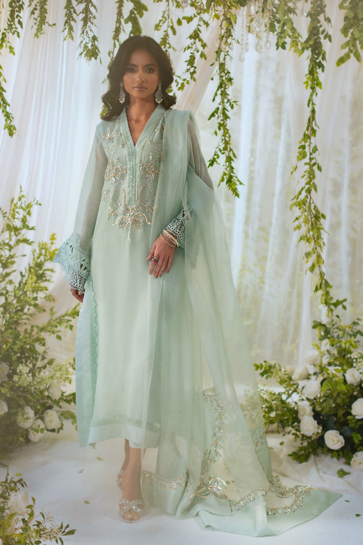 Long silhouette shirt on pure silk net in subtle ice mint shade featuring all silver handcrafted embroidered details on neckline. The neckline is further decorated with fabric manipulation and running stitch details. The side slits are adorned with silk and lace finishings. The outfit is paired with organza dupatta featuring appliqué details adorned with handcrafted zardozi. The shirt comes with straight pants to create a festive look.