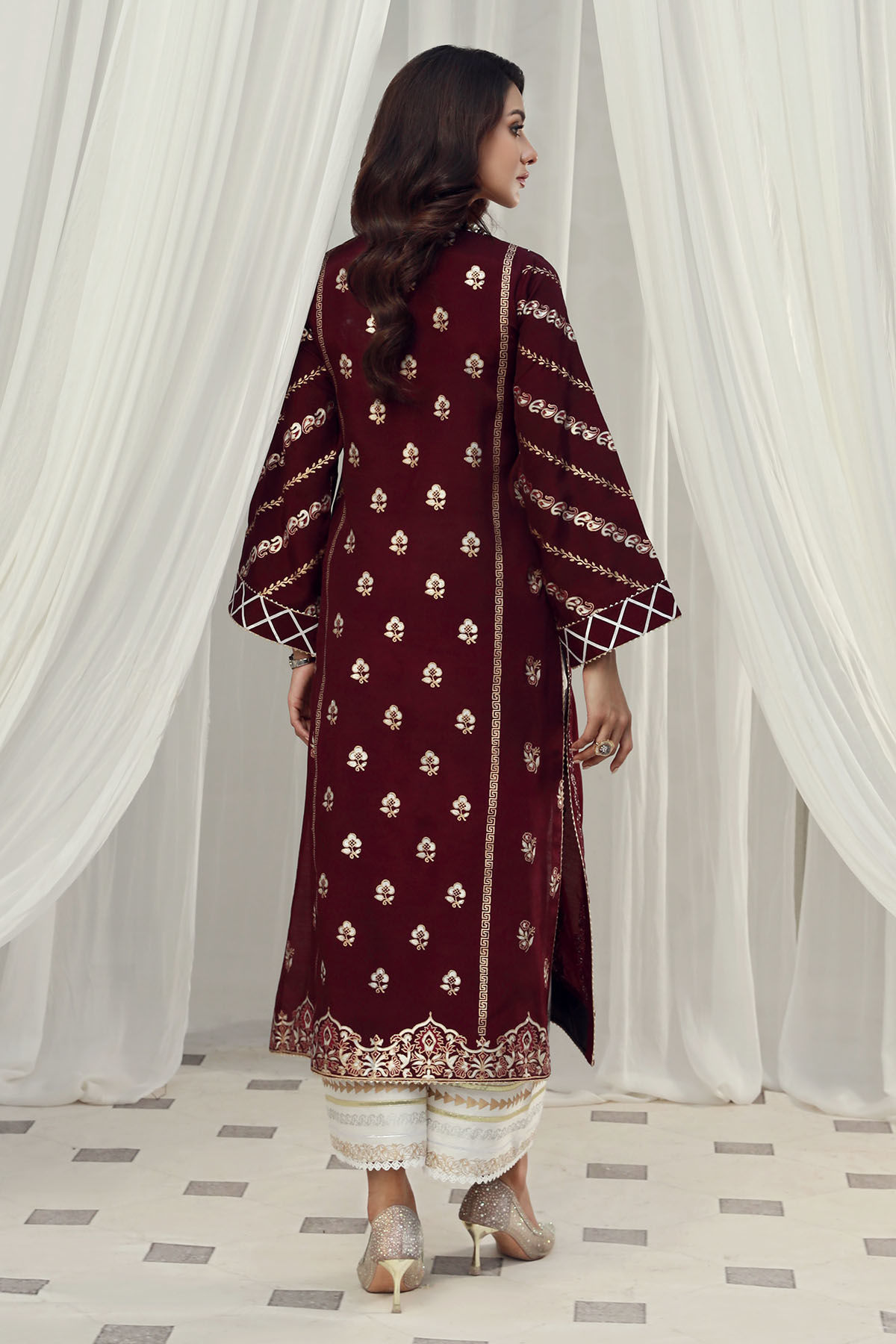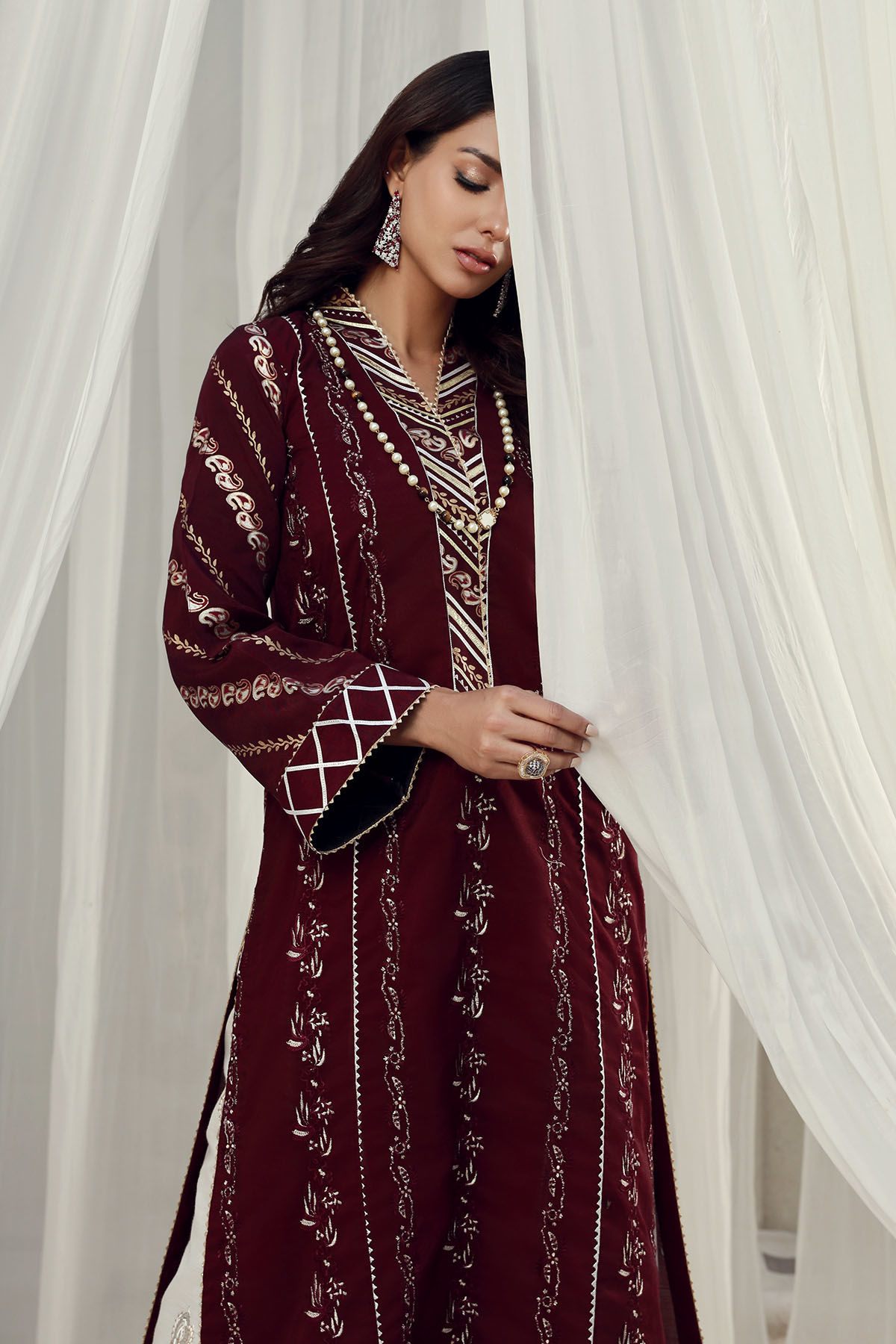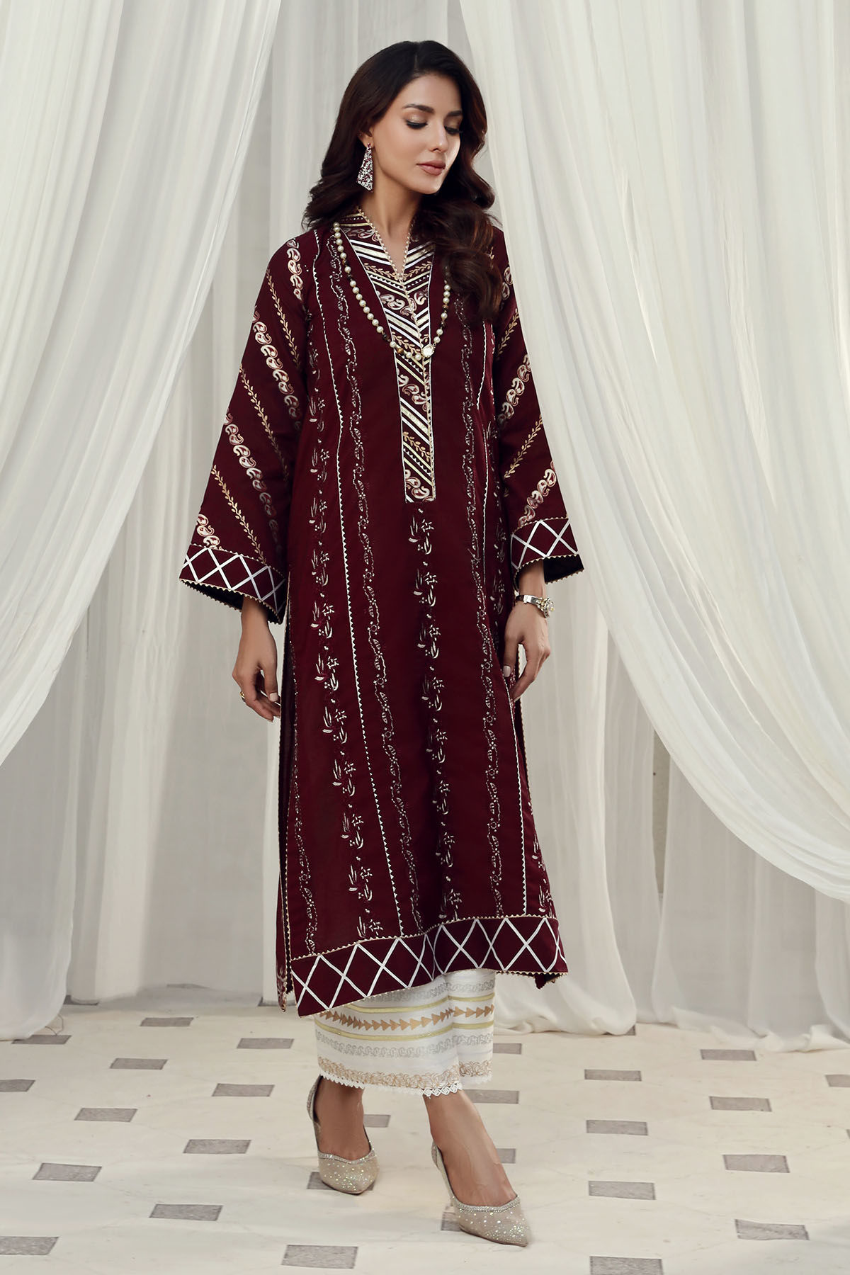 Long silhouette raw silk shirt in deep maroon shade featuring self and zari embroidered details adorned with gota manipulation on sleeves. The sleeves are adorned with block printed details and the shirt can be paired with soneri azaar.