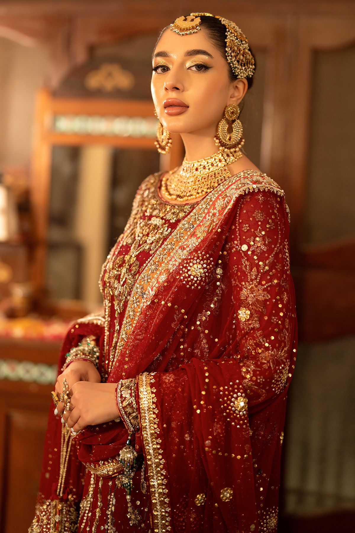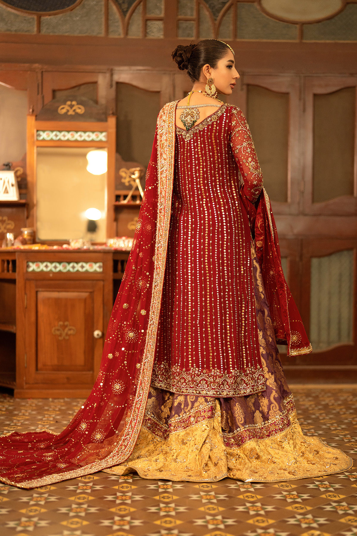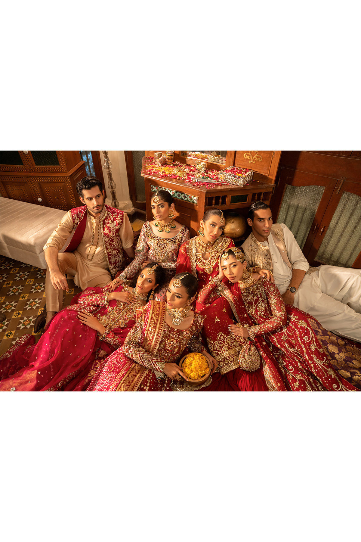 Old school antique zardozi and kaamdani on deep scarlet canvas paired with aubergine and olive farshi dhaka.