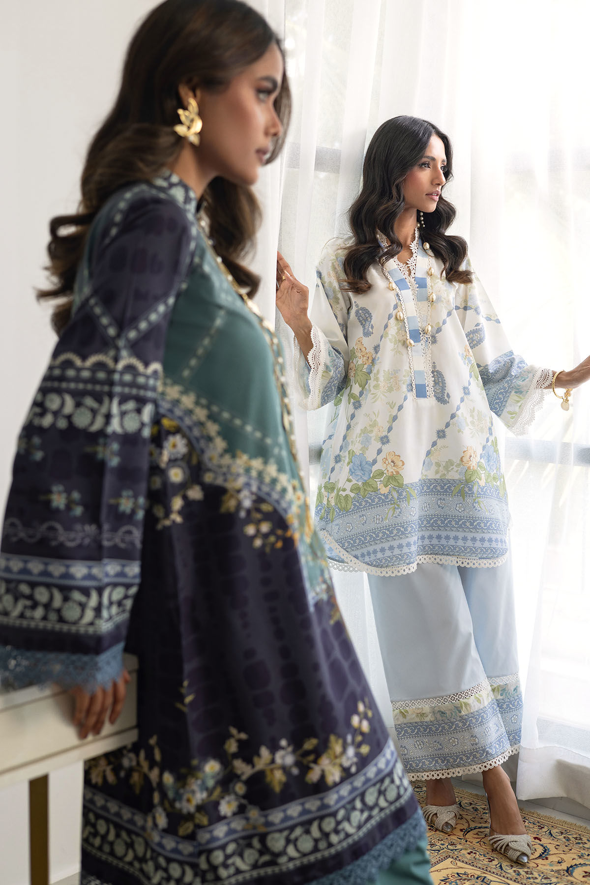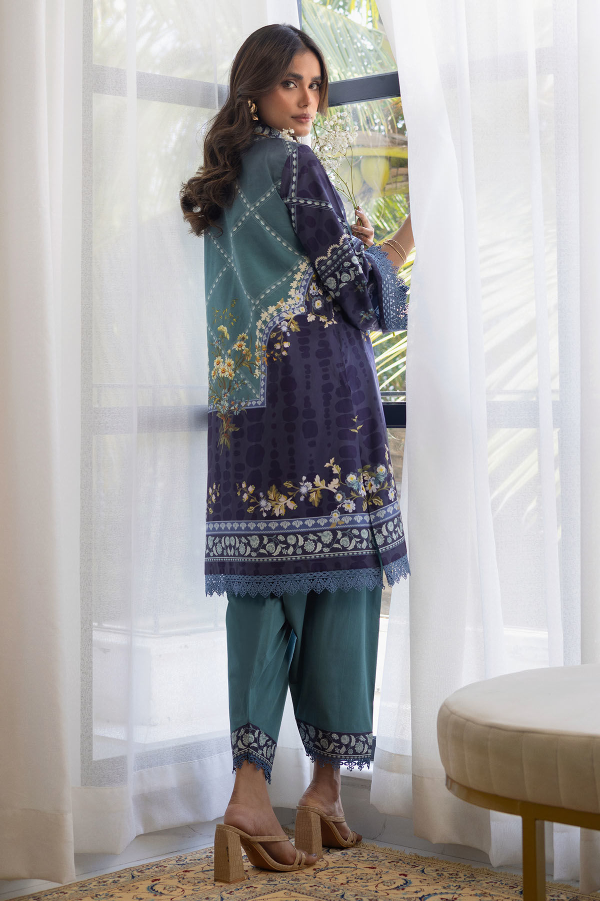 Knee length shirt featuring tie and dye effect in shades of aquamarine and sea blues enhanced with loop and pearls detail on neckline. The hem is enhanced with matching crochet laces and the co-ord set is paired with matching shalwar adorned with printed floral border and crochet laces details.